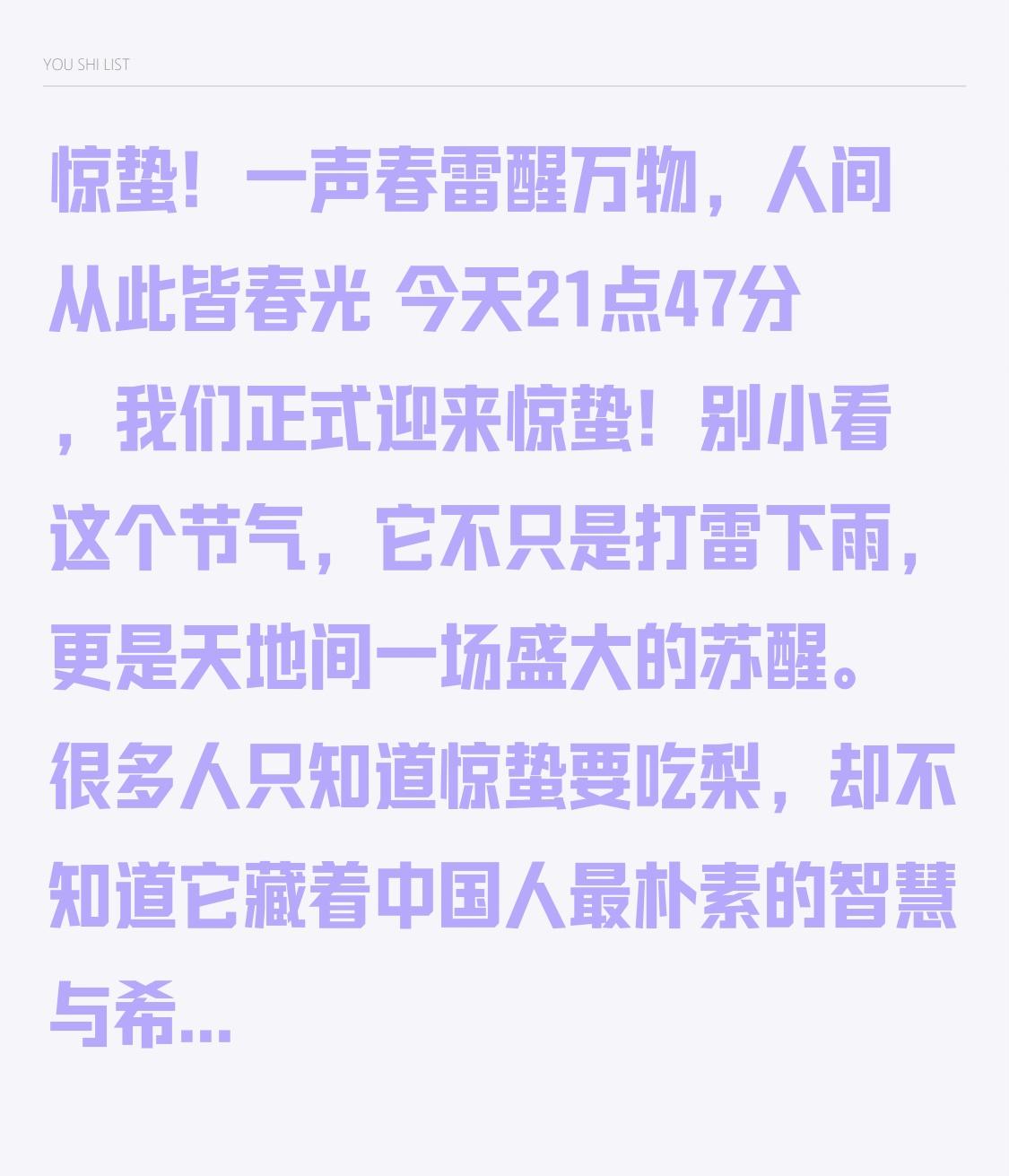 惊蛰!一声春雷醒万物,人间从此皆春光 今天21点47分,我们正式迎来惊蛰!别小看这个节气,它不只是打雷下雨,更是天地间一场盛大的苏醒。很多人只知道惊蛰要吃梨,却不知道它藏着中国人最朴素的智慧与希望,今天这条视频,带你读懂惊蛰的真正寓意。 惊蛰,古称“启蛰”,是二十四节气中最有力量的一个。寒冬蛰伏的虫子被雷声惊醒,泥土里的种子顶开石块,桃花含苞待放,黄鹂鸟开始歌唱,天地间从寂静变得热闹,整个世界都在拼命向上生长。老话说:春雷响,万物长;惊蛰到,耕地忙,田野里到处是春耕的身影,这是一年中最有奔头的时节。 很多人不知道,惊蛰藏着不少老传统。民间讲究惊蛰吃梨,梨谐音“离”,寓意远离病虫、远离灾祸、远离是非;还有地方熏艾草、祭白虎、打小人,都是为了驱赶一整年的霉运,把不顺心的事统统赶走。这些习俗看似简单,却是老百姓对平安健康最真诚的期盼。 惊蛰最动人的,不只是自然的复苏,更是人生的启示。我们每个人,都有过像虫子一样蛰伏的日子:迷茫、疲惫、不被看好、默默坚持。可惊蛰告诉我们:所有的蛰伏,都是为了更好地爆发;所有的沉默,都是在积蓄破土而出的力量。冬天再长,也挡不住春天的到来;困难再大,也压不垮想要向上的心。 春风送暖,草木萌新,惊雷过后,皆是希望。惊蛰到了,愿你赶走所有疲惫与烦恼,像万物一样向阳而生;愿你积蓄已久的努力,在这个春天开花结果;愿你不负春光,不负自己,日子蒸蒸日上,万事皆可期。 春雷已响,万物生长,祝你惊蛰安康,一路生花!