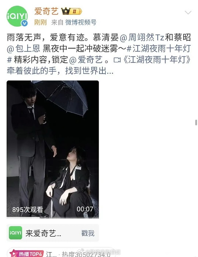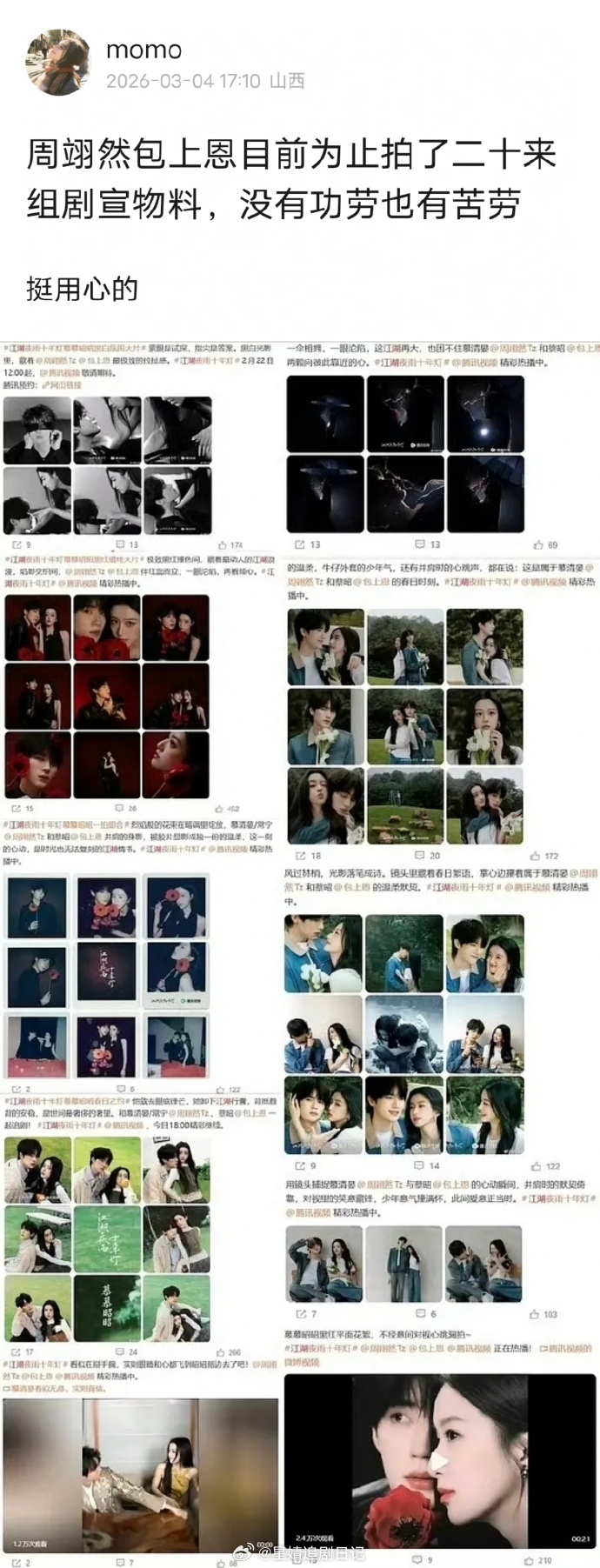 周翊然包上恩目前为止为《江湖夜雨十年灯》拍摄了二十组双人剧宣物料,狠狠努力了。饭