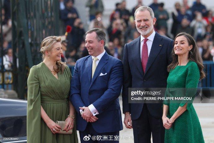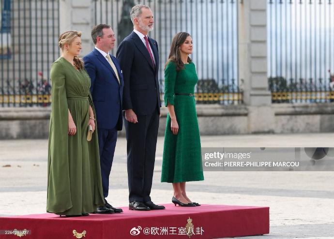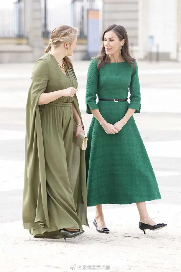之前提到,卢森堡大公纪尧姆和大公夫人斯蒂芬妮今天要去西班牙串门,由于时间的关系已经到达且双方碰头摆拍过一轮了。这访问会过夜,但时差啥的,现在也只能看个日装 斯蒂芬妮和西班牙王后莱蒂齐亚都穿绿色系,理论上应该是约好的。斯蒂芬妮咸菜绿连体裤来自elie saab,还颇为认真戴了大半套黄水晶;莱蒂齐亚绿裙子据说为裁缝定制(所以有剪裁不抹布) 上周发预告时我预测是“精致盘发(斯蒂芬妮)+看不出有发型(莱蒂齐亚)”,看来没翻车 看视频斯蒂芬妮下飞机时还是穿黑色裤装+披发,她tony老师真是快又好