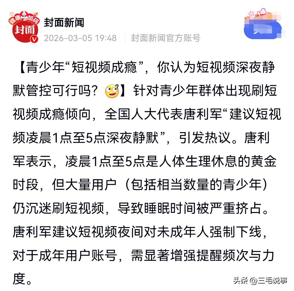 这其实是个非常好的建议,毕竟有什么能比健康更重要的呢? 有代表建议短视频凌晨1点至5点深夜静默。 当然这是针对青少年的。 青少年手机成瘾问题确实相当严重,他们特别喜欢熬夜,有了这个手段能够保证他们的健康。 这个表代表也算是用心良苦了。 当然成年人也不要刷那么晚,熬夜刷视频真的对健康没什么好处。