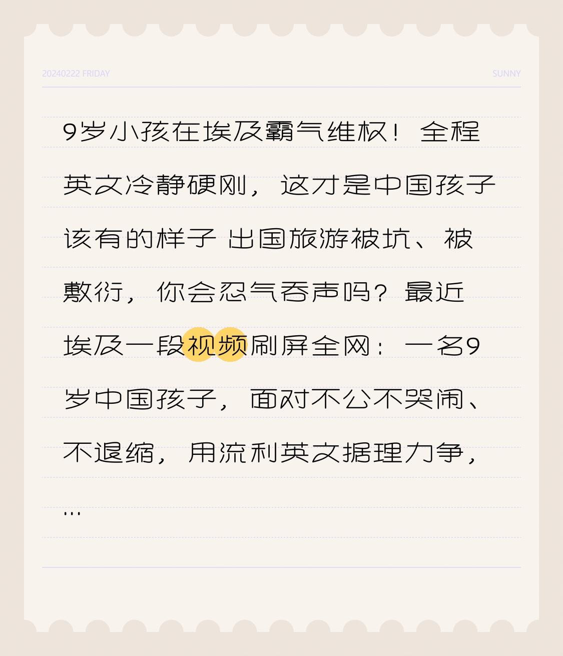 9岁小孩在埃及霸气维权!全程英文冷静硬刚,这才是中国孩子该有的样子 出国旅游被坑、被敷衍,你会忍气吞声吗?最近埃及一段视频刷屏全网:一名9岁中国孩子,面对不公不哭闹、不退缩,用流利英文据理力争,气场全开、逻辑拉满,当场把对方说得哑口无言,最后成功维权!无数网友看完直呼:太给中国人长脸了! 事情发生在埃及景区骑马项目,孩子发现工作人员给的马有安全隐患、护具不全,当场提出换一匹安全的马。可工作人员直接拒绝,还想敷衍了事,觉得小孩子好欺负。换作别的9岁孩子,早就吓得躲到家长身后,可这位“小勇士”完全不慌,立刻开启理性维权模式。 剧情大转折来了! 孩子没有大喊大叫,更没有撒泼耍赖,而是站直身体,用清晰标准的英文,一条一条摆事实、讲安全:“这匹马不安全,我有权换马;如果摔了,是你的责任,我们有录像为证!” 不卑不亢、语气坚定,每一句都说到点子上,全程冷静得不像个孩子。 周围游客纷纷围观,原本强势的工作人员,被孩子的气场和逻辑彻底镇住,最后乖乖同意更换安全马匹,一场境外维权,以孩子完胜收场。更难得的是,孩子全程礼貌克制,只维护权益、不激化矛盾,用最体面的方式,赢得了尊重。 很多大人感慨:我们出国遇到宰客、敷衍,常常怕麻烦选择妥协,可一个9岁孩子,却教会我们什么叫有理有据、不卑不亢。他维护的不只是自己的安全,更是中国游客的底气:我们不惹事,但也绝不怕事;我们懂礼貌,但更守底线。 这才是最好的教育:不是成绩多好,而是身处异国,敢为自己发声;面对不公,能理性捍卫权利。孩子用行动告诉世界:中国孩子自信、勇敢、有教养,中国游客走到哪里,都自带底气与尊严。 看完这个9岁小勇士,你是不是也被圈粉了?不妥协、不懦弱、懂规则、有气场,这才是新时代中国少年的模样!为这位霸气又理性的孩子点赞,也愿我们每个人,都能勇敢维护自己的合法权益!