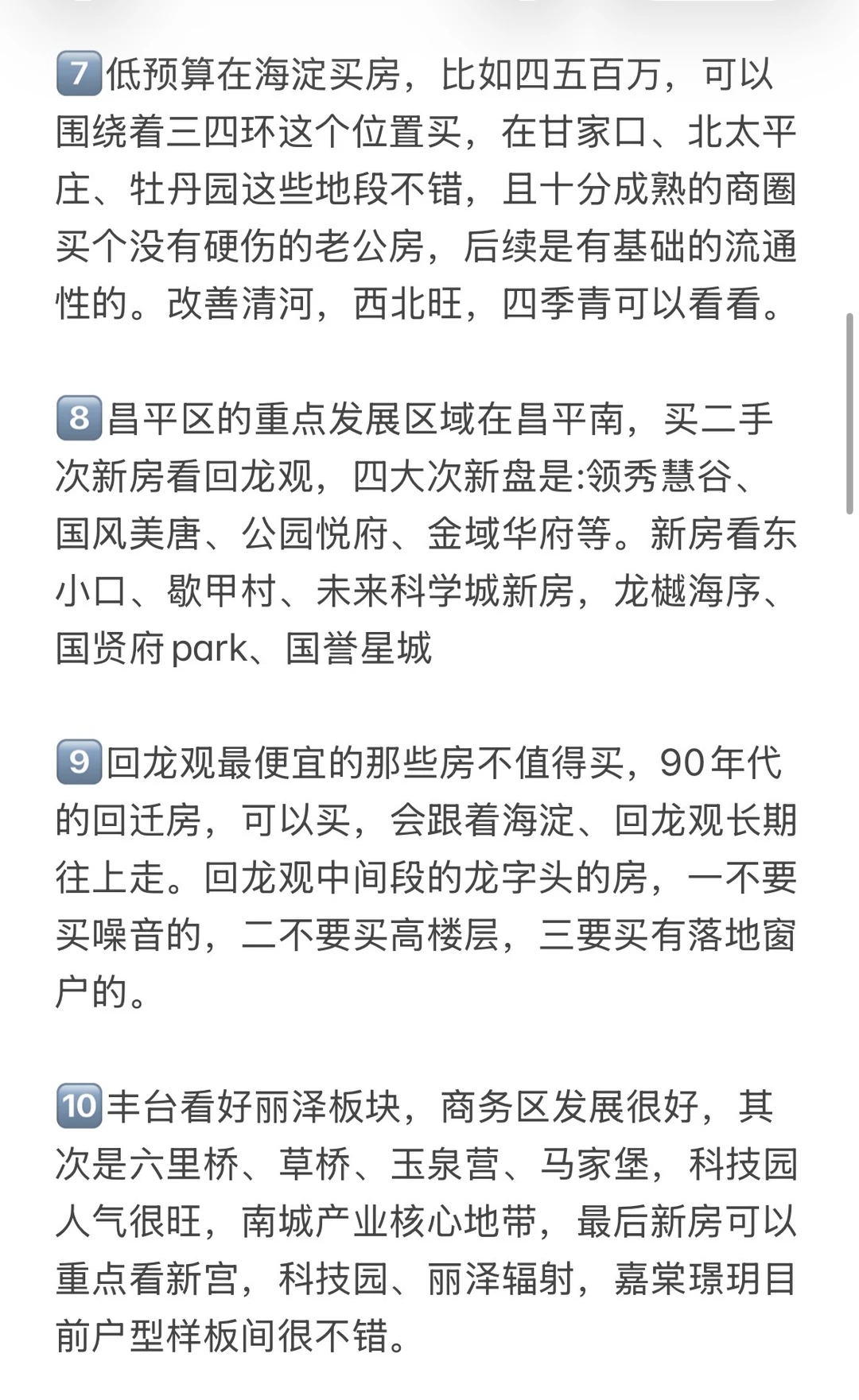 6️⃣朝阳买房双井以南一律不考虑,例如欢乐谷,垡头,潘家园,十里河,北工大,豆各庄常年跑输大盘。老破小回迁扎堆,房子户型差,物业管理差,城市界面也不好,价格不低,没有大型商业配套,保值的能力较差。