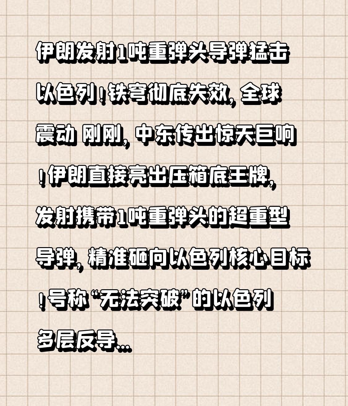 伊朗发射1吨重弹头导弹猛击以色列!铁穹彻底失效,全球震动 刚刚,中东传出惊天巨响!伊朗直接亮出压箱底王牌,发射携带1吨重弹头的超重型导弹,精准砸向以色列核心目标!号称“无法突破”的以色列多层反导系统,在这枚导弹面前形同虚设,全世界都看呆了! 3月5日清晨,伊朗伊斯兰革命卫队正式宣布,在“真实承诺-4”第19轮反击中,动用霍拉姆沙赫尔-4导弹,目标直指特拉维夫市中心、本-古里安国际机场以及机场内的空军基地。这不是普通导弹,而是一枚重达30吨、射程2000公里的“钢铁巨兽”,从伊朗本土发射,仅用7到10分钟就飞抵以色列上空。 最恐怖的是它搭载的1吨级重型弹头,威力相当于40多发重炮齐射,是战斧导弹的2.5倍,能直接击穿20米厚混凝土,机场跑道、地下指挥中心、加固机库,挨上就是毁灭性打击。 所有人都以为,以色列有铁穹、箭-3、大卫投石索组成的七层防御网,肯定能拦住。可关键转折来了! 这枚导弹末端速度高达8到16马赫,还能机动变轨,恰好卡在以色列反导系统的拦截盲区。伊朗官方直接证实:导弹成功突破多重防御,精准命中目标! 以军慌了,拦不住、拦不起、来不及反应!机场跑道被直接炸出巨坑,航班全面停飞,指挥中心瘫痪,这是伊朗对美以连日空袭的最强硬回击。没有虚张声势,没有警告,直接用一吨重的铁拳说话。 这一幕彻底改写中东格局:再强的防空系统,也挡不住真正的高超音速突防;再嚣张的对手,也扛不住同归于尽的决心。伊朗用实战告诉世界:尊严,只在剑锋之上;和平,只在实力范围之内。 我们始终反对战争,心疼战火中的平民。但我们也明白,弱国无外交,落后就要挨打。没有谁天生好战,只是被逼到绝境,只能以战止战。 愿战火早日熄灭,愿中东重归安宁,更愿所有国家都能守住自己的底线与尊严。 这场震撼全球的反击,你怎么看?评论区聊一聊。