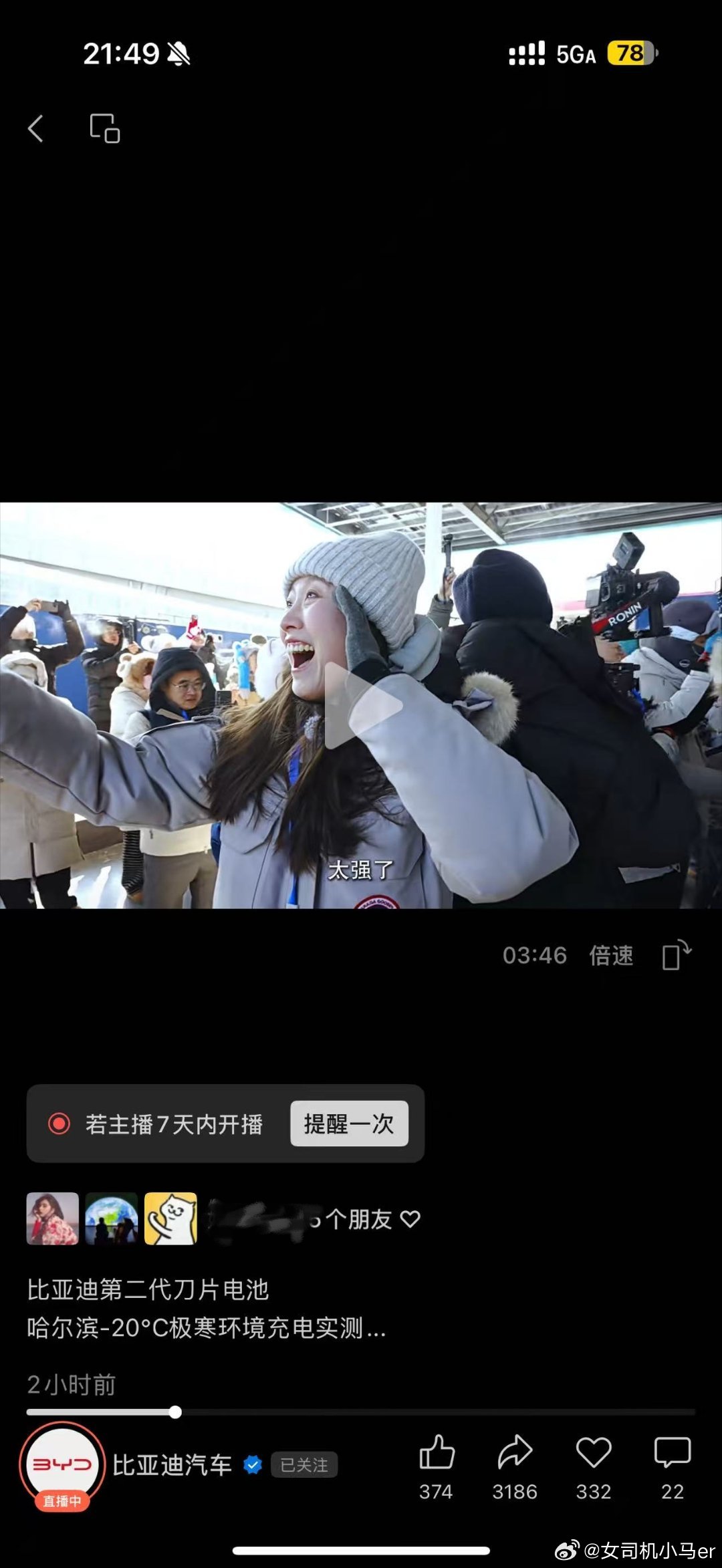 今天上比亚迪电视了电视上我很激动…为啥呢?当天哈尔滨零下20度,我脸都冻透了面对10台车的充电体验,不知道总共要冻多久结果第一台测试车腾势Z9GT 20%-97%只用了11分钟11分钟拍完就可以进屋去取暖了,给谁不激动啊我想未来在东北使用到第二代闪充的车友一定会感受到同样的快乐!腾势Z9GT充电9分钟续航超千公里