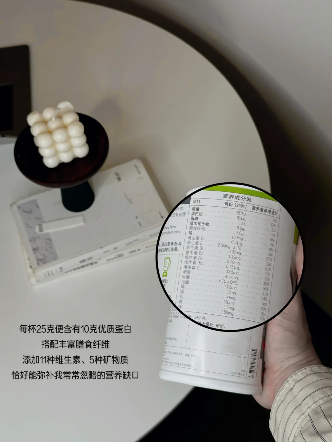 更难得的是它扎实的营养配比,25克便含有10克优质蛋白,搭配丰富膳食纤维,饱腹感十足,足以稳稳支撑到午餐,不必再因中途饥饿而分心;特别添加11种维生素、5种矿物质,恰好能弥补我常常忽略的营养缺口,助力每日膳食均衡。