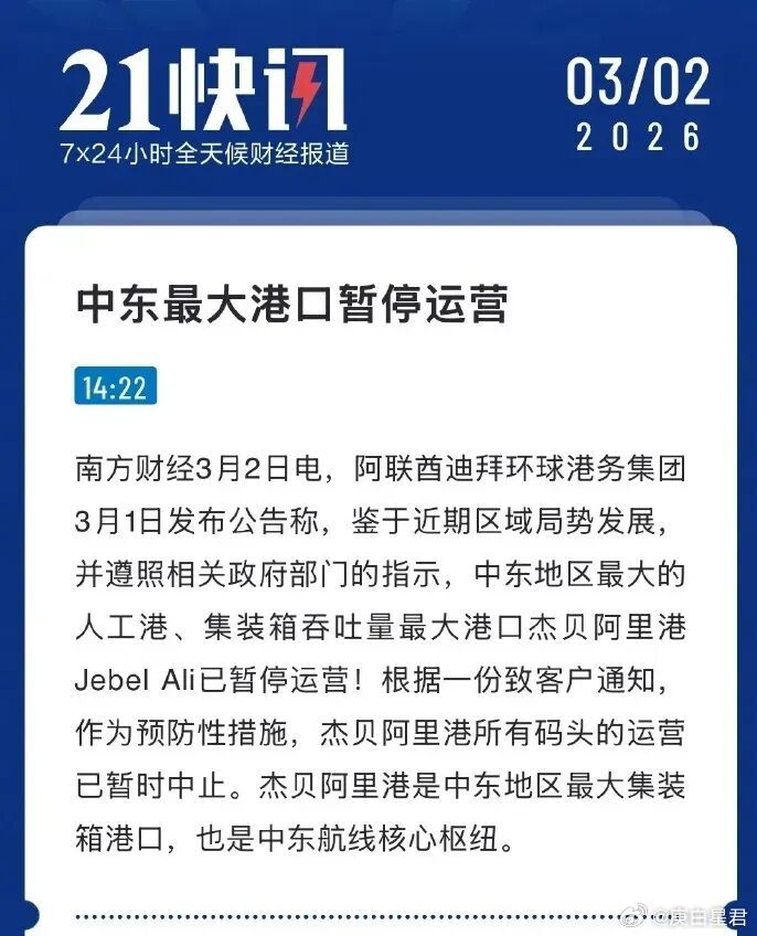 物流断裂,大动脉失守如果说数据中心是神经系统,那港口和机场,就是血管。而这一次,中东的血管,也开始收缩。3月1日,中东最大的集装箱港口之一杰贝阿里港宣布暂停运营。