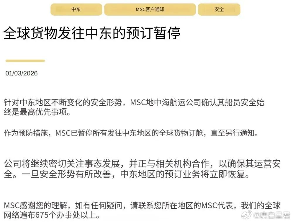 MSC宣布暂停接受全球至中东的新订舱;马士基暂停船只通过霍尔木兹海峡,改道好望角;达飞轮船征收紧急冲突附加费。这每一个动作,都是成本的叠加。