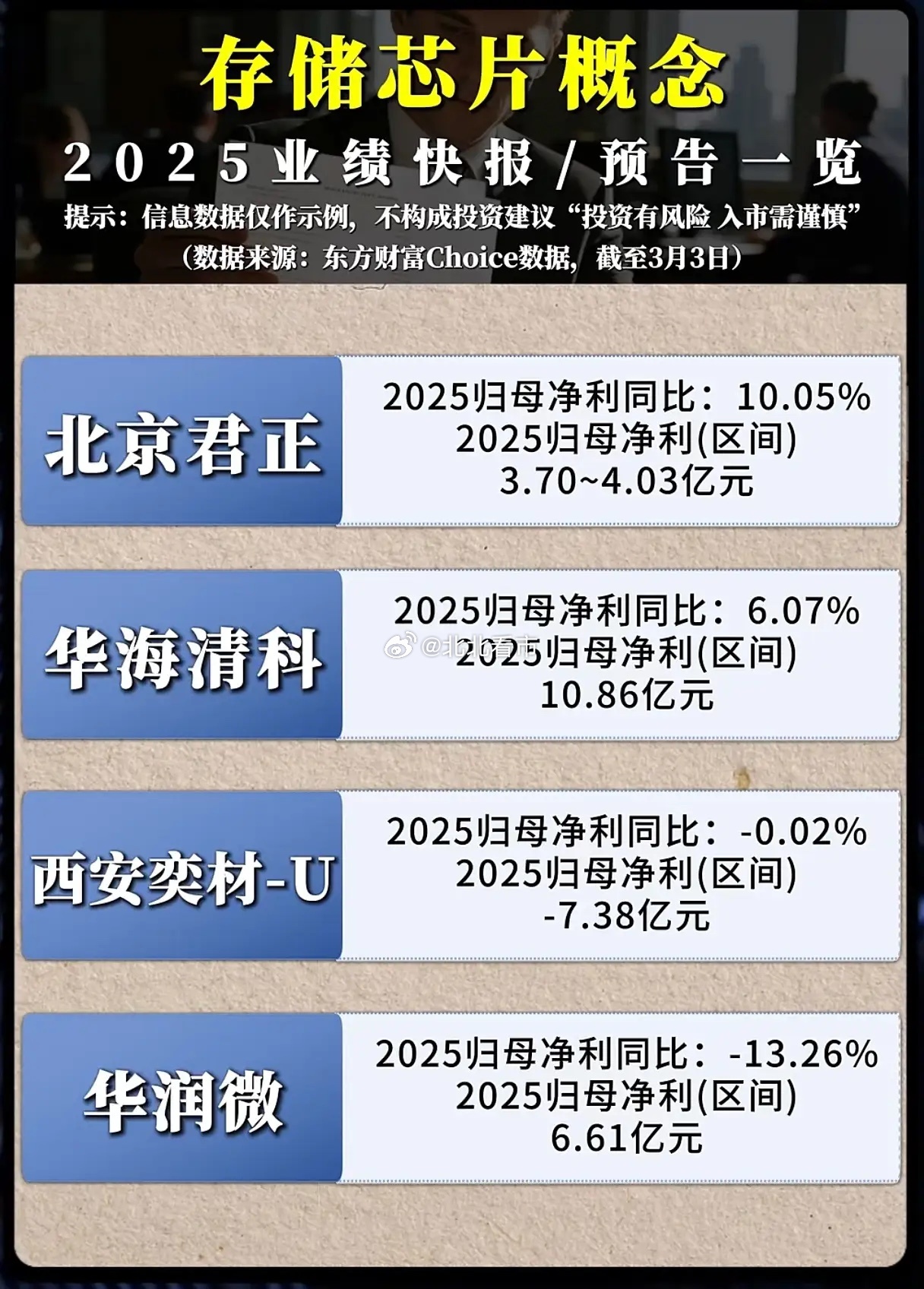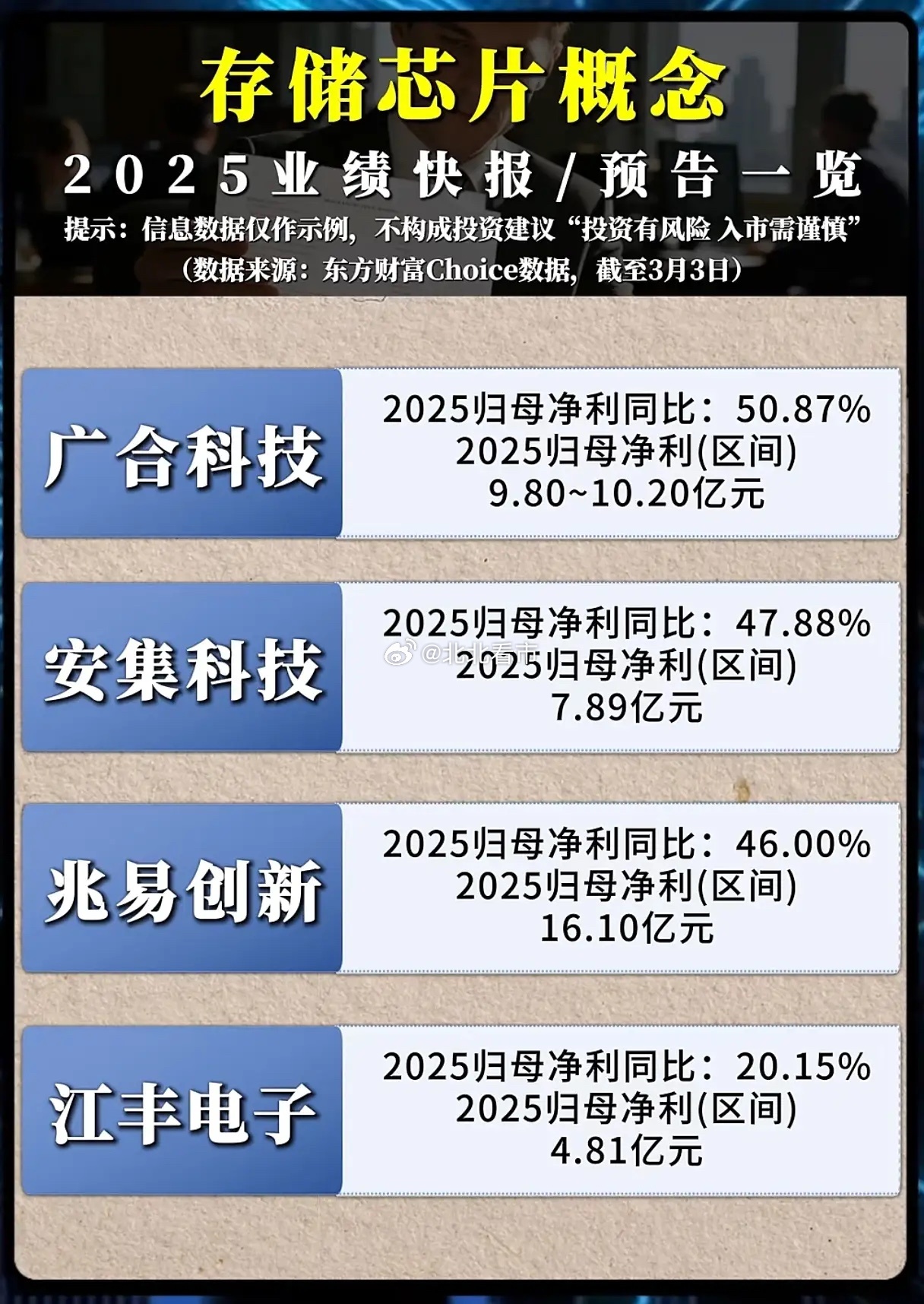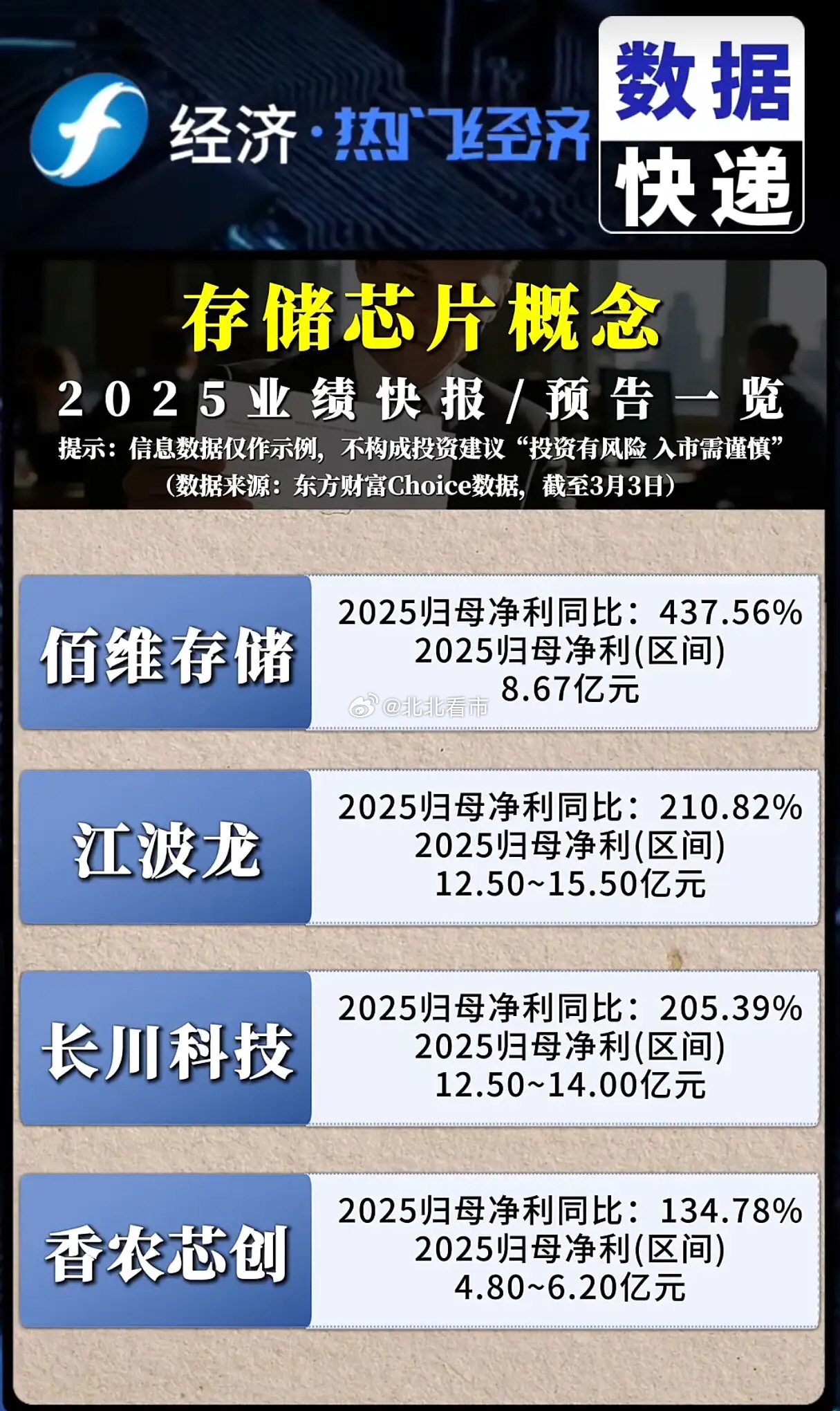 存储芯片:谁在引爆万亿市场的超级周期?当佰维存储以437.56%的净利润增速一骑绝尘,当江波龙、长川科技的业绩翻倍增长,当澜起科技以22.36亿净利润领跑行业,我们不禁要问:存储芯片行业,究竟在经历一场怎样的历史性变革?这不是简单的业绩反弹,而是AI算力革命与国产替代浪潮双重驱动下的产业重生。2025年,存储芯片行业彻底告别了过去的低谷,迎来了由AI数据中心、智能汽车和消费电子共同点燃的需求爆发。AI大模型训练与推理对高带宽内存(HBM)的需求激增,2025年HBM需求量同比增长130%,而单台AI服务器的内存需求更是达到传统服务器的8倍以上。这种爆发式增长,直接导致了全球存储芯片市场出现过去15年来最严重的供应短缺,DRAM、NAND、HBM三大品类的供需缺口分别达4.9%、4.2%、5.1%。在这场供需重构中,国内企业展现出惊人的成长韧性。佰维存储紧紧把握行业上行机遇,大力拓展全球头部客户,2025年营收同比增长68.72%,净利润更是达到8.67亿元;德明利则实现了营收破百亿的历史性突破,扣非归母净利润同比增长120.77%。这些亮眼的业绩背后,是国产存储厂商在技术上的持续突破:长鑫存储发布的新一代DDR5产品,最高速率达8000Mbps,性能跻身全球第一梯队;长江存储在3D NAND技术上的突破,更是将中韩存储技术差距缩至不足一年。当然,行业并非一片坦途。部分企业如复旦微电、沪硅产业仍面临业绩下滑的压力,这恰恰说明,在技术迭代加速的今天,只有真正掌握核心技术、深度绑定AI与算力需求的企业,才能在超级周期中乘风破浪。展望未来,存储芯片的超级周期才刚刚开启。随着HBM4在2026年进入放量阶段,单堆栈带宽将突破2TB/s,单价较HBM3E提升50%以上;而NAND Flash在可预见的扩产有限及AI需求爆发的影响下,价格将维持高涨态势。对于投资者而言,这不仅是一次业绩兑现的盛宴,更是一场关乎未来科技格局的战略抉择。