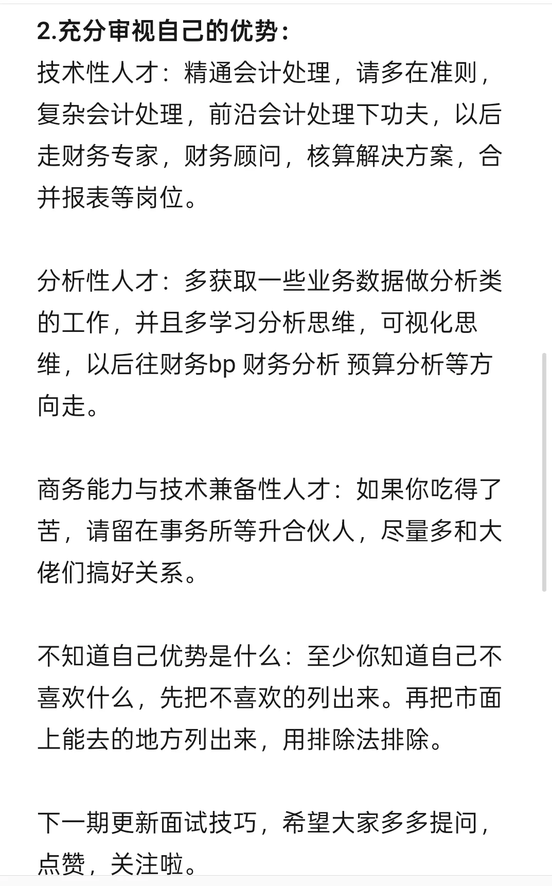 技术性人才:精通会计处理,请多在准则,复杂会计处理,前沿会计处理下功夫,以后走财务专家,财务顾问,核算解决方案,合并报表等岗位。