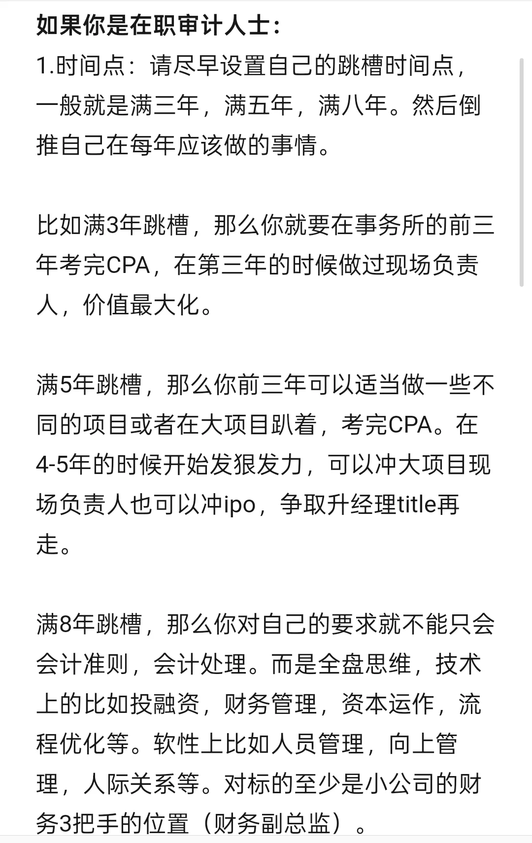 比如满3年跳槽,那么你就要在事务所的前三年考完CPA,在第三年的时候做过现场负责人,价值最大化。