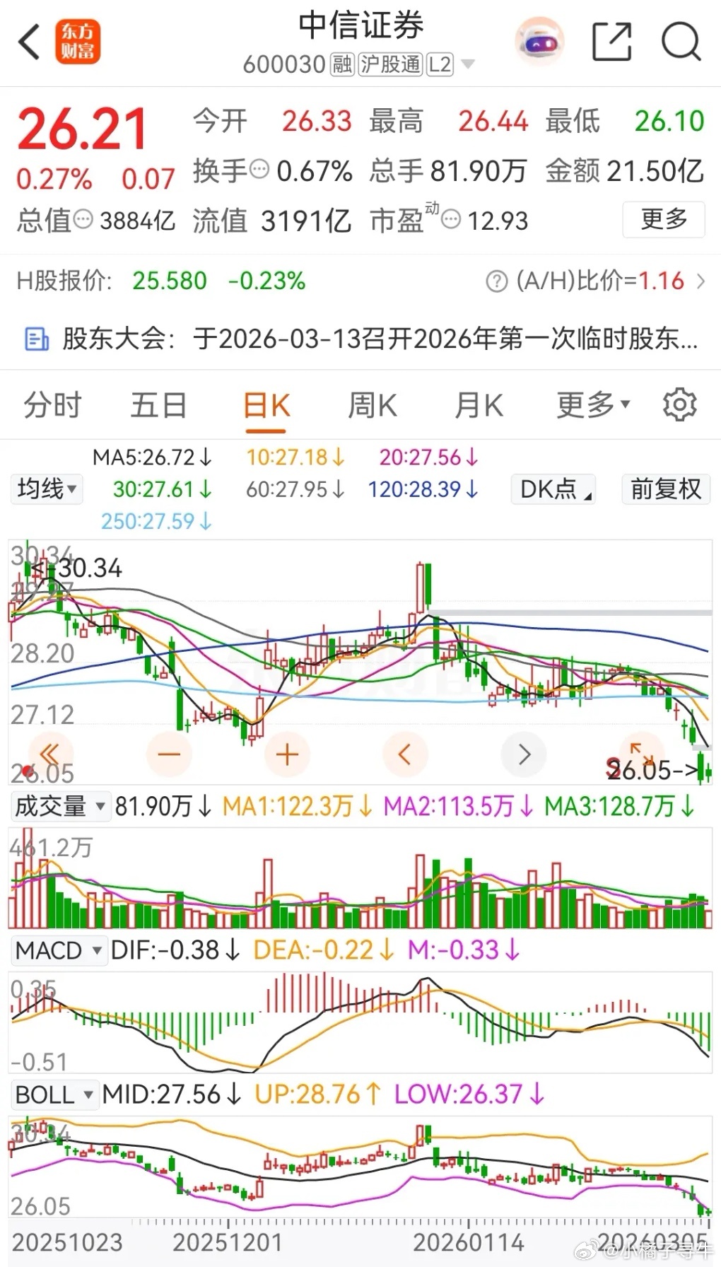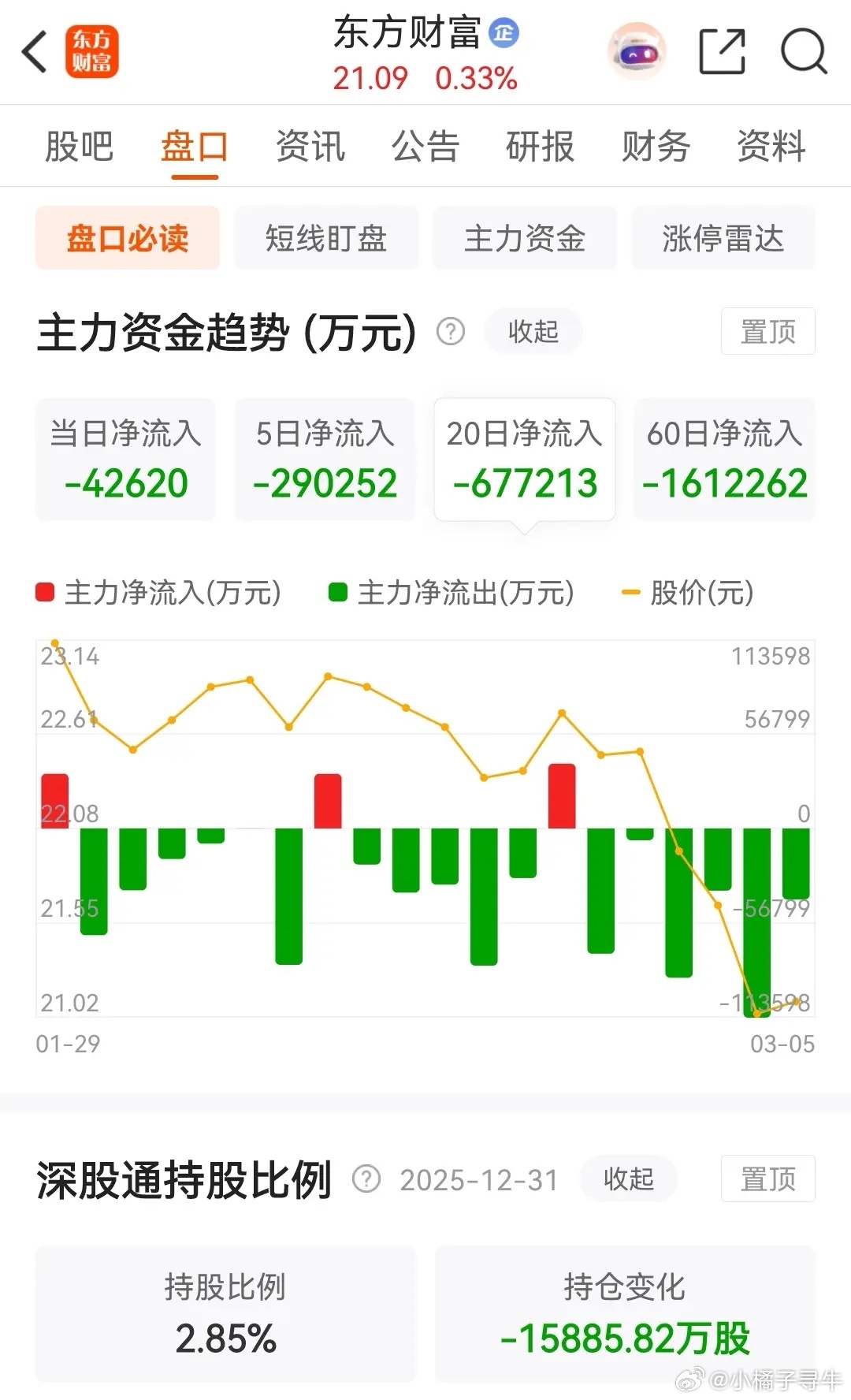 东方财富今天小高开后震荡整理,下午回落后收出了一根假阴线,收盘时的涨幅为0.33%,报价为21.09元。在资金流向上,今天被主力资金净卖出了4.2620亿元,近五个交易日则是被主力资金累计净卖出了29.0252亿元 ;在近20个交易日里仅有四天净买入,其余16天都是在净卖出。截止今天收盘,东方财富在2026年的累计跌幅为9.02%。从走势上看,目前依然处于破位下行态势之中。