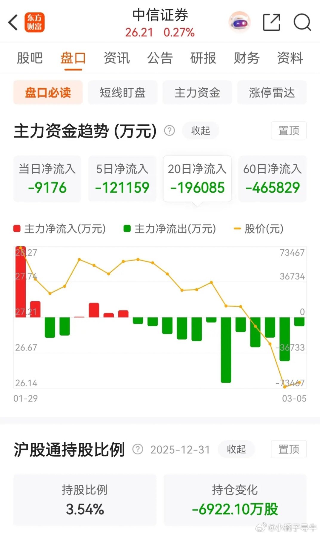 东方财富和中信证券终于止跌了,早盘高开后窄幅整理,最终以假阴报收,目前中信证券已经连续12天被主力资金净卖出,而东方财富则是连续六天被主力资金抛售,券茅和券商一哥,可谓是一对难兄难弟。