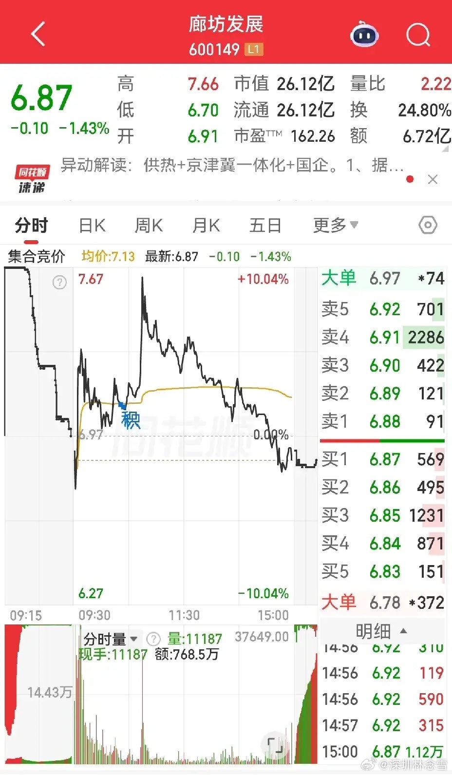 昨天聊廊坊发展尾盘偷袭涨停,这种拉升基本就是短期诱多、准备出货。今天早盘两波冲高涨近涨停,随后一路回落,完美完成派发。