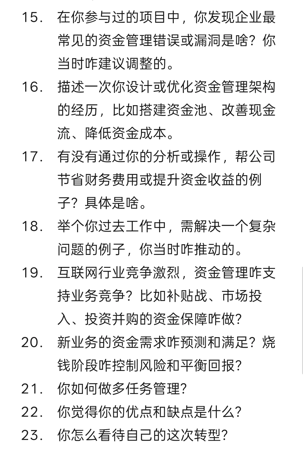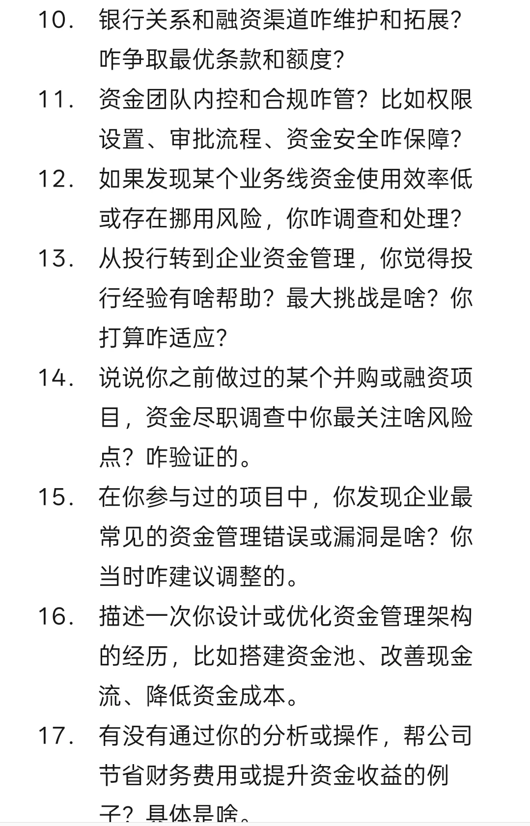 13. 从投行转到企业资金管理,你觉得投行经验有啥帮助?最大挑战是啥?你打算咋适应?