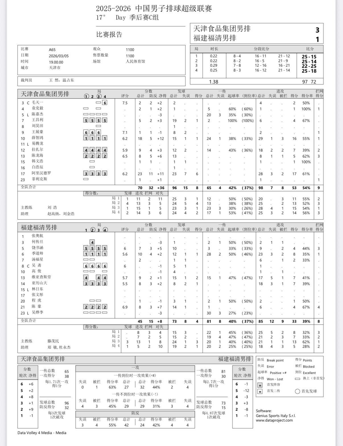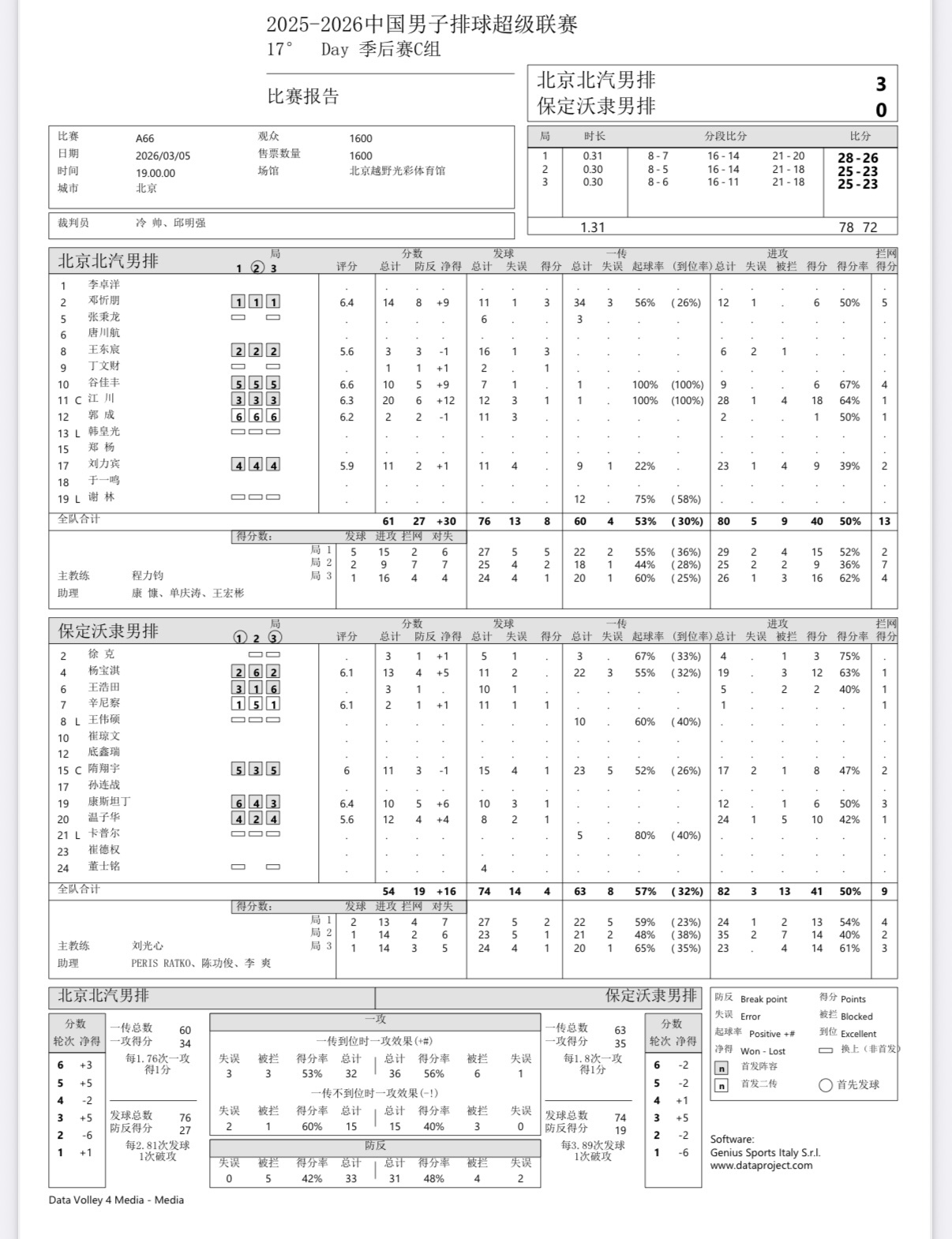 2025-2026中国男排超级联赛 男排联赛第二阶段第17轮四场球数据统计:▲ 北京男排3-0河北保定男排江川20分(28扣18中1失误4被拦,1拦1发)温子华12分(24扣10中1失误5被拦,1拦1发)