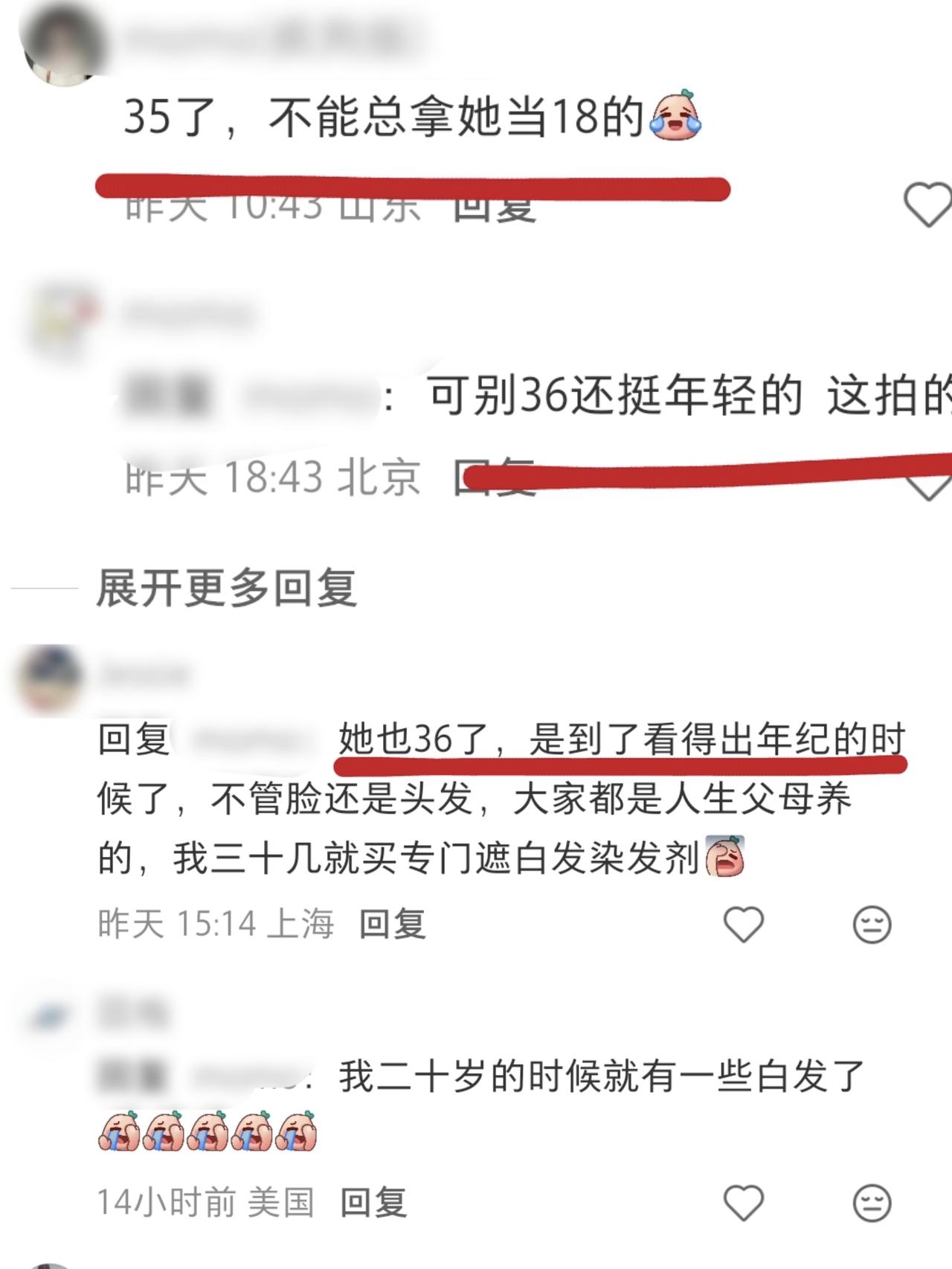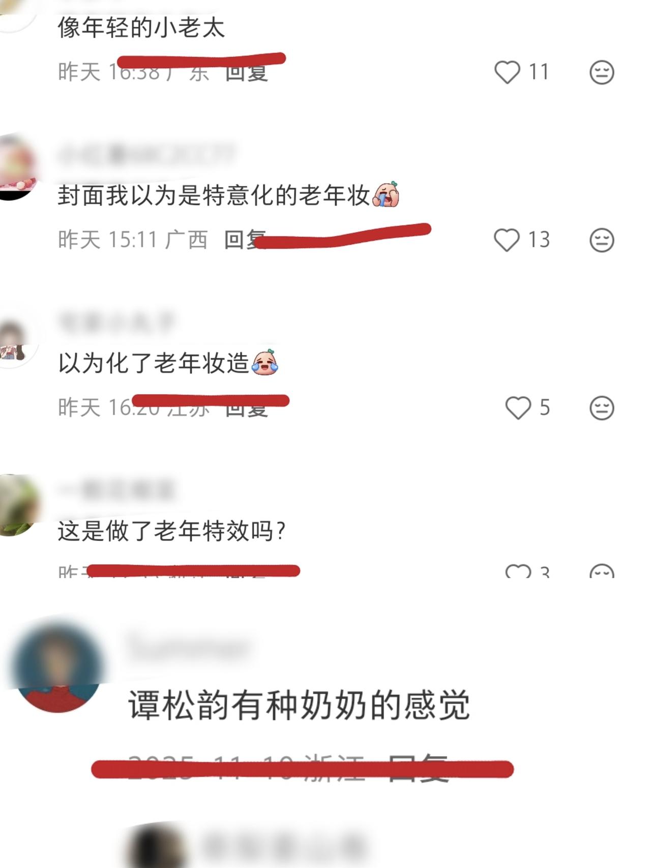 36岁谭松韵发色翻车,被吐槽显年龄像56岁,疑似老年特效 在综艺《爱上这座城》中,水哥陪同谭松韵,一起走进老家泸州,谭松韵穿着紫色针织开衫,白色休闲裤,扎着丸子头,喝酒聊天,全程非常松弛 可评论区却都在讨论谭松韵的状态,吐槽谭松韵节目中有些显老,忽然年龄感就上来了,还以为是加了老年特效呢,没了滤镜36岁像56岁小老太 节目中谭松韵的银灰色发色像是漂白了一样,加上镜头角度刁钻,以及当天的妆造确实有些显老 可能大家对于谭松韵的印象还停留在演《以家人之名》的李尖尖时代,但是现在无论再怎么显小,也不会像十七八岁了 就连谭松韵都勇于面对央视镜头的审核了,不愿成长的也许一直是我们自己