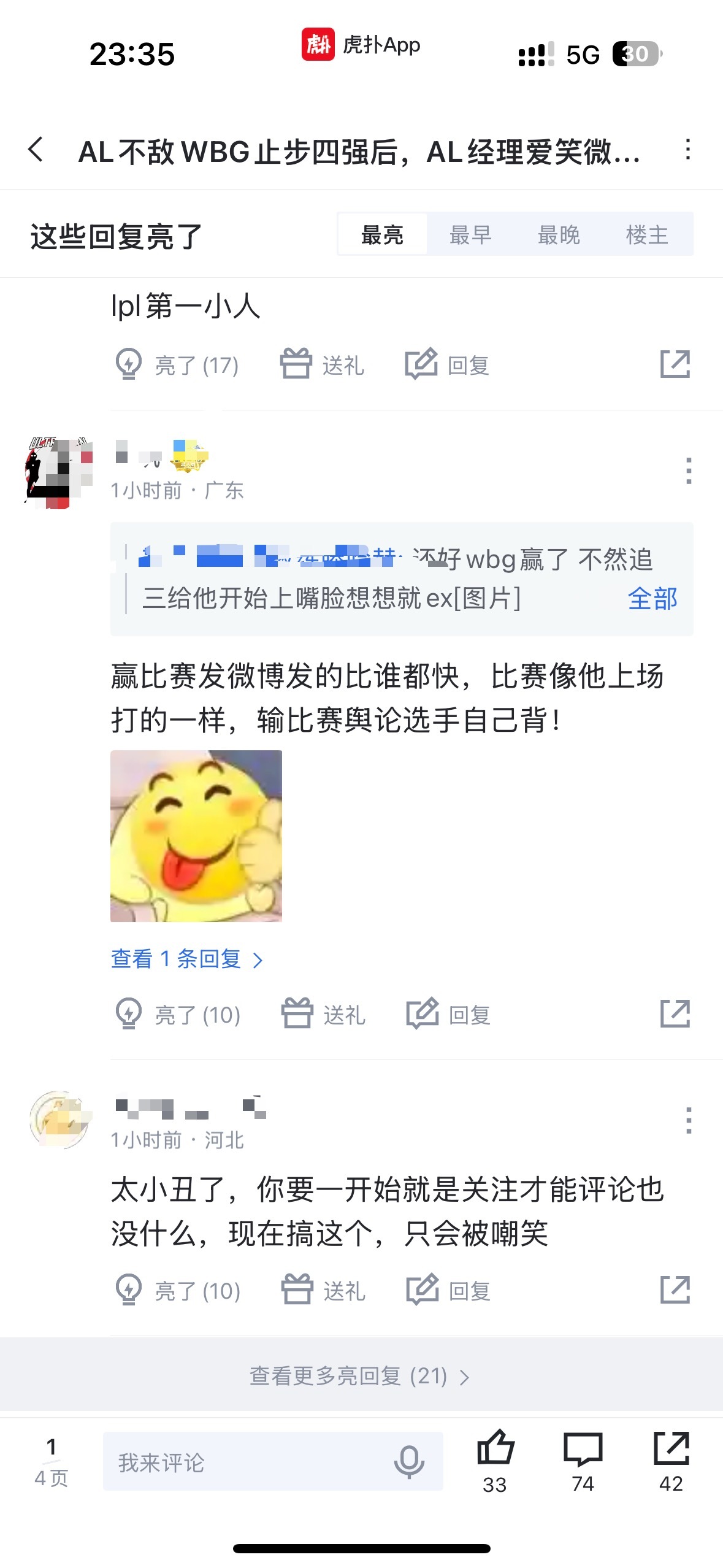 AL不敌WBG止步四强后,AL经理爱笑微博开启关注才能评论网友热评:1.还好wbg赢了 不然追三给他开始上嘴脸想想就ex2.你要是一开始就要关注才能评论也没什么,现在搞这个只会被嘲笑wbg战胜al2026lpl第一赛段英雄联盟