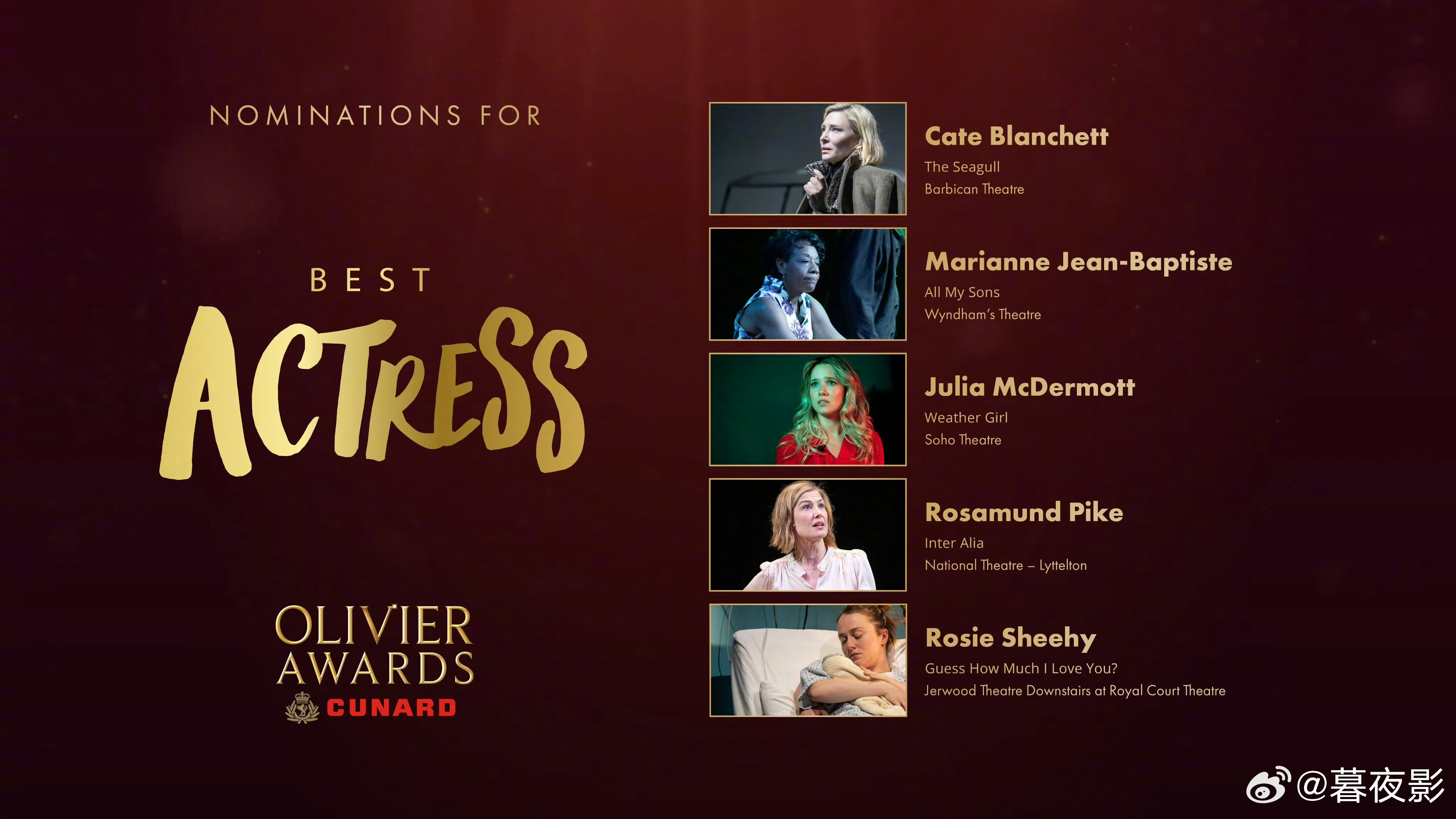 第50届奥利弗奖公布提名名单,“大魔王”凯特·布兰切特 (《海鸥》)、玛丽安娜·琼-巴普蒂斯特(《都是我的儿子》)、朱莉娅·麦狄蒙(《气象女孩》)、裴淳华 (《非穷尽列举》)、罗茜·雪希(《猜猜我有多爱你?》)入围话剧类最佳女主角奖!!本届颁奖典礼将于4月12日举行!!凯特布兰切特