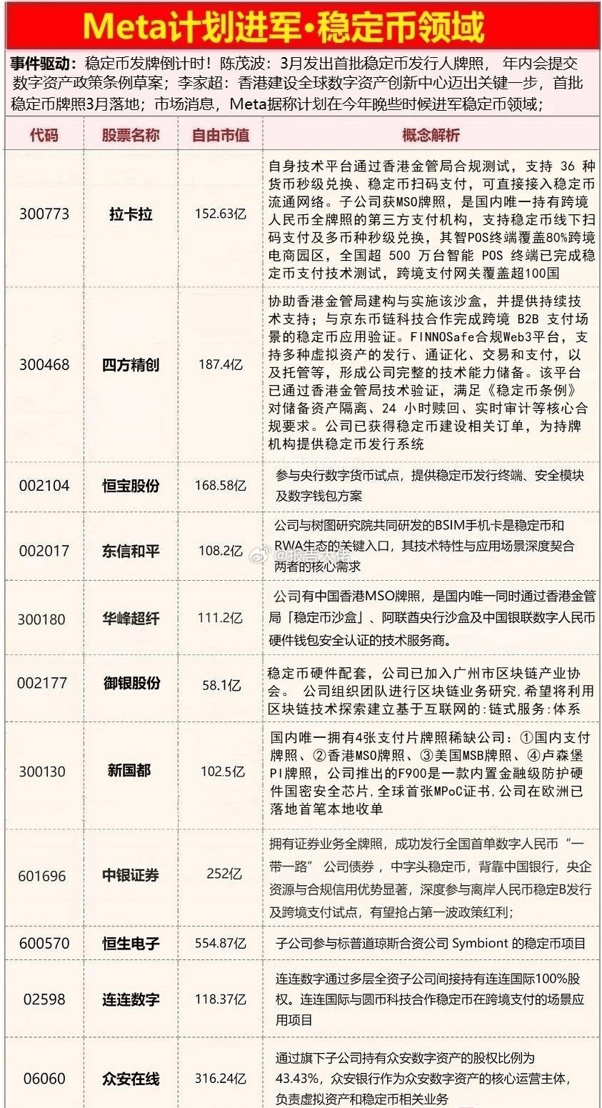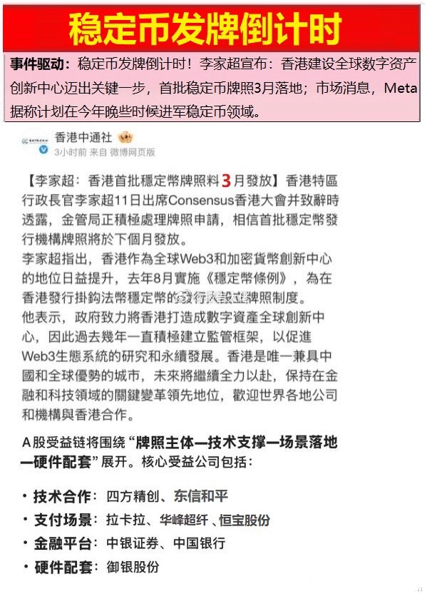 ⑤稳定币-稳定币发牌倒计时!陈茂波:3月发出首批稳定币发行人牌照,年内会提交数字资产政策条例草案;李家超:首批稳定币牌照3月落地;Meta计划今年进军稳定币领域;(拉卡拉、四方精创、恒宝股份、东信和平、御银股份等)
