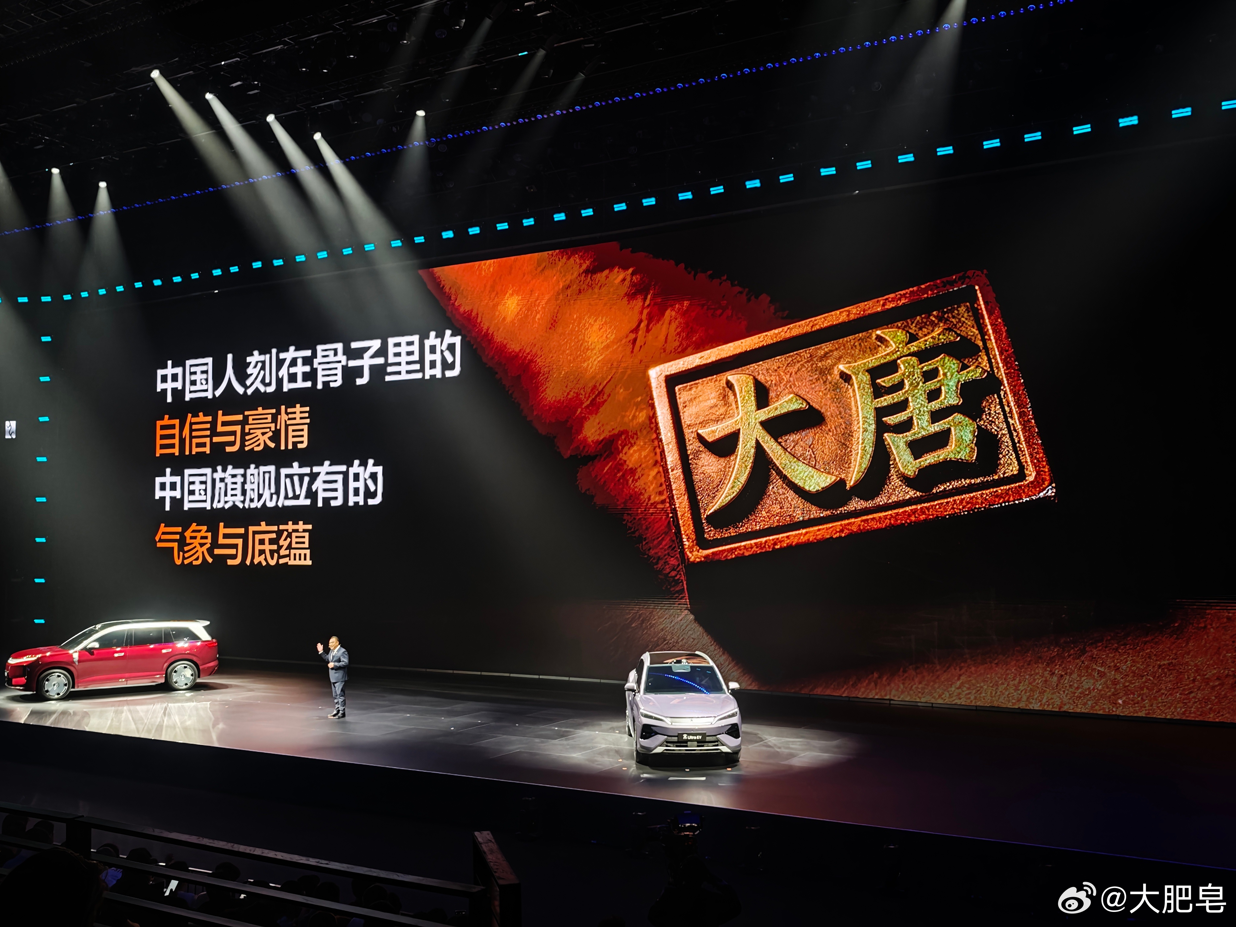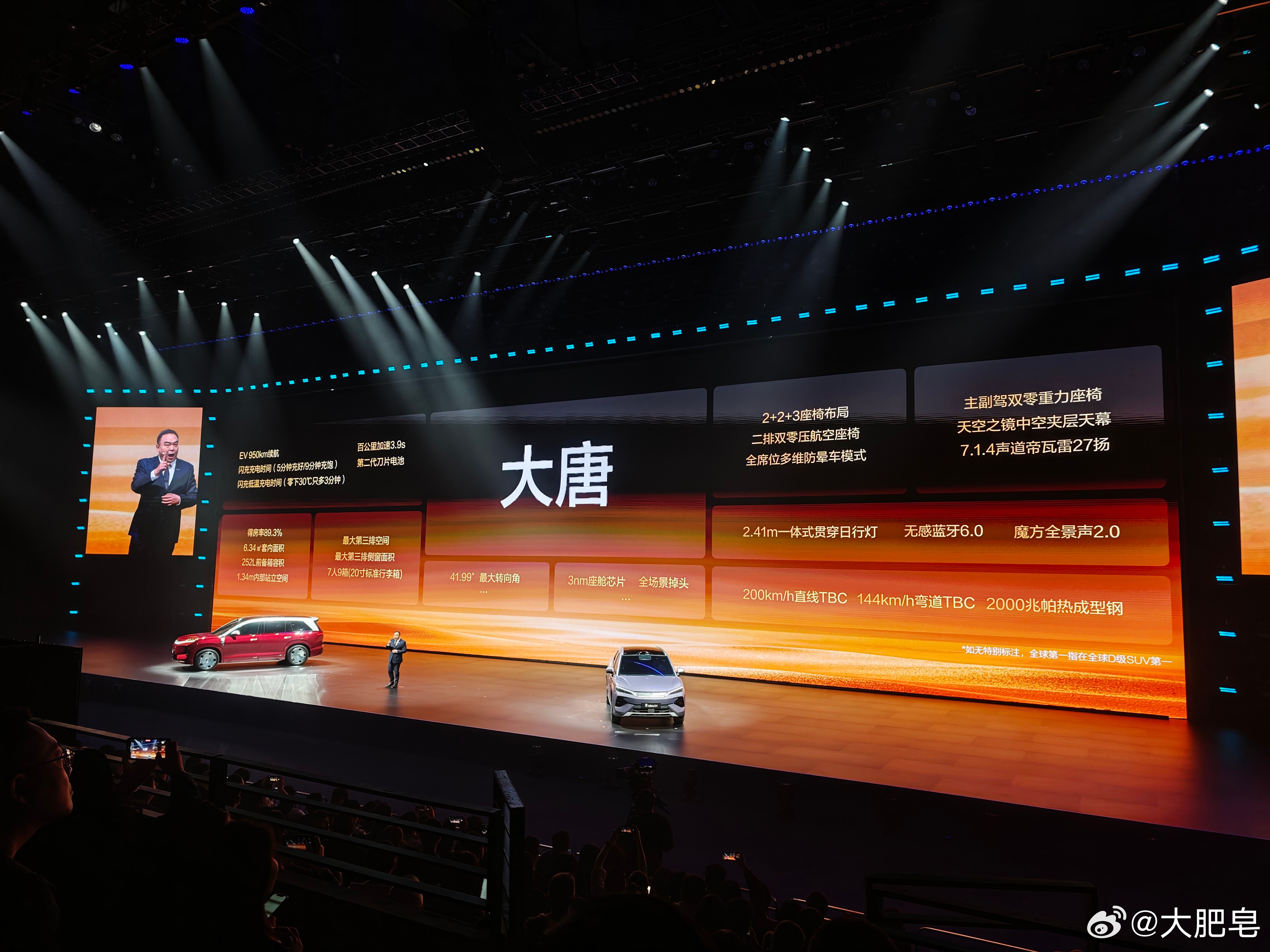 比亚迪大唐发布!真够大的!同样是大饼轮毂,这个也是超大型豪华D级SUV的标准了。同样的第二代刀片电池,比亚迪闪充技术,实现950km续航里程,支持后轮转向,最小转弯半径5.2米,支持双腔空悬……给足了。价格还没出……比亚迪发布会比亚迪第二代刀片电池比亚迪今晚发布二代刀片及闪充