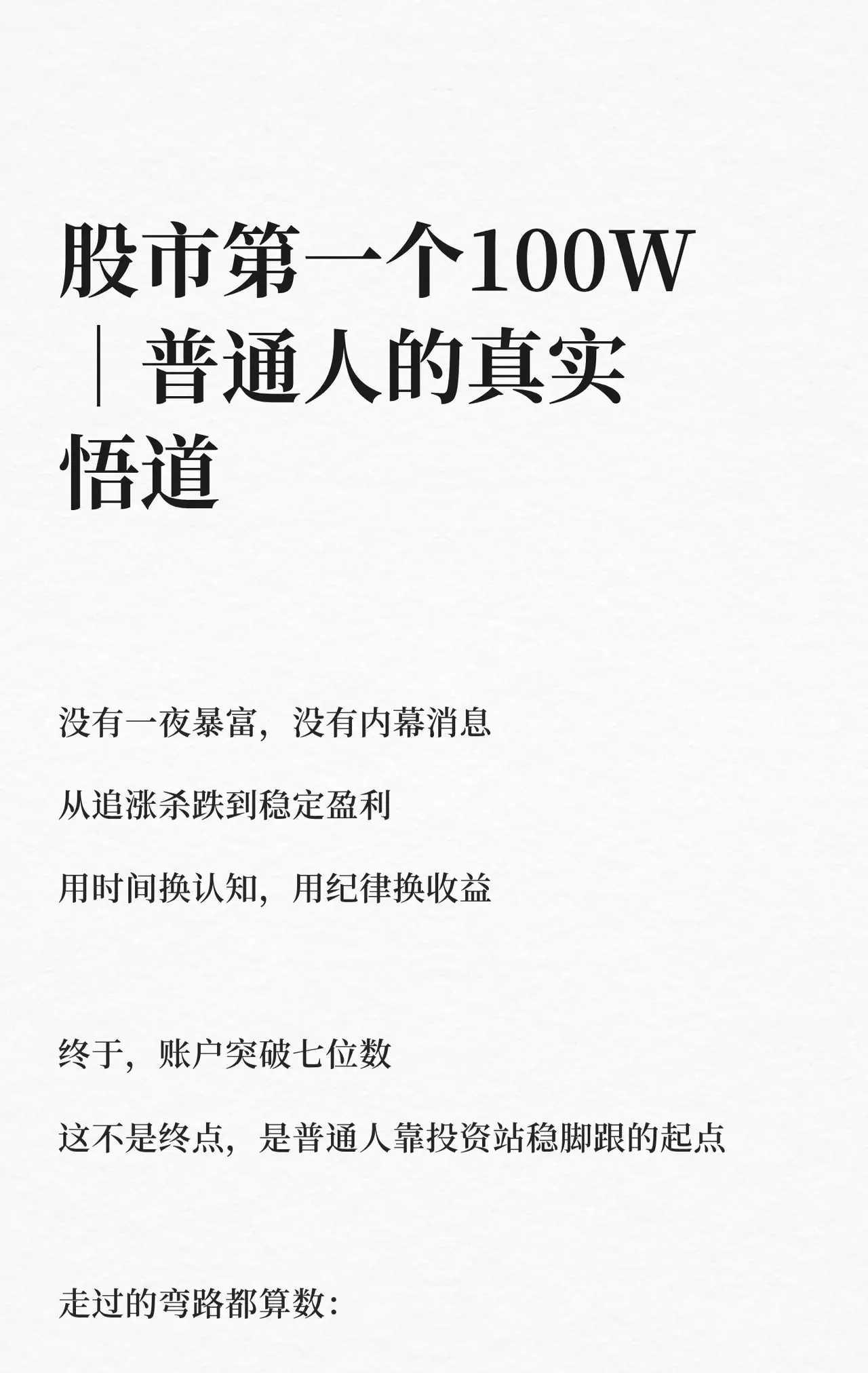 这是一位普通投资者分享的在股市中积累第一个100万(七位数账户)的真实投资悟道经历与心得,核心要点如下: