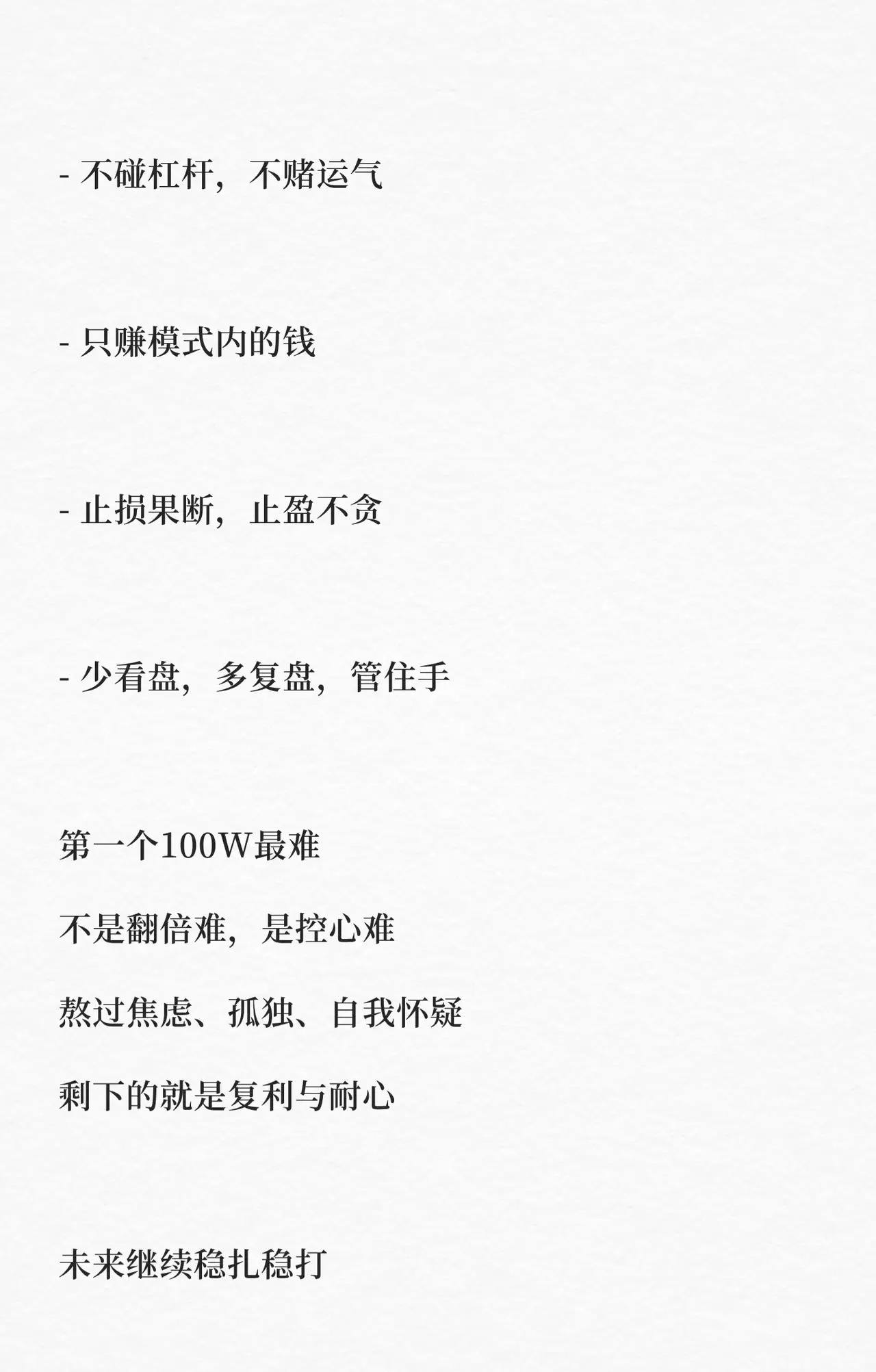 整体来看,这是普通人靠“认知积累+纪律执行+心理磨炼”实现的投资成长,强调“稳扎稳打、长期主义”,认为第一个100万是“站稳脚跟的起点”,未来继续在理性、克制的节奏中复利前行。