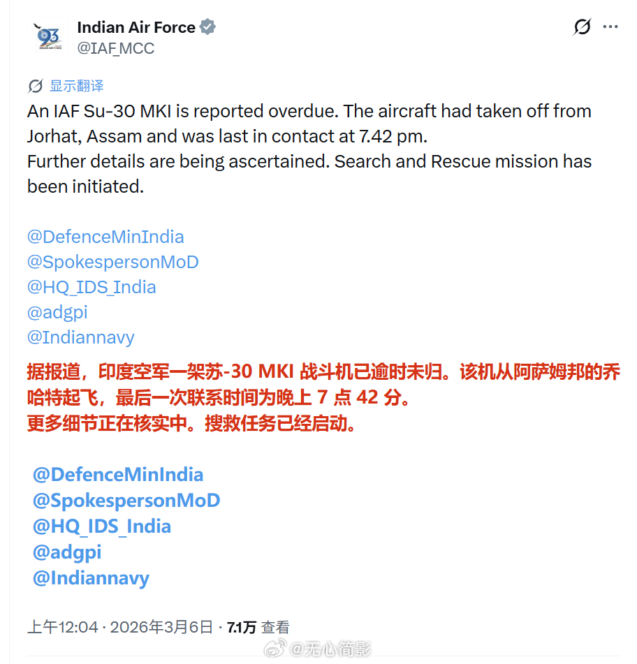 突发,印度一架SU-30 战斗机在阿萨姆邦上空失踪;据印度媒体报道,印度空军已展
