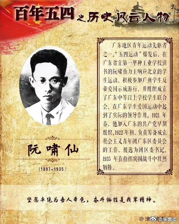 我们深切缅怀阮啸仙革命烈士牺牲90周年阮啸仙(1898年8月17日—1935年3月6日),原名阮熙朝,广东河源人。大革命时期农民运动的重要领导人之一,党的五大上,被选为中央监察委员会候补委员。第一任中央审计委员会主任,人民审计制度的创建者和奠基人,被誉为“苏区经济卫士”。2009年,被评为“100位为新中国成立作出突出贡献的英雄模范人物”。
