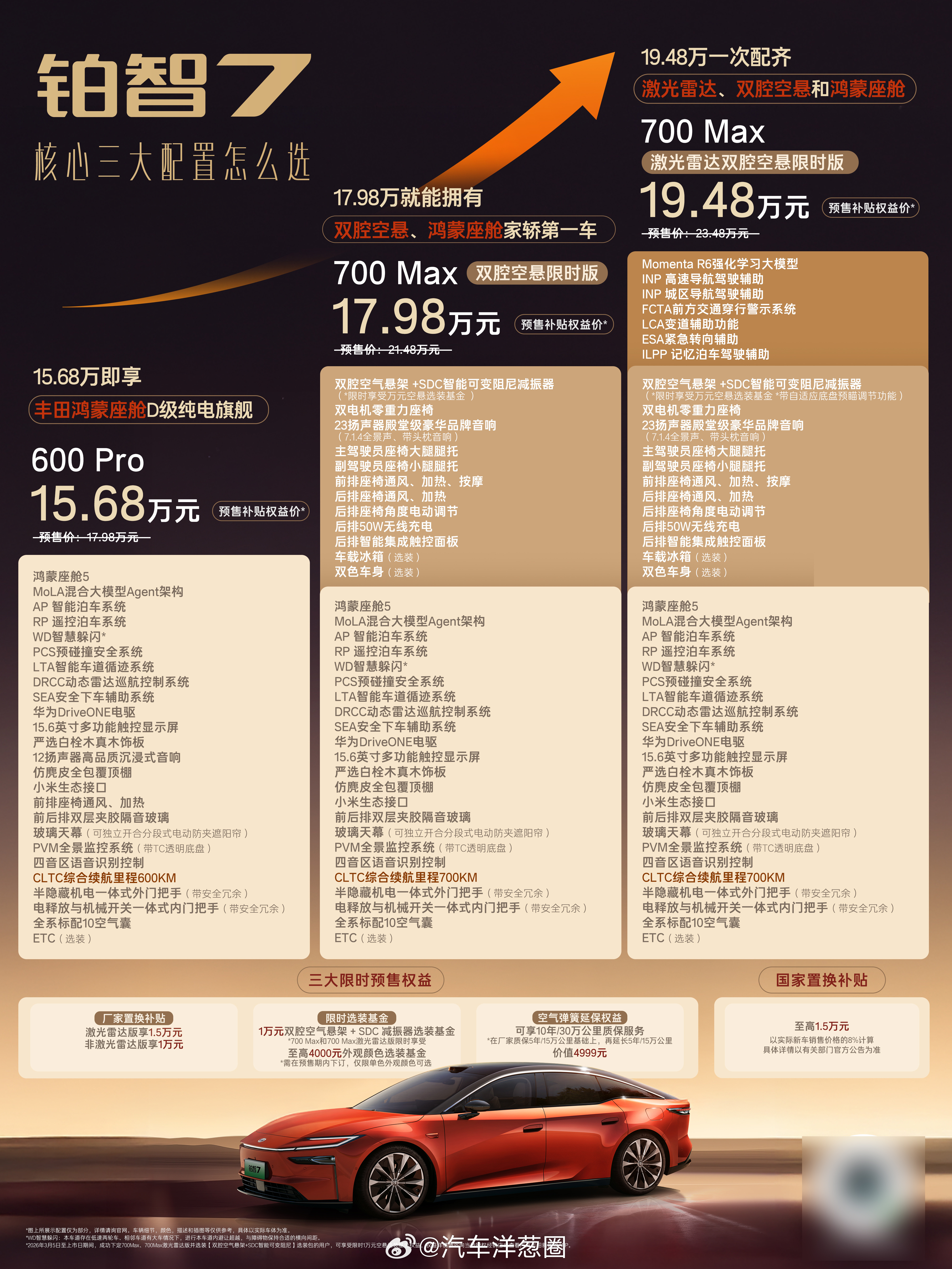 预售价17.98-23.98万预售补贴权益价15.68-20.98万全系3个续航版本每个续航版本有激光雷达车型