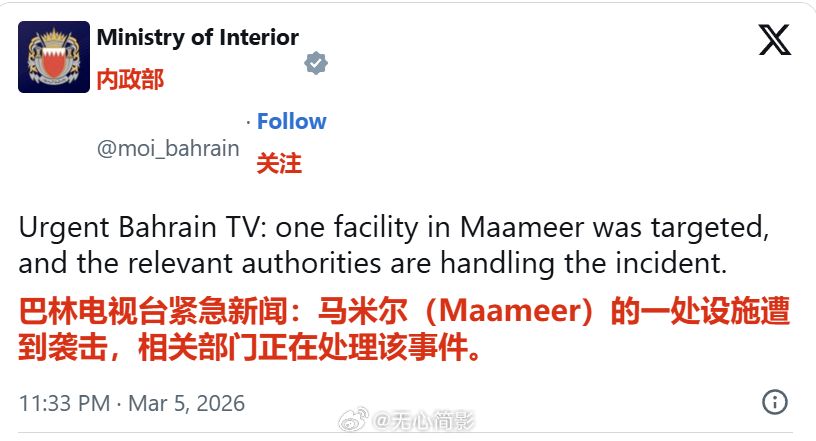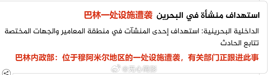 目前中东各国又在挨炸了,其中巴林说他们石油基础设施区域内的一处设施遭到袭击。海外