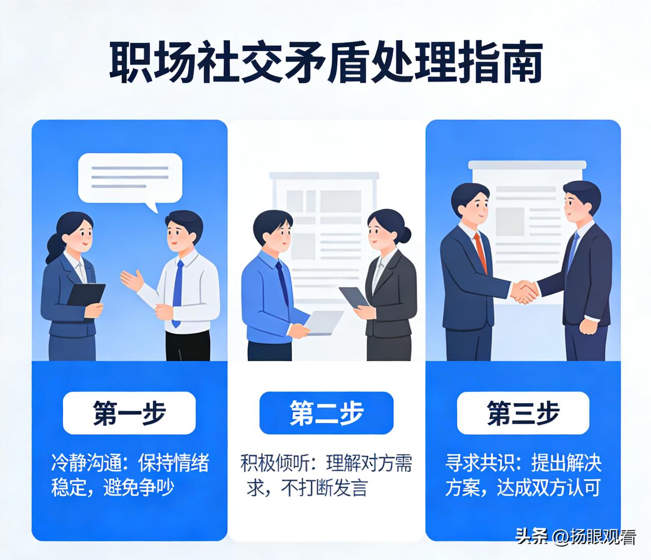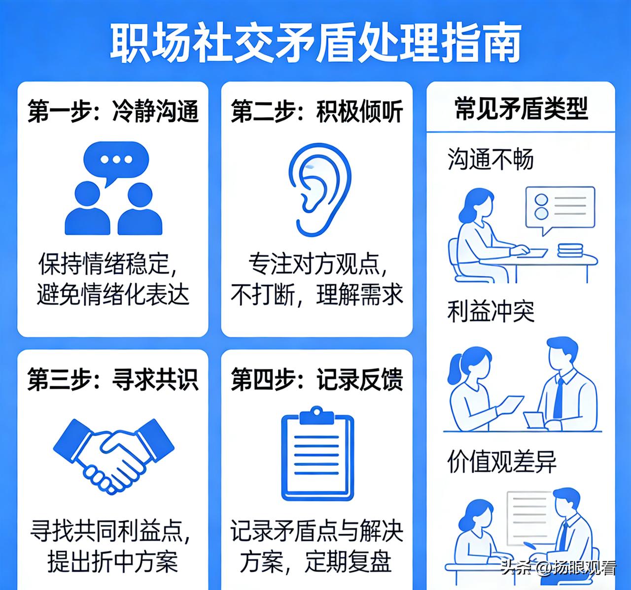 关于如何处理职场社交中的矛盾? 我觉得职场社交遇矛盾,先冷静不情绪化,避免当众争执。聚焦问题本身,不翻旧账、不人身攻击,主动沟通倾听对方诉求,求同存异找共识。守住工作底线,公私分明,必要时寻求第三方协调,维护关系也不委屈自己。