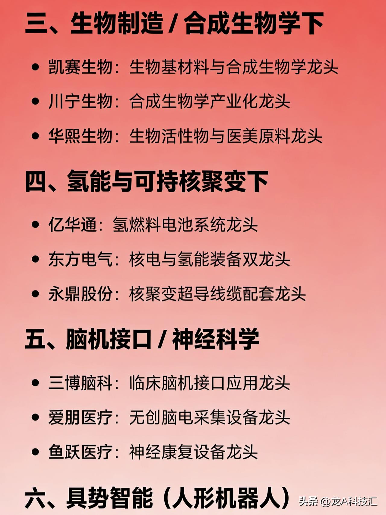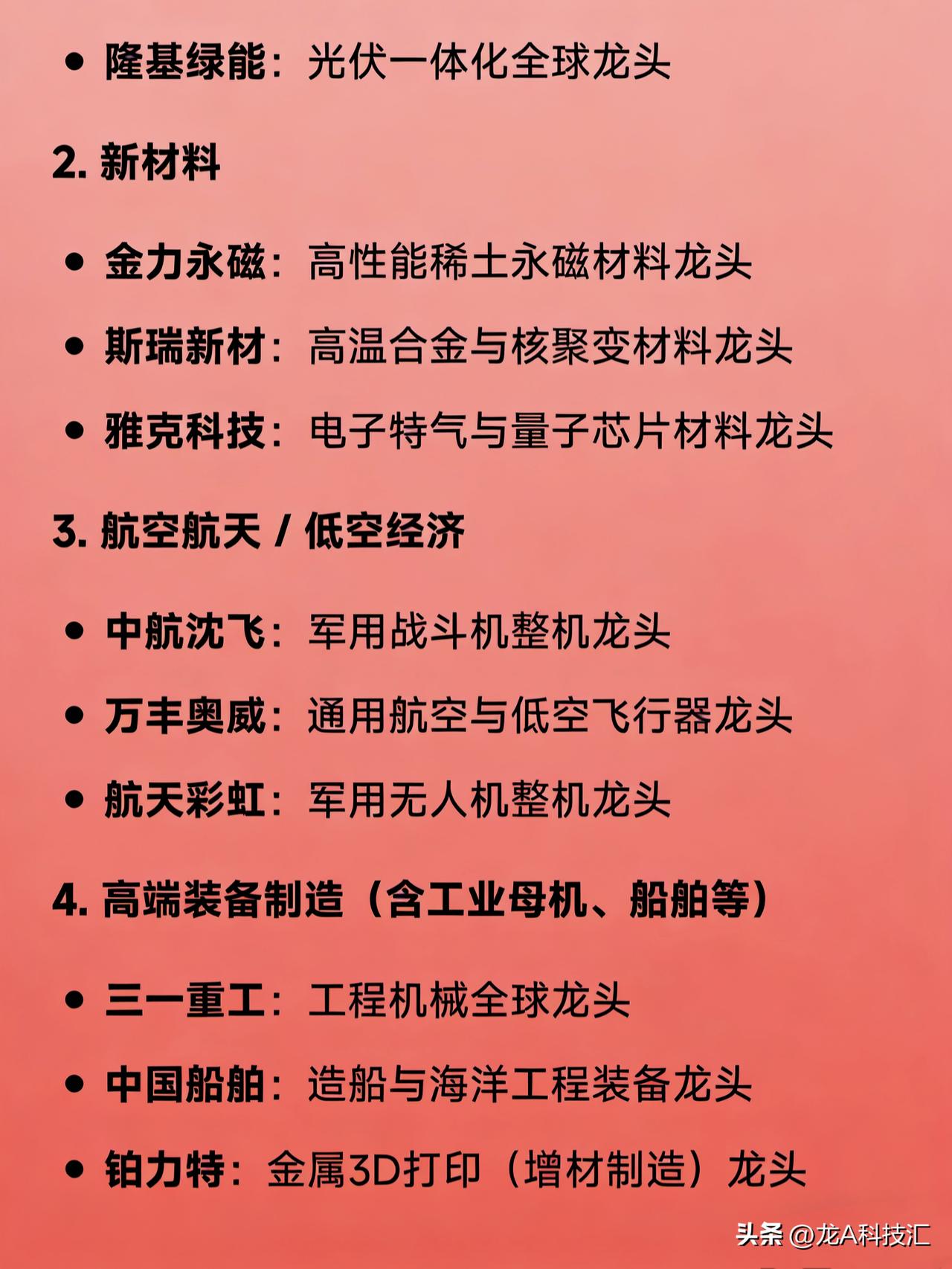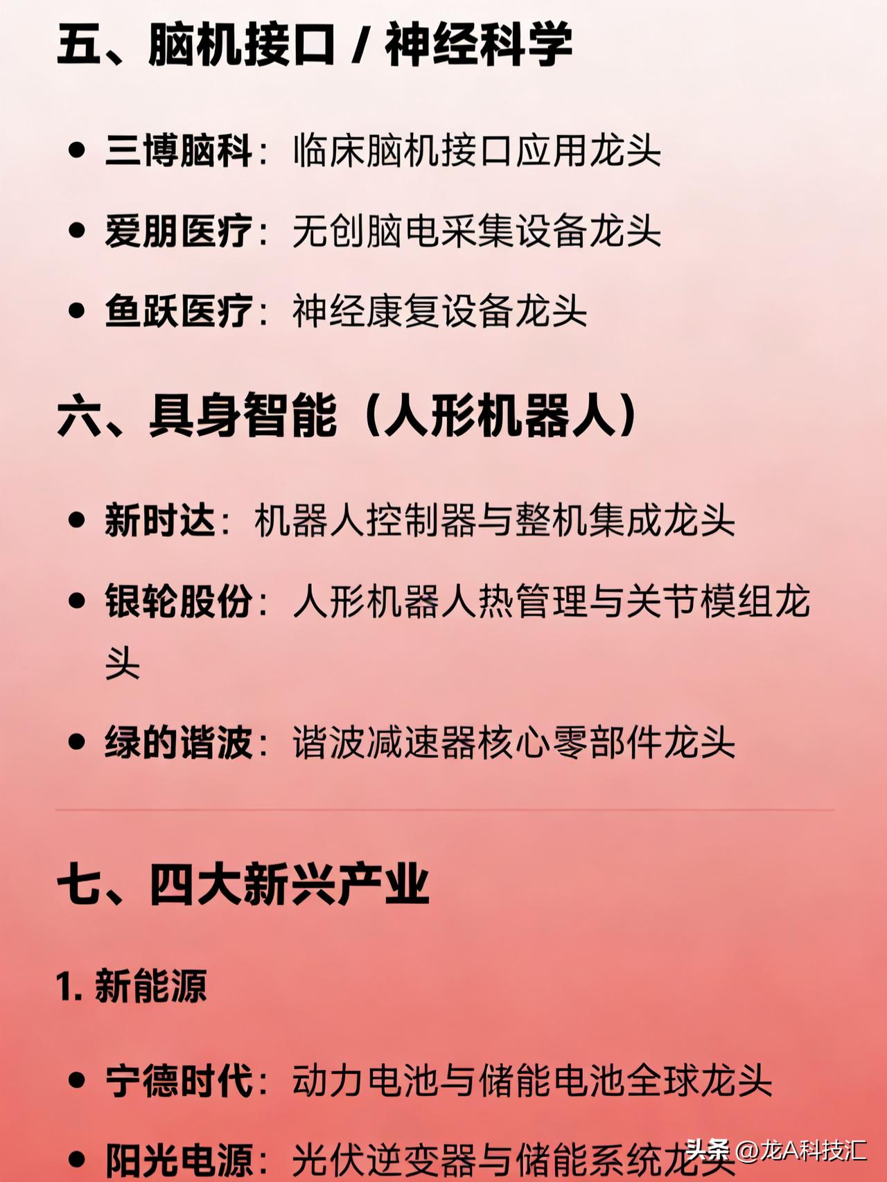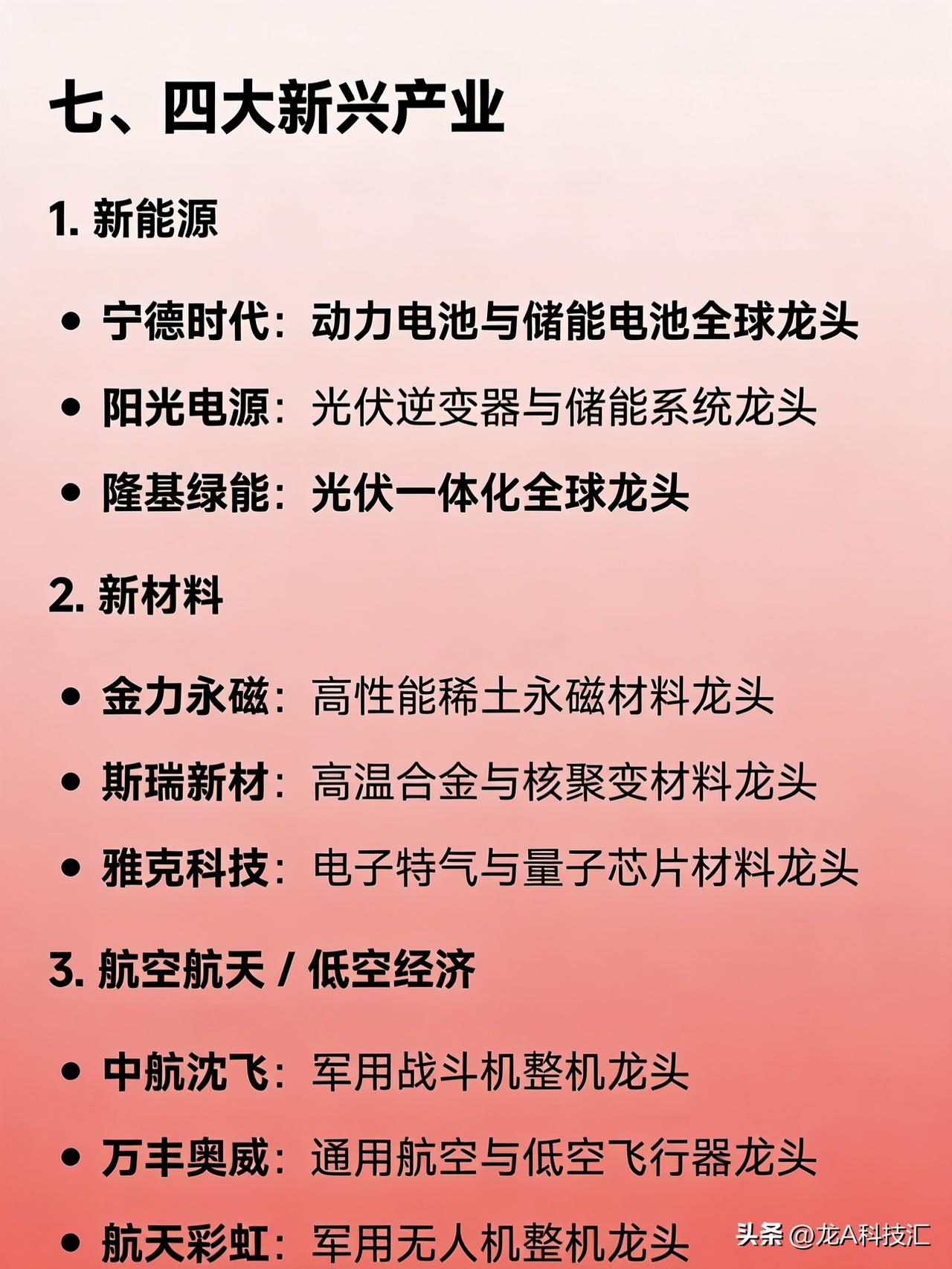 “十五五”规划着重提及的六大未来产业及四大新兴产业相关领域的龙头代表企业汇总 一、量子科技 国盾量子:量子通信设备领军企业 中科曙光:量子算力与超算融合的龙头 三未信安:抗量子密码与安全芯片领域翘楚 二、6G与空天一体化通信 中兴通讯:6G通信设备的领军者 中际旭创:800G/1.6T高速光模块龙头企业 通宇通讯:6G毫米波天线与星地通信终端的佼佼者 三、生物制造 / 合成生物学 凯赛生物:生物基材料与合成生物学的龙头企业 川宁生物:合成生物学产业化的领军者 华熙生物:生物活性物与医美原料的龙头 四、氢能与可控核聚变 亿华通:氢燃料电池系统的龙头企业 东方电气:核电与氢能装备双料冠军 永鼎股份:核聚变超导线缆配套的龙头 五、脑机接口 / 神经科学 三博脑科:临床脑机接口应用的领军者 爱朋医疗:无创脑电采集设备的龙头企业 鱼跃医疗:神经康复设备的佼佼者 六、具身智能(人形机器人) 新时达:机器人控制器与整机集成的龙头企业 银轮股份:人形机器人热管理与关节模组的领军者 绿的谐波:谐波减速器核心零部件的龙头 七、四大新兴产业 1. 新能源 宁德时代:动力电池与储能电池的全球龙头 阳光电源:光伏逆变器与储能系统的龙头企业 隆基绿能:光伏一体化的全球领军者 2. 新材料 金力永磁:高性能稀土永磁材料的龙头企业 斯瑞新材:高温合金与核聚变材料的领军者 雅克科技:电子特气与量子芯片材料的龙头 3. 航空航天 / 低空经济 中航沈飞:军用战斗机整机的龙头企业 万丰奥威:通用航空与低空飞行器的领军者 航天彩虹:军用无人机整机的龙头 4. 高端装备制造(含工业母机、船舶等) 三一重工:工程机械的全球龙头 中国船舶:造船与海洋工程装备的领军者 铂力特:金属3D打印(增材制造)的龙头