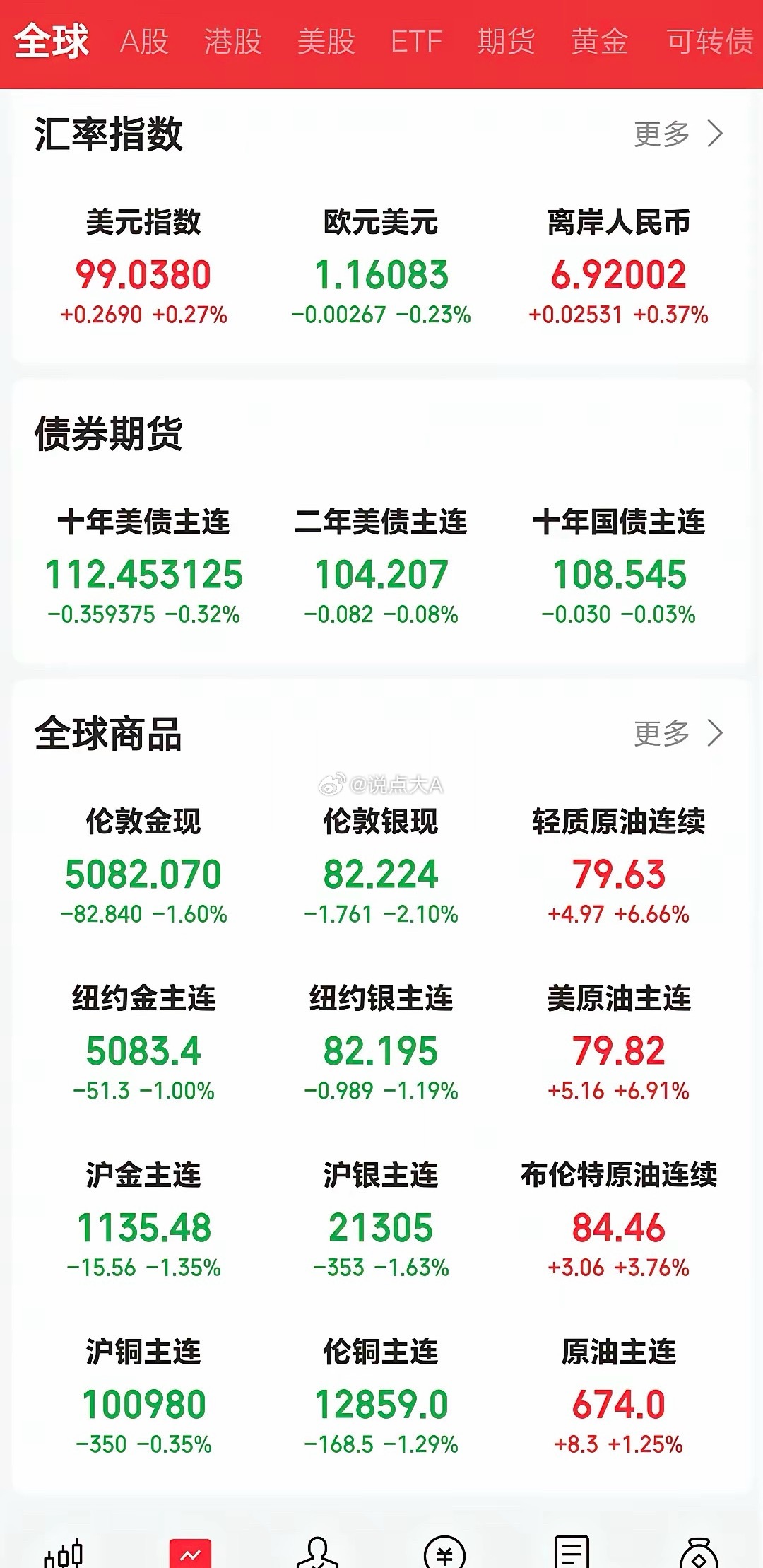 做好防守!外盘收市全线收绿,尽管跌幅不大均探底回升,但也是偏谨慎仍被战争阴云笼罩。今天周五策略简单,只减不补不开新仓。道指跌1.61%,纳指跌0.26%,标普跌0.56%,日经期货跌1.68%;富时期指跌0.31%,金龙指数跌1.43%,中概股跌0.67%,三倍做多跌5.18%。离岸人民币汇率贬值收报6.92元,原油期货大涨五六个点,金银期货收跌二个点左右,二者再次形成跷跷板。战争利空还在发酵,原油期货不止跌,全球市场行情起不来。霍尔木兹海峡对东大是开放的,尽管如此,国际原油大涨也会加剧原油价格飙升。预测今日大盘继续震荡调整,在四千一百点上下窄幅拉锯。操盘策略进入防守,停止大仓位进攻。两个票小四拉升翻红减半仓,大江拉升获利清仓离场。将仓位控制到两成左右。