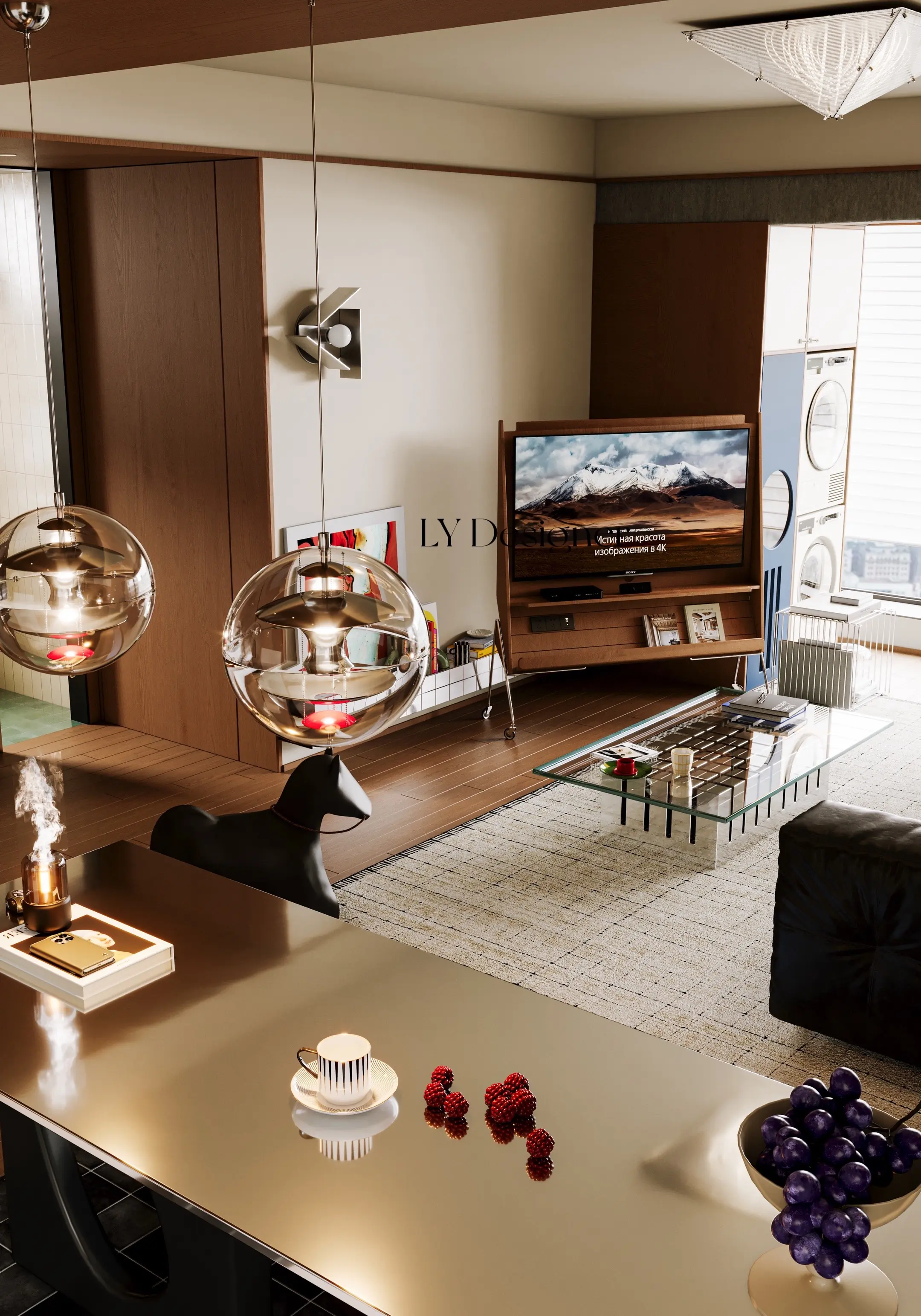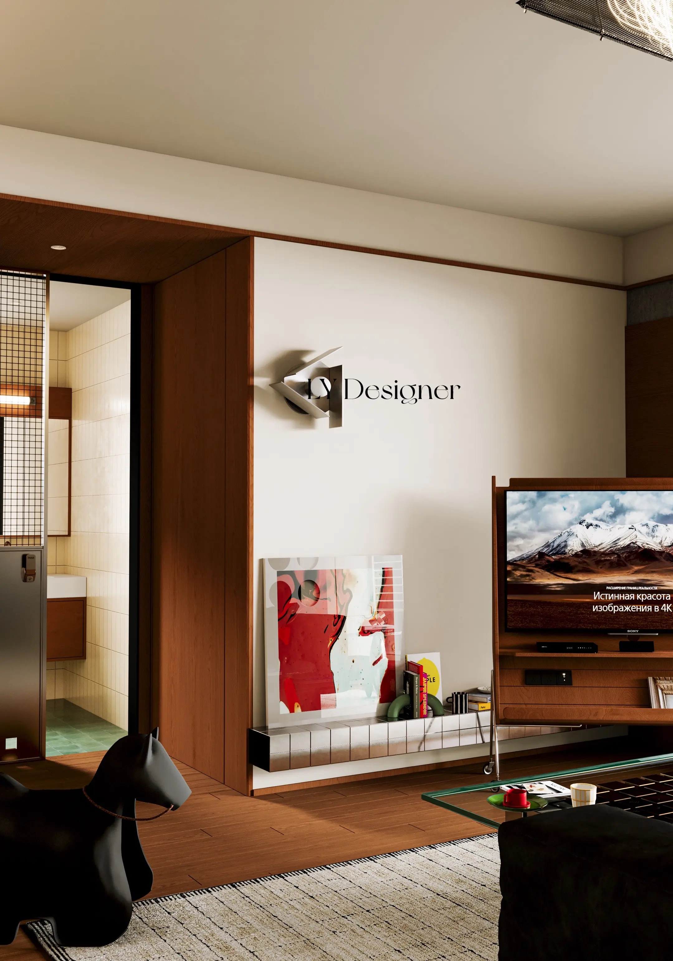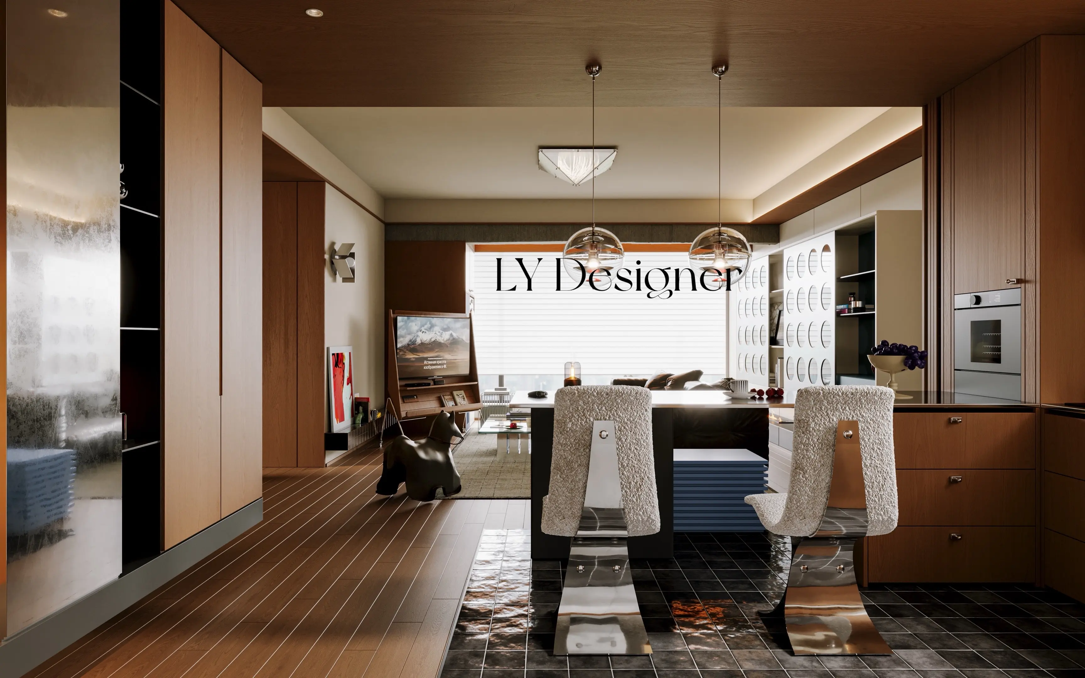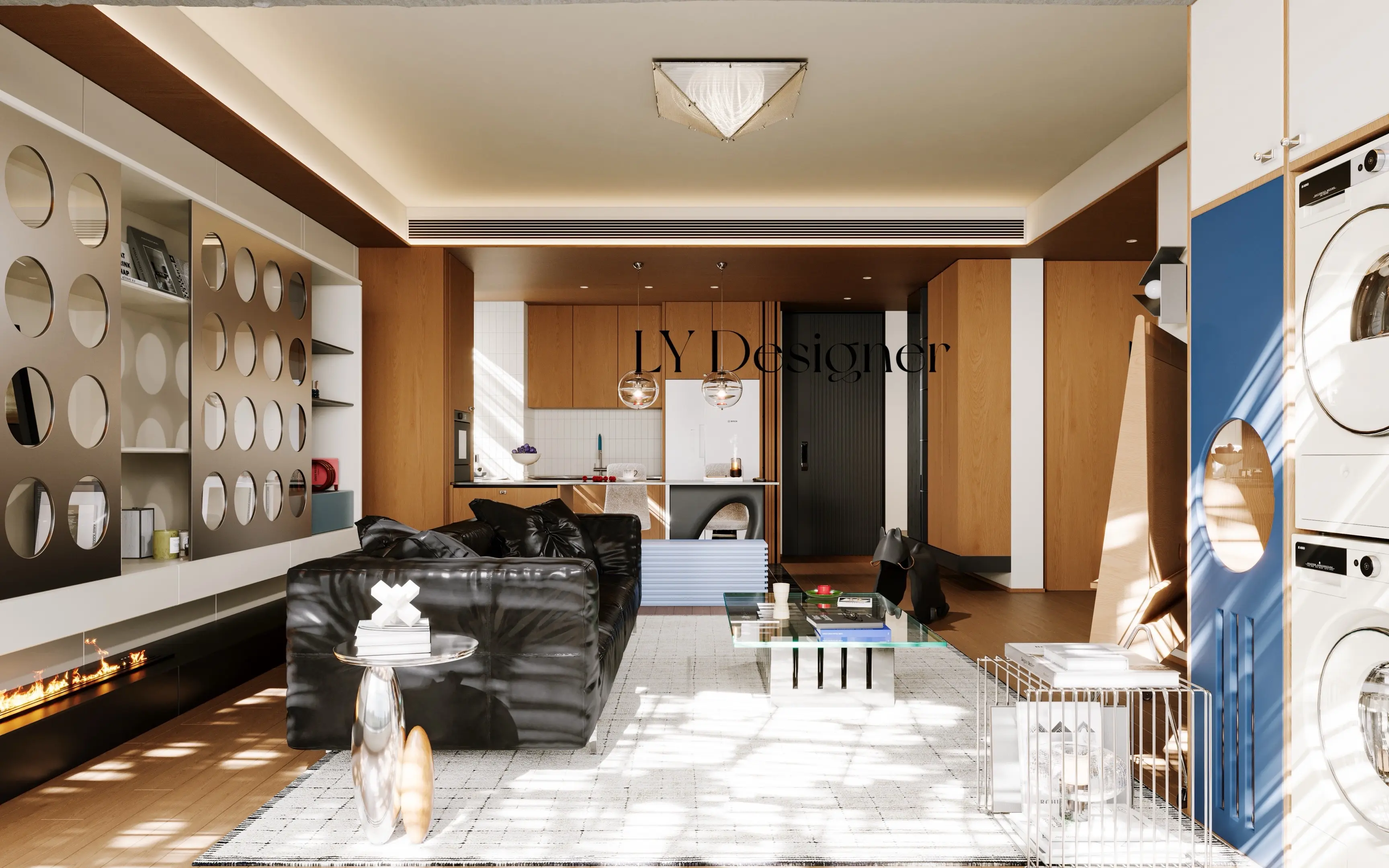 🧱材质运用:大量使用木饰面、金属、玻璃、岩板等材质,质感丰富且富有肌理感,尤其左侧墙面的圆形镂空设计,兼具装饰性与通透感。
