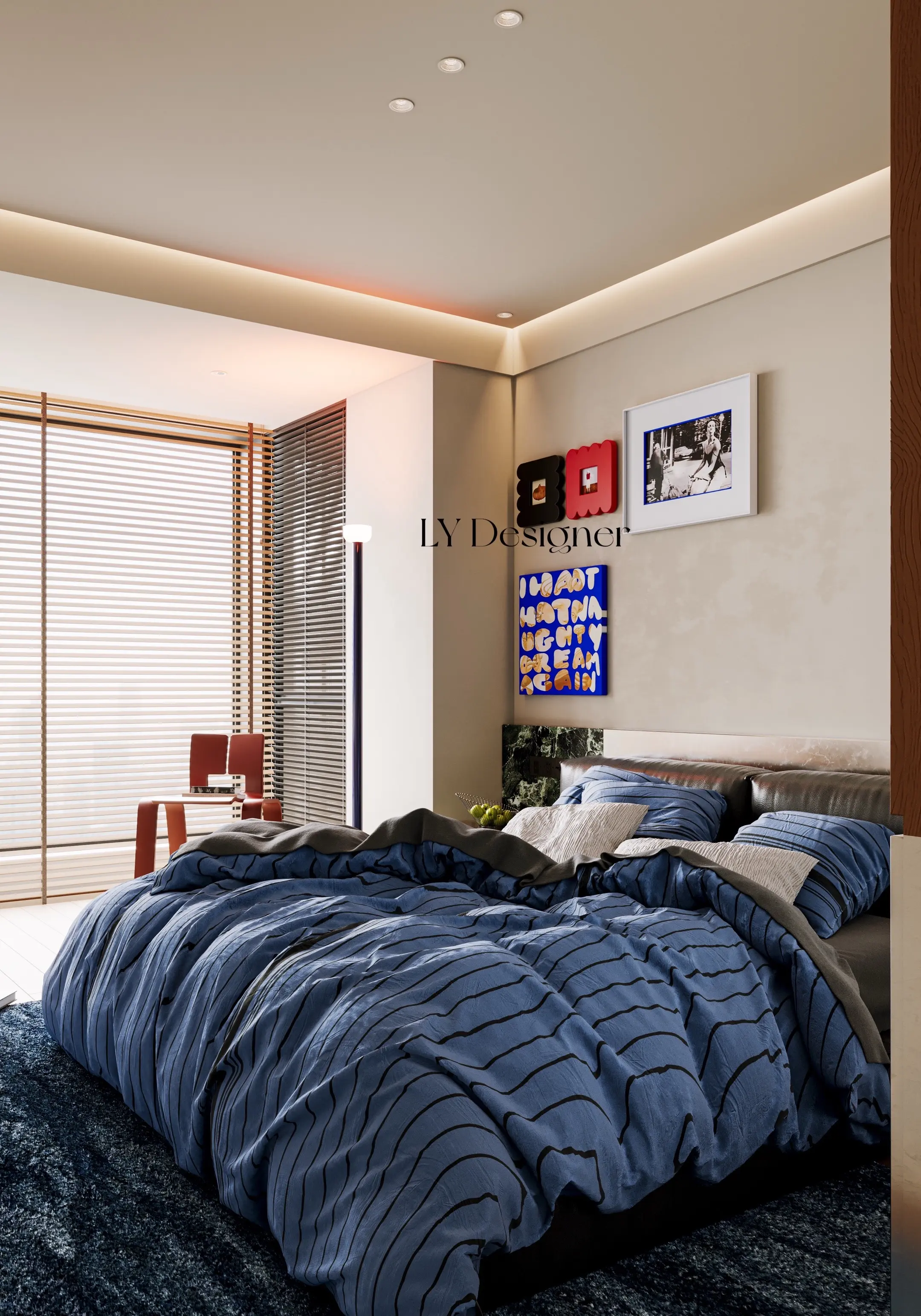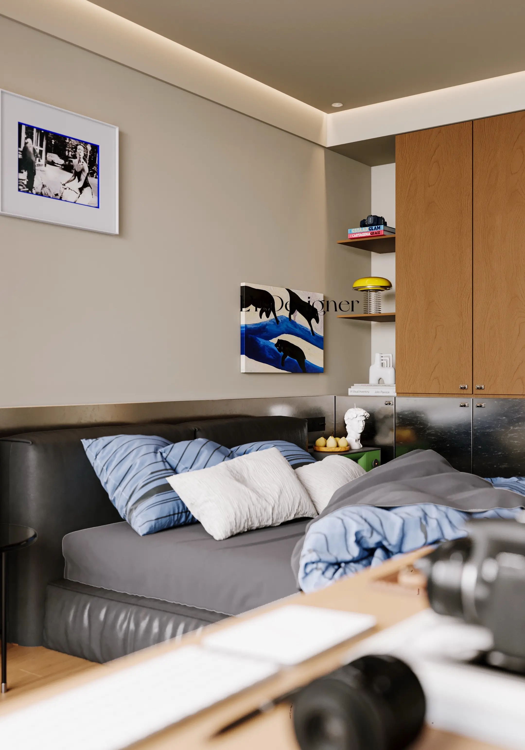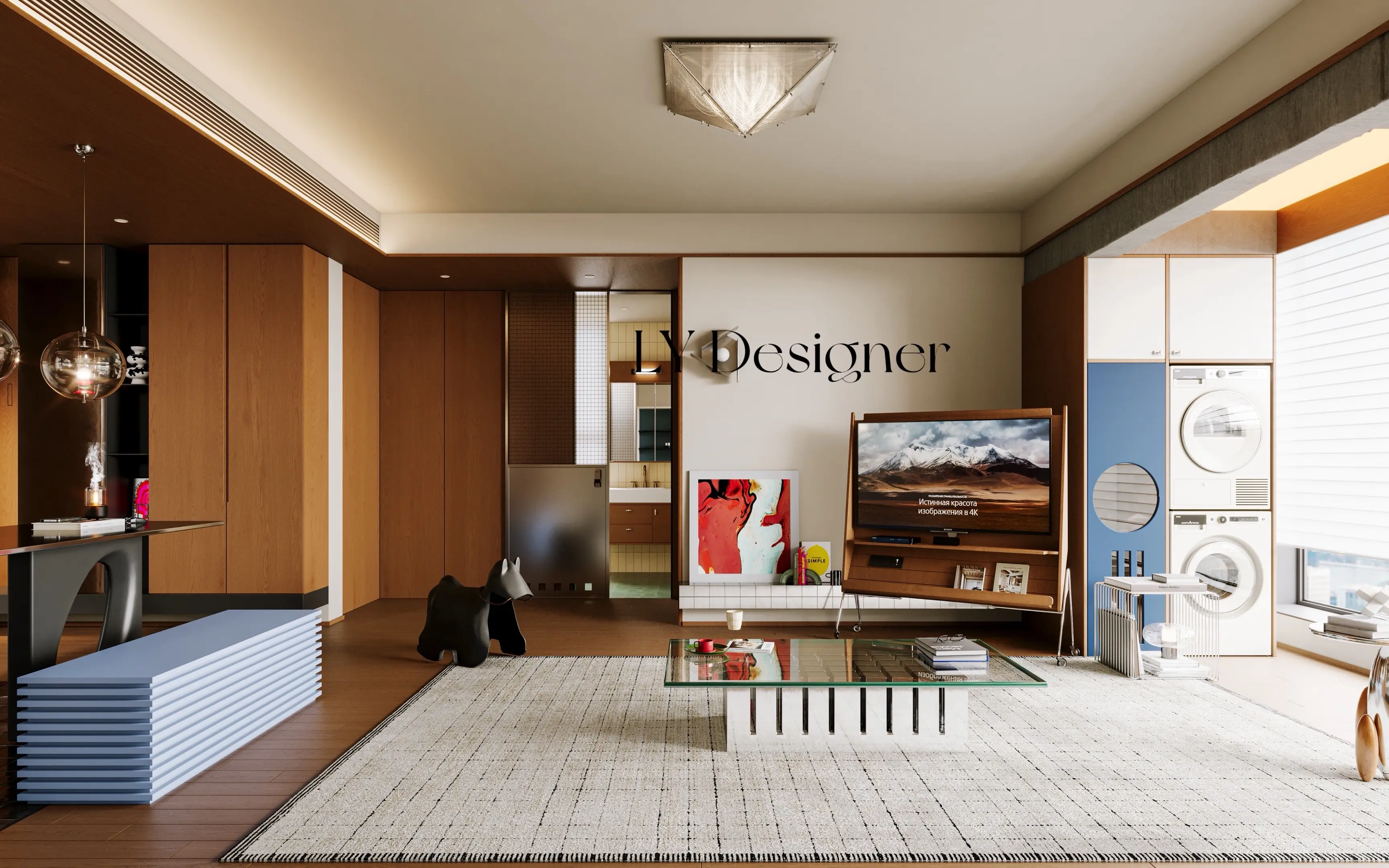 🛏️收纳系统:左侧墙面为定制储物柜,圆形开孔设计不仅美观,还提升了空间的呼吸感;右侧蓝色柜体整合了洗衣机、烘干机,实现"家电隐形",保持空间整洁。