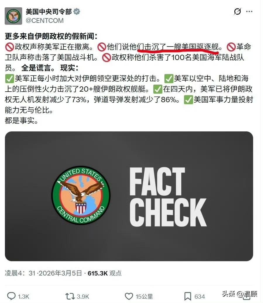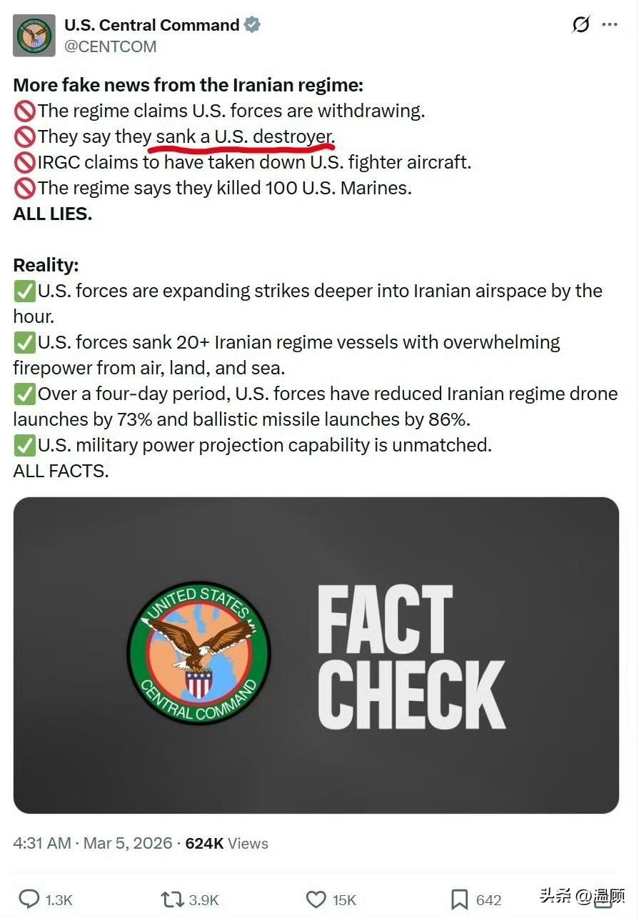 美方只否认“击沉”不否认“击中”…网传低分辨率卫星图显示:阿拉伯海一艘阿利·伯克级驱逐舰舰桥后方出现明显火情,外形轮廓与伯克级高度吻合。伊朗革命卫队宣称用卡德尔-380反舰导弹在650公里外命中该舰,引发甲板大火。 美国中央司令部仅否认“击沉(sank)”,未否认“击中(hit)”,也未澄清是否起火、是否受损。 卫星图有火情、伊朗认账、美方只否“击沉”、击中与否仍无实锤,信息战拉满。