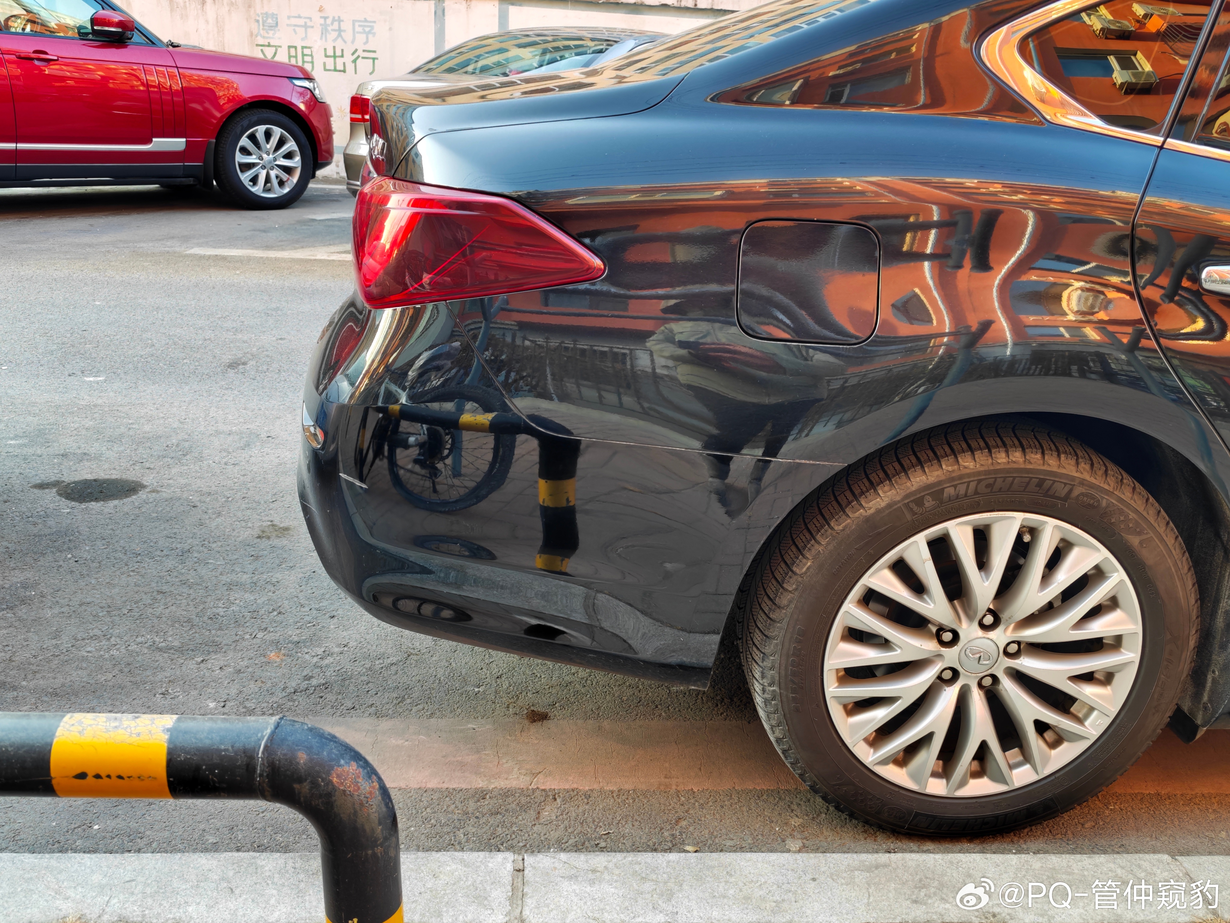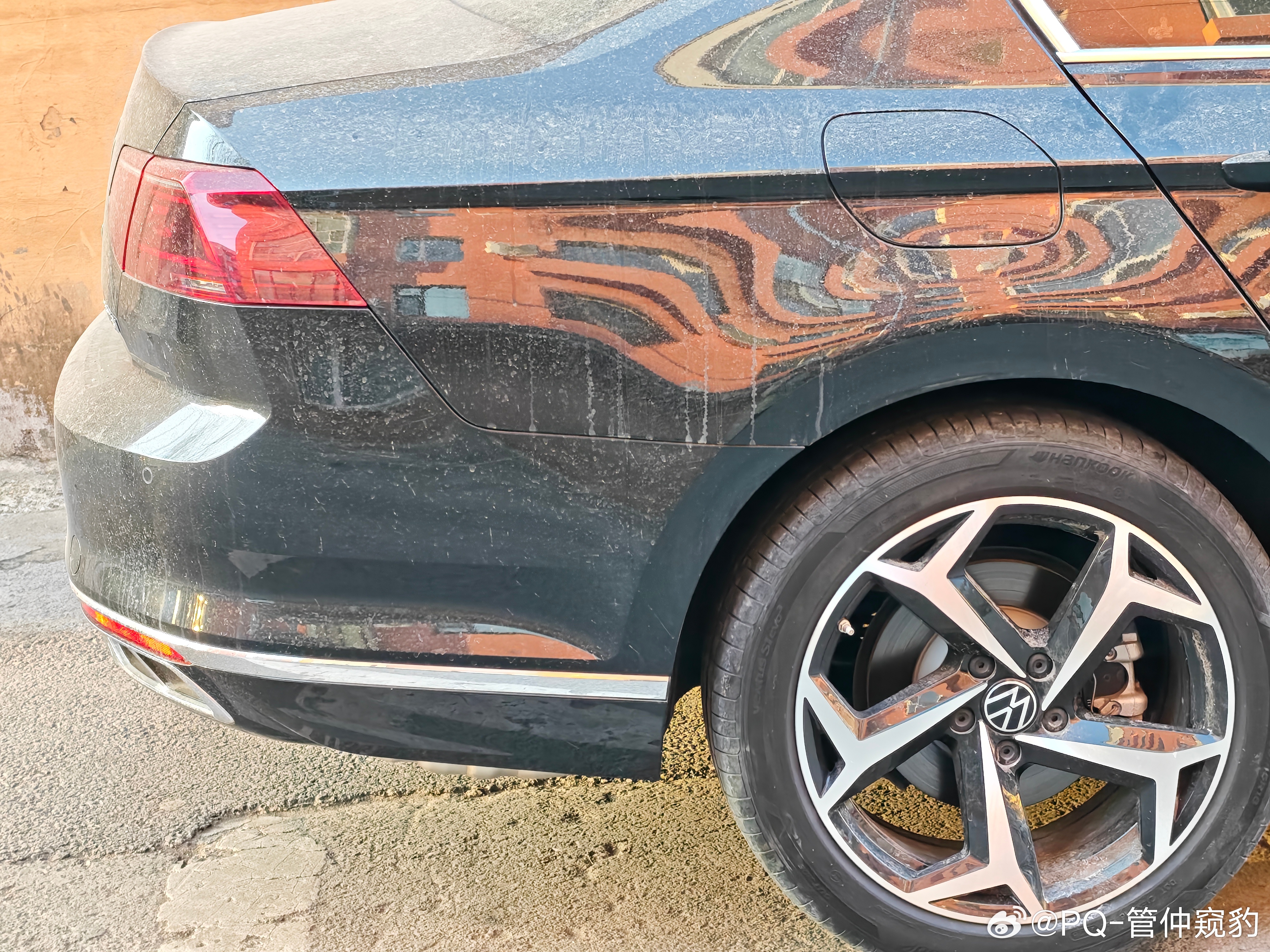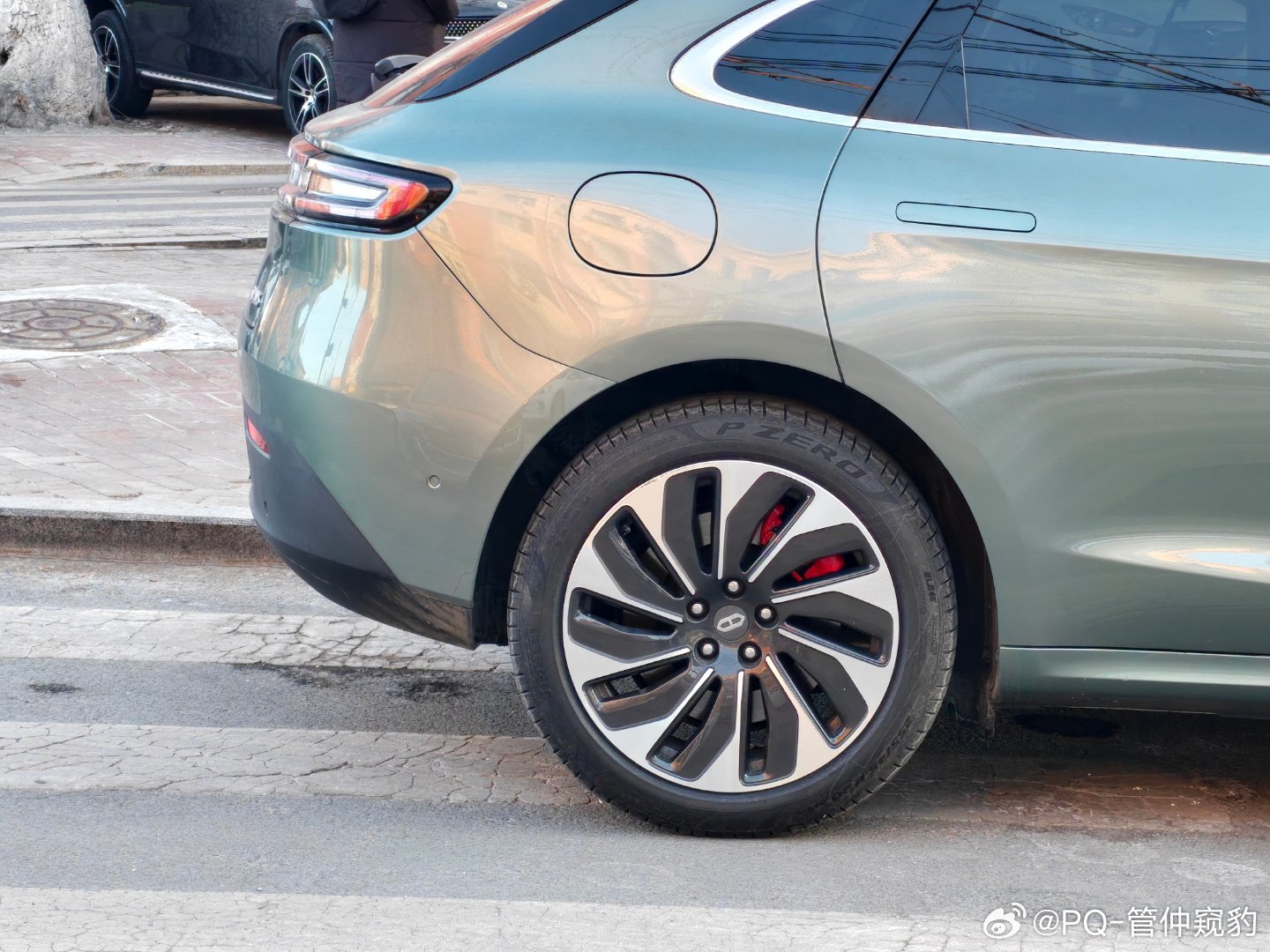你看,这台问界M5后保险杠和侧围的分缝【拐了一下,没拐彻底】什么叫拐彻底?看看后面几台车为什么不呢?制造精度不够,保险杠末端太尖了,导致和侧围配合末端V口过大图2远观你会发现,有那么点别扭,总觉得差点意思