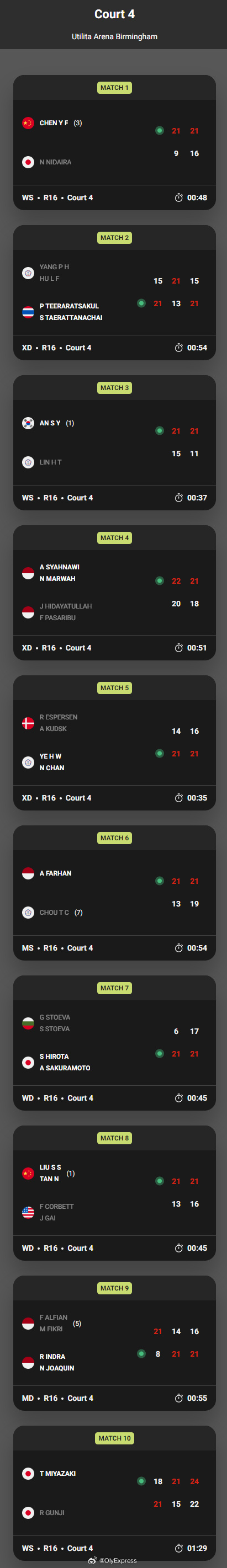 【全英赛次轮国羽9胜1负 凤凰组合无缘八强】2026全英羽毛球公开赛羽联超级赛 3月5日伯明翰,2026世界羽联超级1000全英公开赛结束第二轮,国羽9胜1负,之后冯彦哲/黄东萍落败无缘八强。国羽赛果如下,完全赛果见图:男单:李诗沣17-21/21-12/21-11阮日(爱尔兰)女单:陈雨菲21-9/21-16仁平菜月(日本)王祉怡21-19/21-18凯特通(泰国)男双:梁伟铿/王昶21-17/14-21/21-11李哲辉/杨博轩(中国台北)陈柏阳/刘毅21-19/21-17江凯兴/戴伟钦(马来西亚)女双:刘圣书/谭宁21-13/21-16王曦曦/盖骆(美国)贾一凡/张殊贤21-7/22-20大泽佳步/田部真唯(日本)混双:蒋振邦/魏雅欣21-16/21-18吴埙阀/赖洁敏(马来西亚)郭新娃/陈芳卉21-19/21-19邓恩/迈克菲尔森(苏格兰)冯彦哲/黄东萍21-18/18-21/17-21维斯特加德/布什(丹麦)