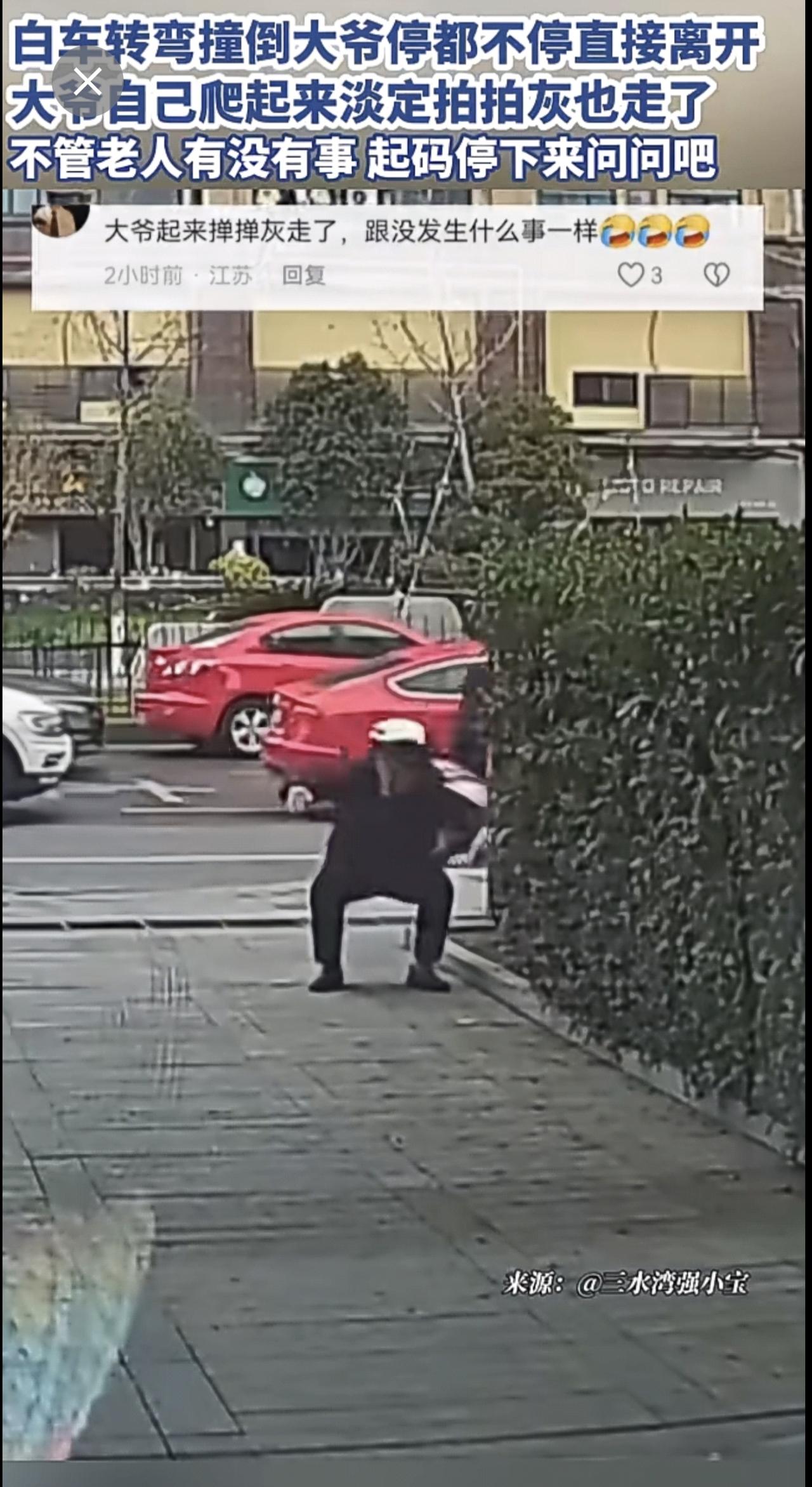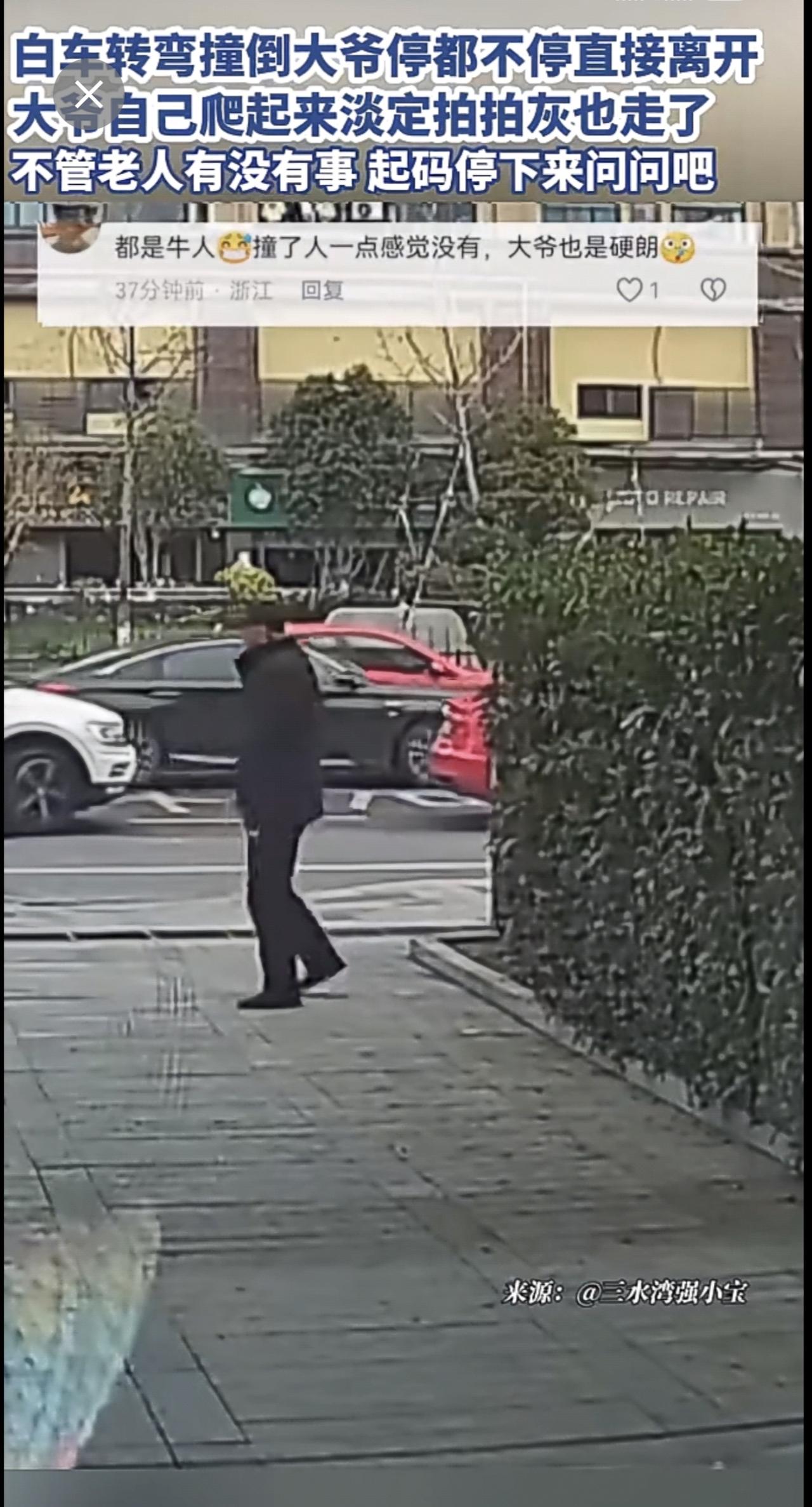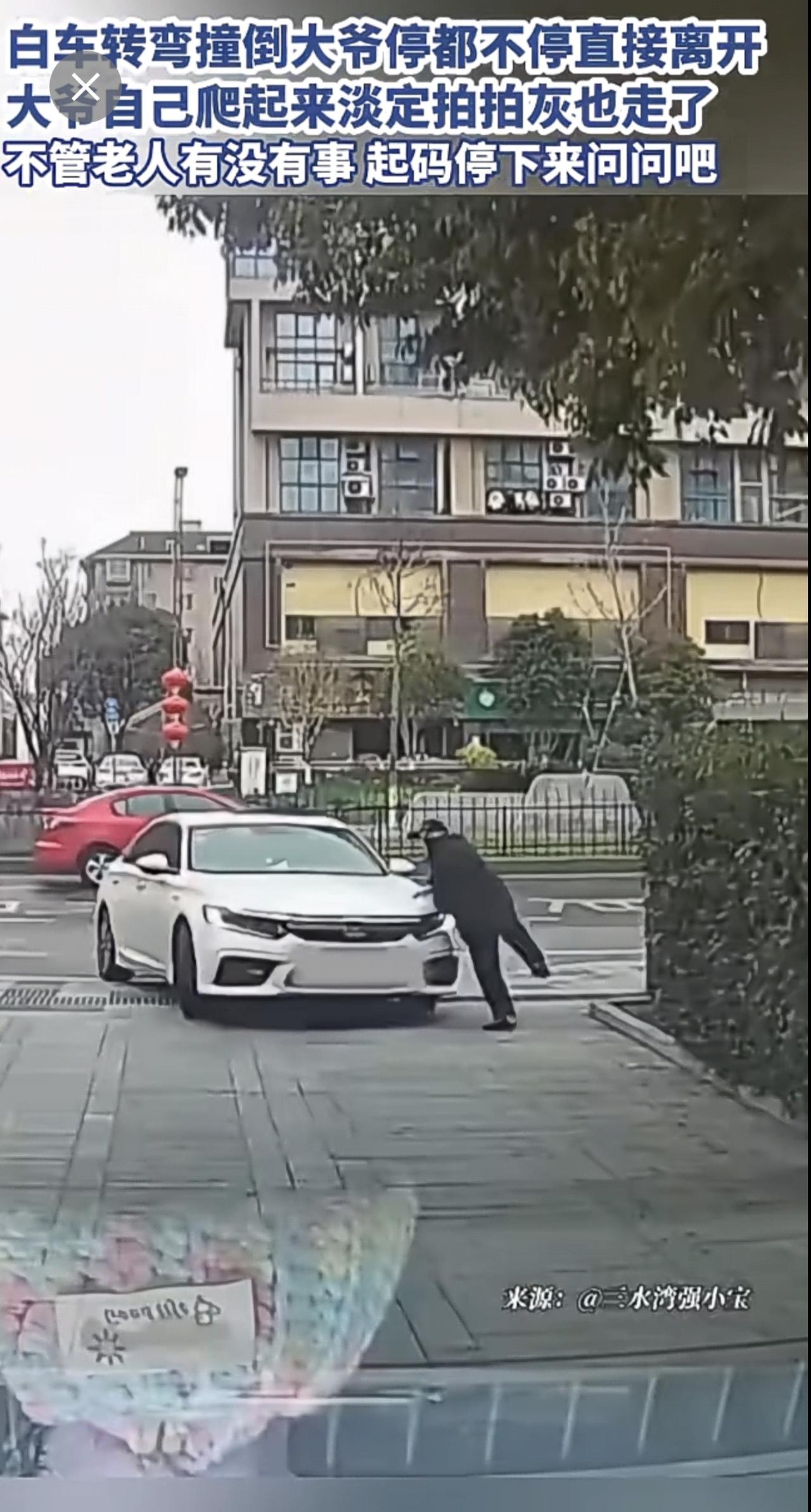 白车转弯撞倒大爷停都不停直接离开,大爷自己爬起来淡定拍拍灰也走了,不管老人有没有
