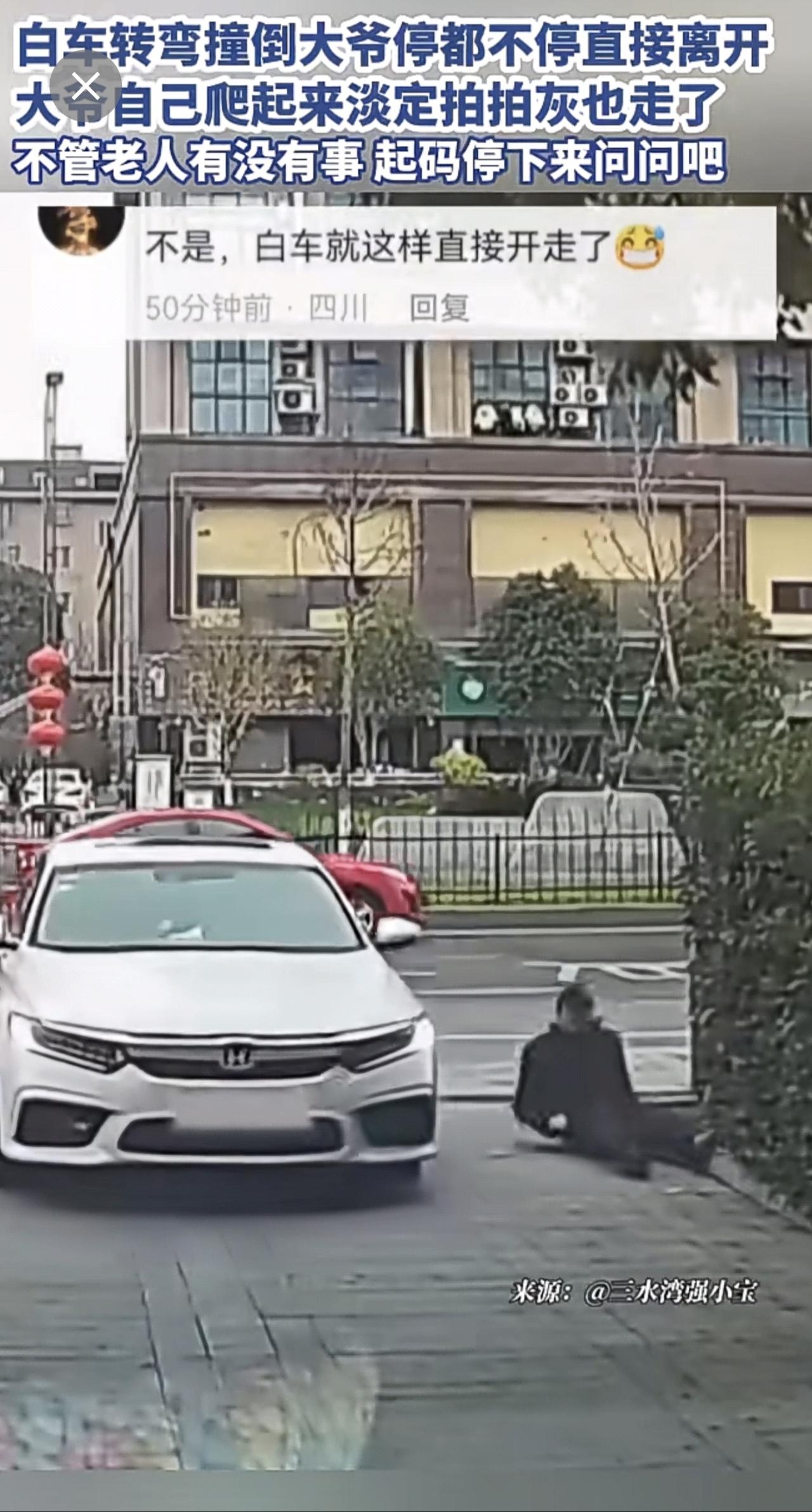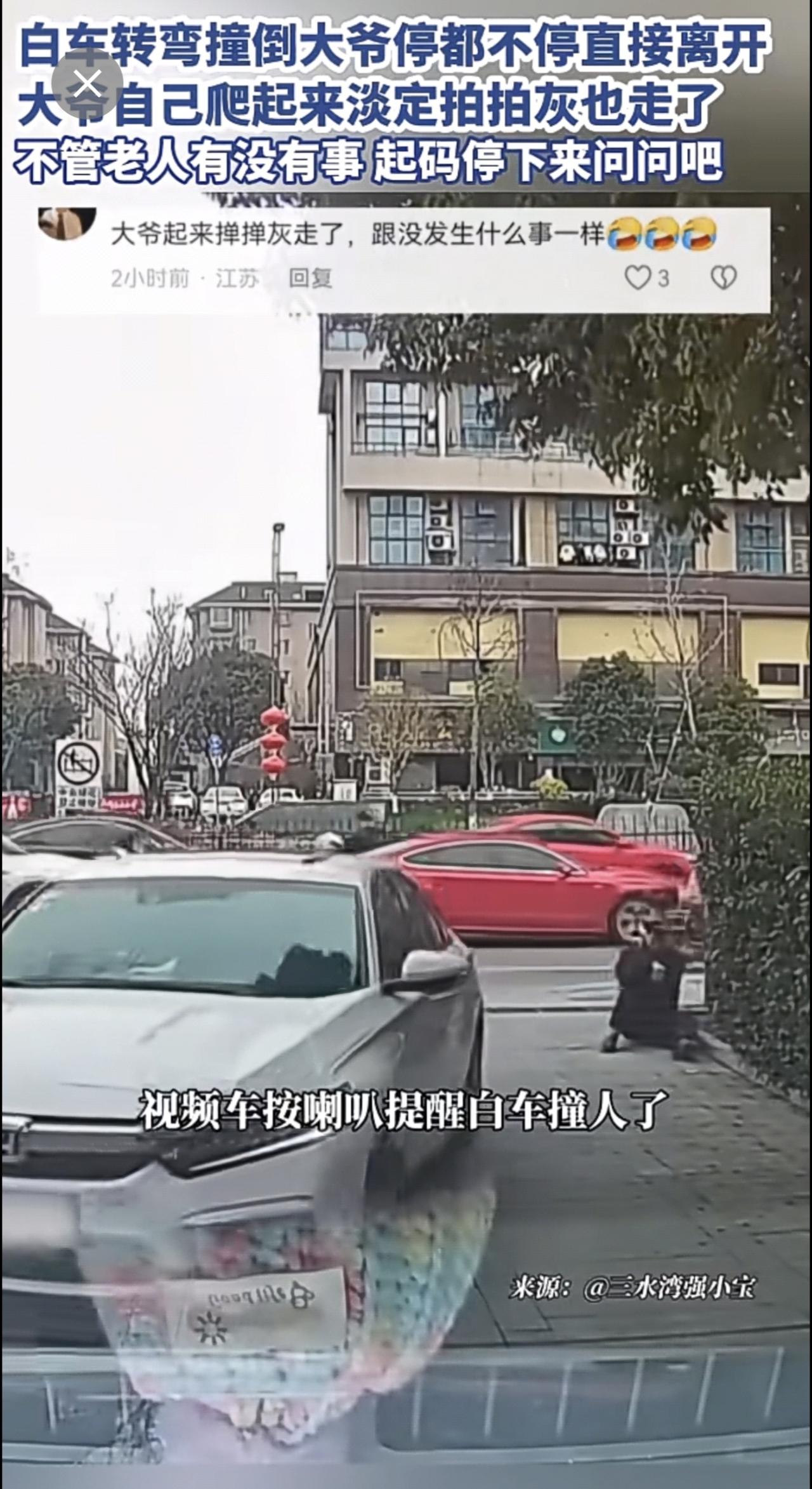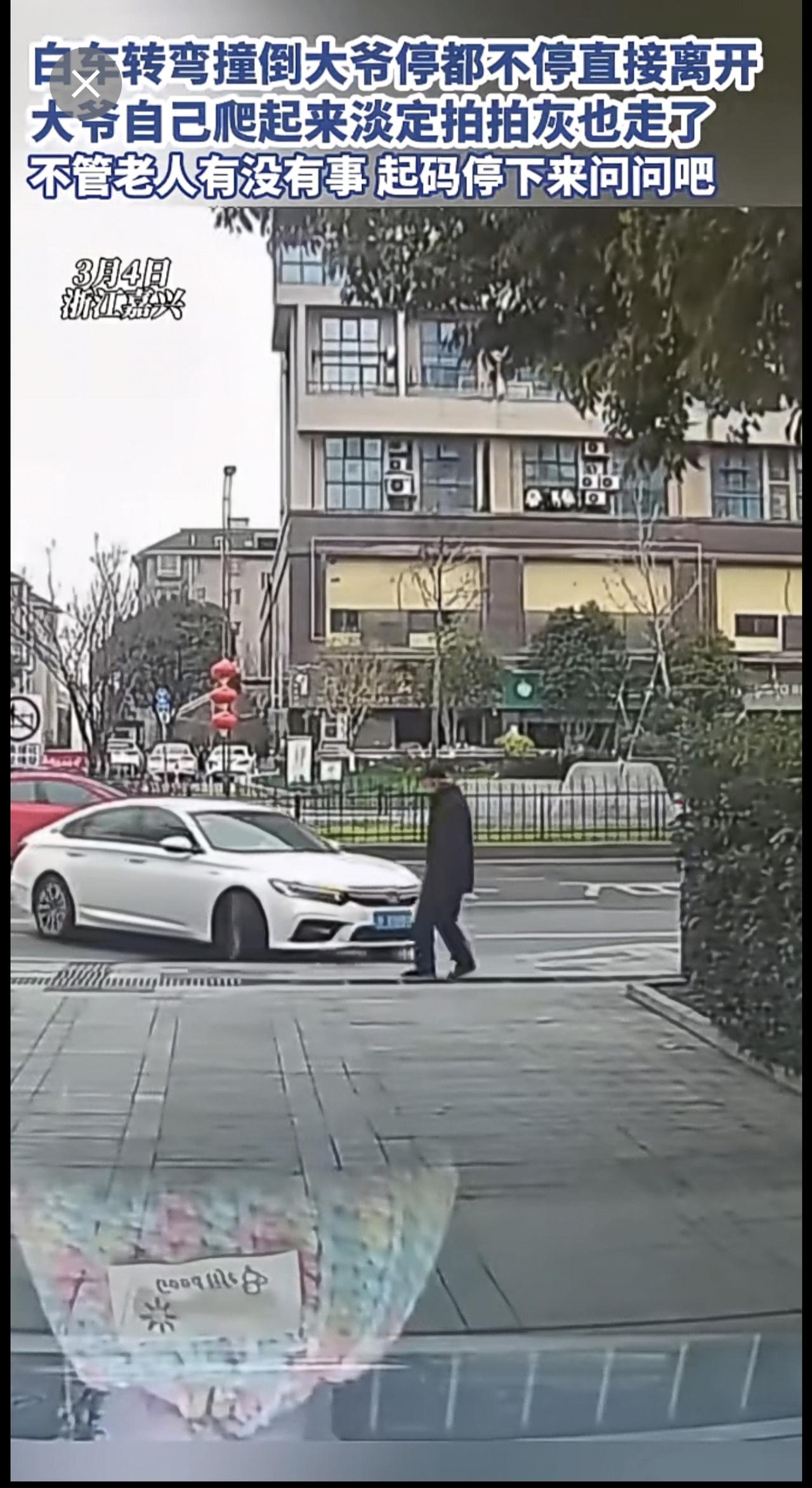 白车转弯撞倒大爷停都不停直接离开,大爷自己爬起来淡定拍拍灰也走了,不管老人有没有