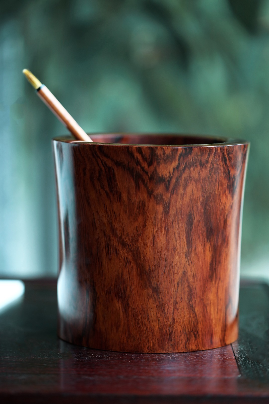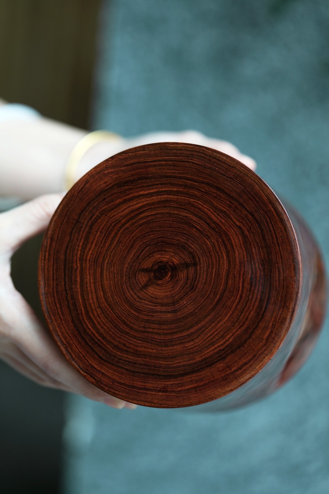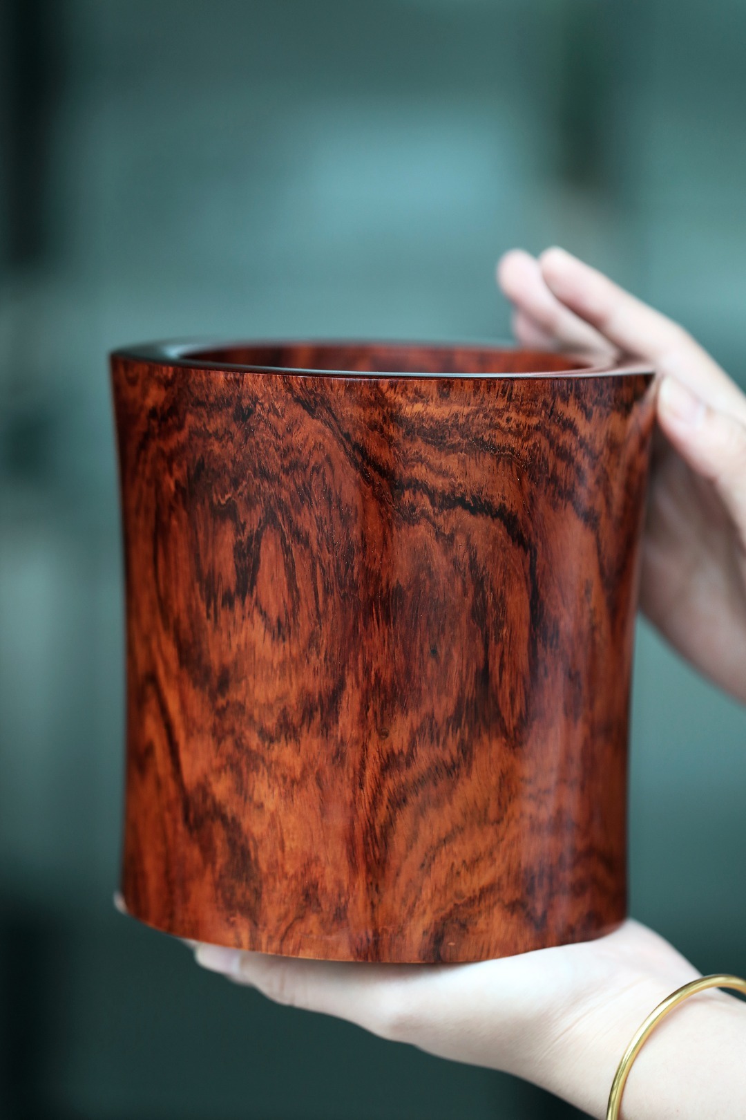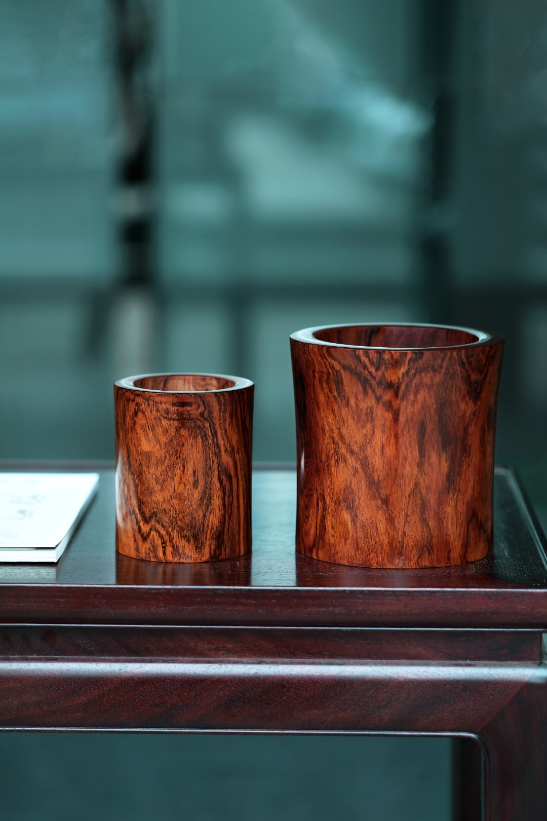 择取紫底老料一木两器,降香浓郁,周身光素纹美质坚。整体造型端庄规整,简约雅致,尽显黄花梨瑰丽气质,又饱含文雅书卷气,文房案头陈设品香,久经摩玩承传。