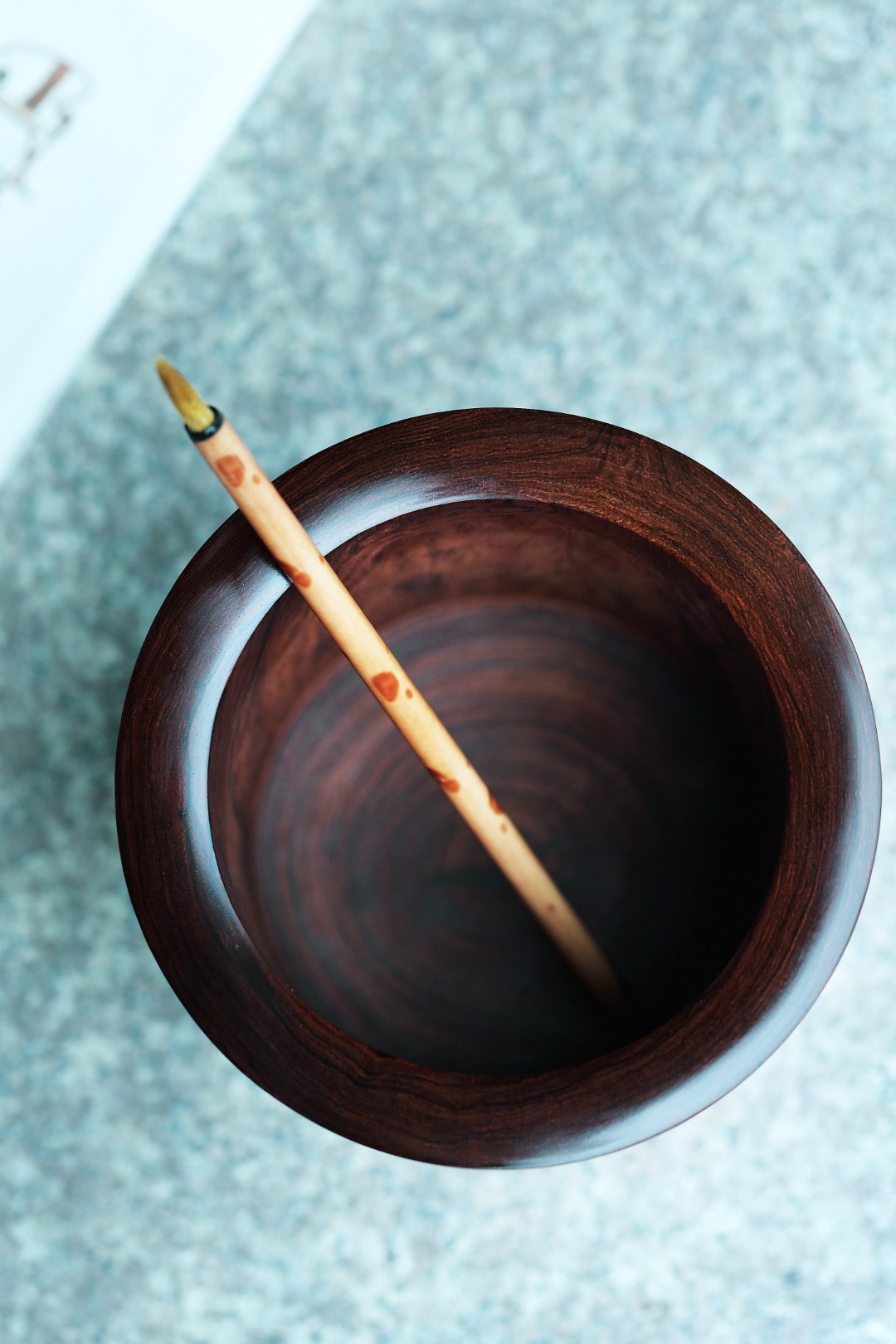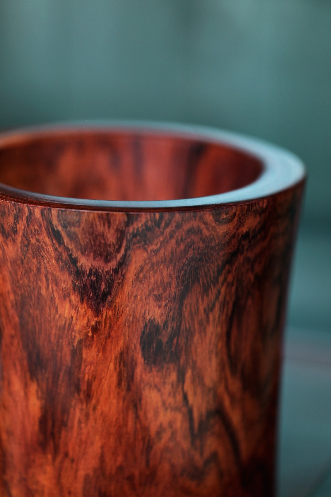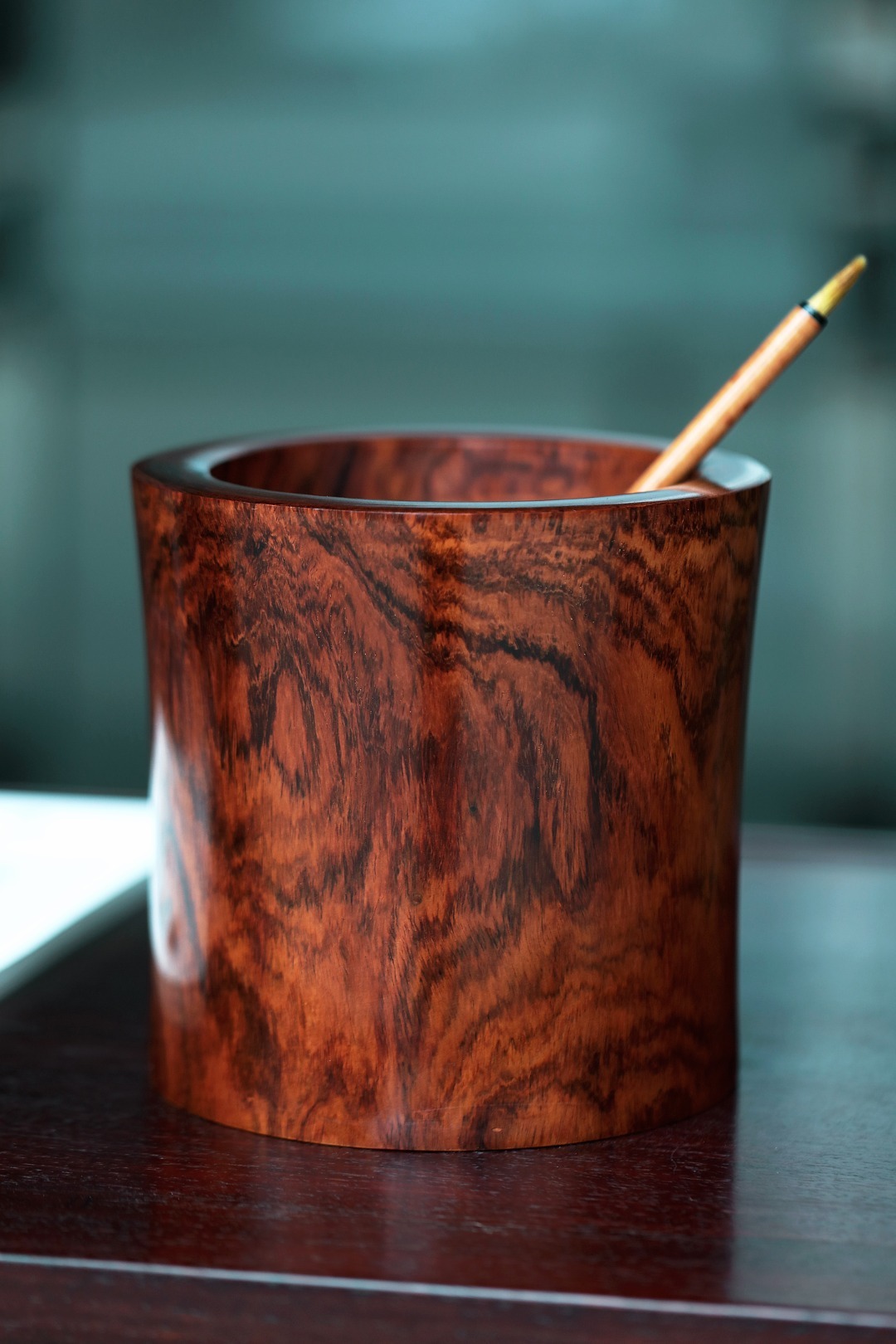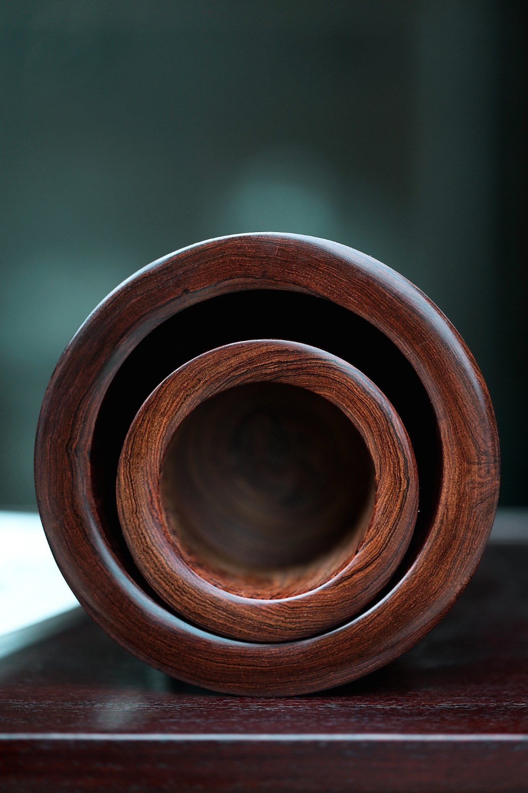 择取紫底老料一木两器,降香浓郁,周身光素纹美质坚。整体造型端庄规整,简约雅致,尽显黄花梨瑰丽气质,又饱含文雅书卷气,文房案头陈设品香,久经摩玩承传。
