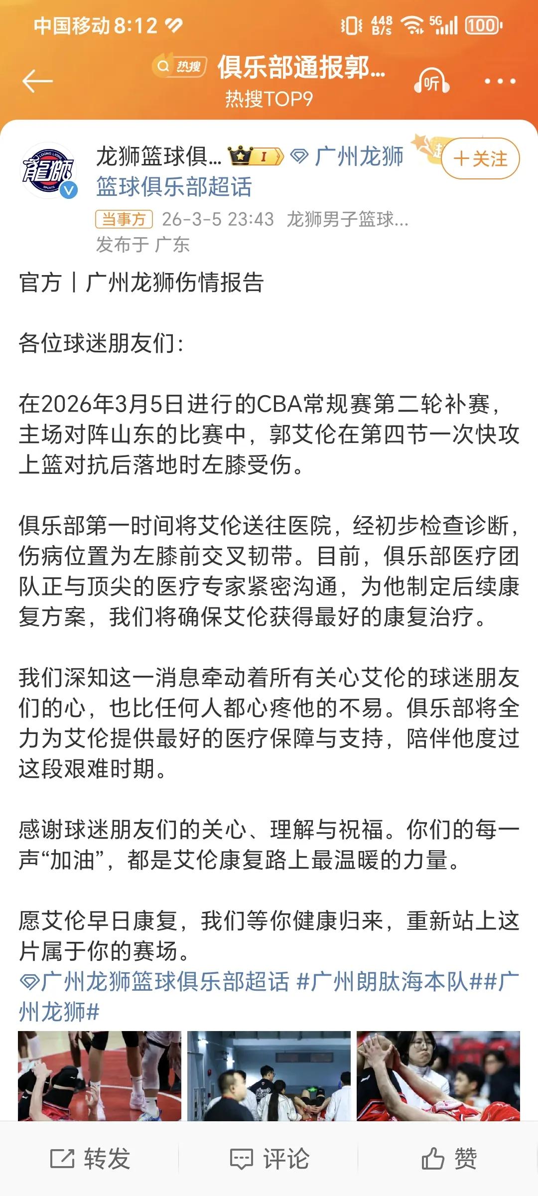 郭艾伦受伤真的挺严重的,大概率退役了!昨晚在广州队和山东队比赛中,郭艾伦篮下突破的时候左膝盖没有支撑好,出现扭曲的情况,当时就倒地不起后被抬上担架去医院,此时郭艾伦应该和当时的林书豪受伤的情况一样,球员都当时意识到了受伤的严重性。 赛后果不其然,郭艾伦和广州队都宣布是左膝盖交叉韧带断了,这个伤病对于职业篮球运动员来说是毁灭的,一个是身体需要一年左右的时间专业康复,而且康复后球员的运动能力直线下降,另一个是还需要心理康复,毕竟是这个伤病是非常严重的,需要迈过害怕受伤那道坎才能回到赛场。 郭艾伦这两个赛季本身就有断断续续的伤病,加上年龄本身就接近退役了,今年的比赛状态也大不如以前了,基本上是替补打个十多分钟,所以今年的比赛他都是小心翼翼的,一共就打了7场比赛就是害怕受伤。此次重伤大概率加速他的退役,对于一个职业球员来说有些意难平,希望他早日康复吧,无论是继续选择留在场上还是退役,我们都感谢他带来的精彩篮球比赛。