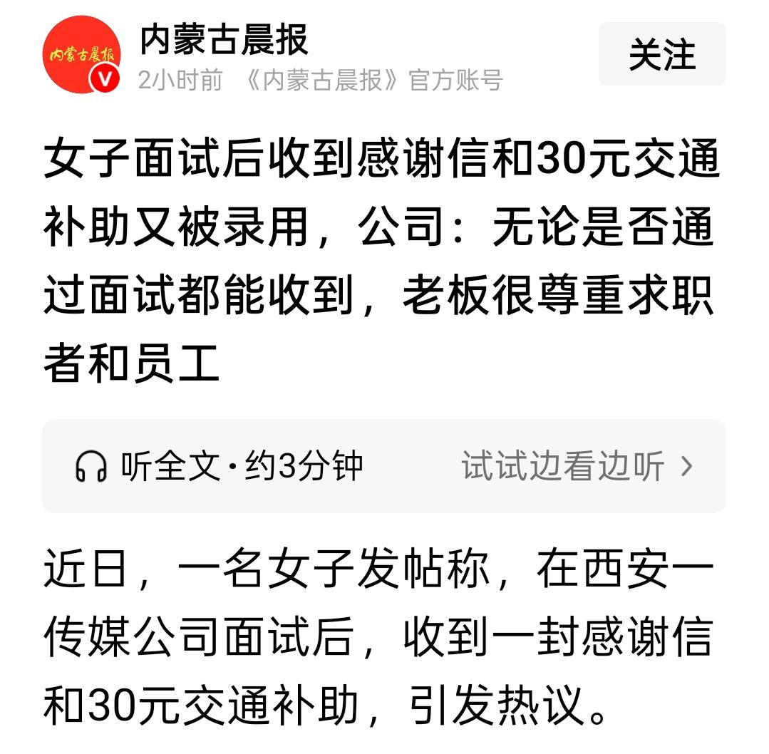 头一回见面试还给钱的,这家公司格局打开了! 看惯了面试忽悠白嫖的公司,西安这家传媒公司真是一股清流。 女子面试完,不但收到了正儿八经的感谢信,还意外领到了30块交通补助。 钱不多,但事儿办得漂亮。 这30块就像一面照妖镜,照出了多少公司的丑态。有的让你反复跑三四趟,有的让你先试岗七天不给钱,还有的面试不过连句回复都没有,直接让你石沉大海。 说实话,很多求职者被白嫖惯了,都麻木了。 但仔细想想,面试本身就是双向选择。你花时间筛选我,我也付出了时间和路费来配合。哪怕不合适,一句真诚的反馈,一份车马费,体现的是对人才最基本的尊重。 有网友说得好:这30块,买的是求职者的体面,也是公司的格局。 其实人在职场,谁差这30块钱? 大家感动的是被当成“人”看,而不是被当作完成HR面试KPI的工具。这种公司,哪怕这次没缘分,以后有机会,大家也愿意优先考虑。 给这个小细节点赞。 希望这样的公司越来越多,职场生态才能越来越好。 你面试时遇到过什么暖心或奇葩的事儿?欢迎来聊聊!