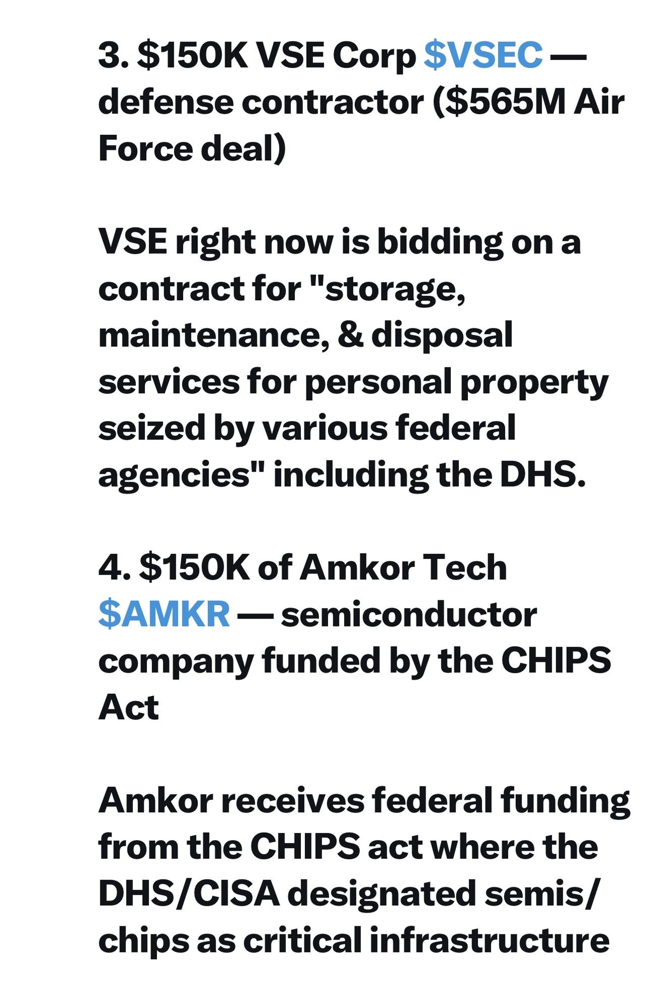 4. 15万美元Amkor Tech(一家由CHIPS法案资助的半导体公司)股票。
