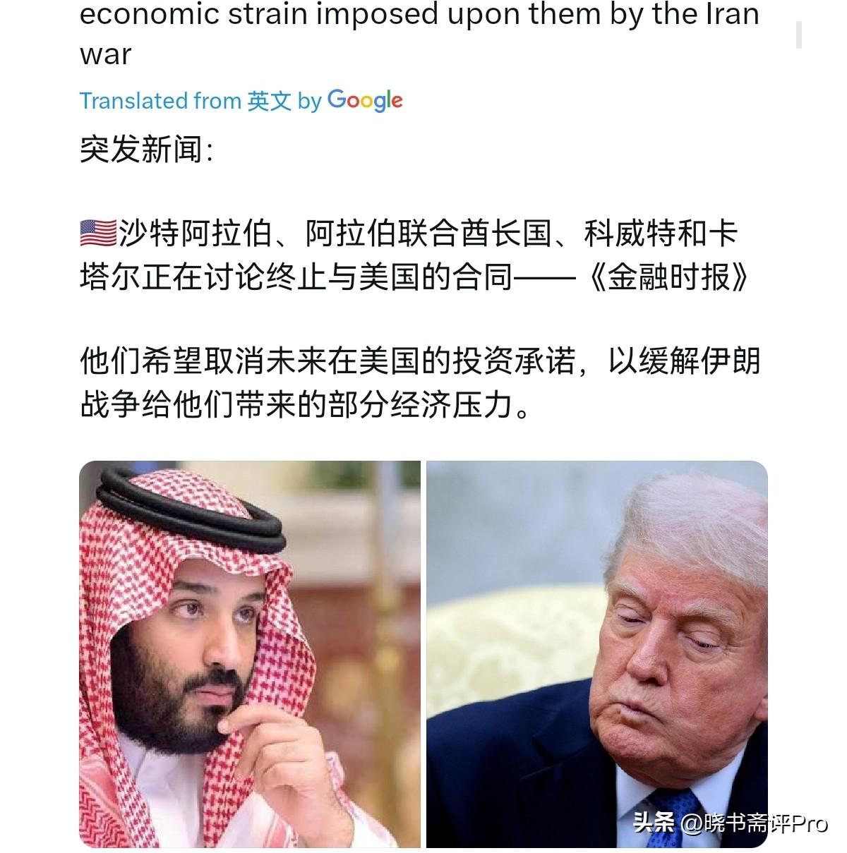 沙特带头对美国进行施压了!3月6日,根据外媒报道,外媒称,沙特阿拉伯、阿拉伯联合酋长国、科威特、卡塔尔正在讨论终止与美国的合同。他们希望取消未来在美国的投资承诺,以缓解伊朗战争给他们带来的一些经济压力。很显然,中东紧张局势正在升级,好巧不巧,偏偏在这个时候,海湾国家放出考虑终止对美国的投资承诺,这绝不是偶然。 海湾国家的这一动作,明显就是在对美国进行施压。现在中东的战火外溢到了海湾国家,美国不仅无力保护,而且海湾国家自身的能源出口还受到了巨大的影响。从海湾国家的角度而言,如果冲突不降温,这些国家的经济都将出大问题。到时候,这些国家哪里拿的出大笔的资金投资美国呢? 海湾国家的意思很清楚,要么美国赶紧降温,要么眼睁睁的看着冲突扩大,不稳定局势持续,最终影响对美投资。不得不说,海湾国家的这一动作是打到了特朗普的软肋。2025年5月,特朗普访问沙特、卡塔尔、阿联酋,3天就拿下超2万亿美元的超级大单 ,这些超级大单涉及对美投资,对美军事采购等等。如果真要是取消,对特朗普影响可太大了。 事实上,这些订单曾被特朗普视作自己最亮眼的外交与经济政绩,也是其用来提振国内就业、拉动军工与航空产业、巩固选民基本盘的关键筹码。而现在美国马上面临中期选举,如果这些合同面临变数,对特朗普与美国将构成政治与经济的双重打击。眼下,中东局势已经是图穷匕见,面对战火压力,海湾国家当然也要自保。而这事实上也说明,伊朗打击海湾国家美军基地这一招,还是有效果的。