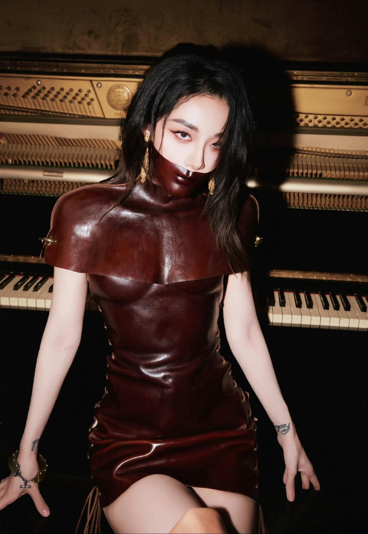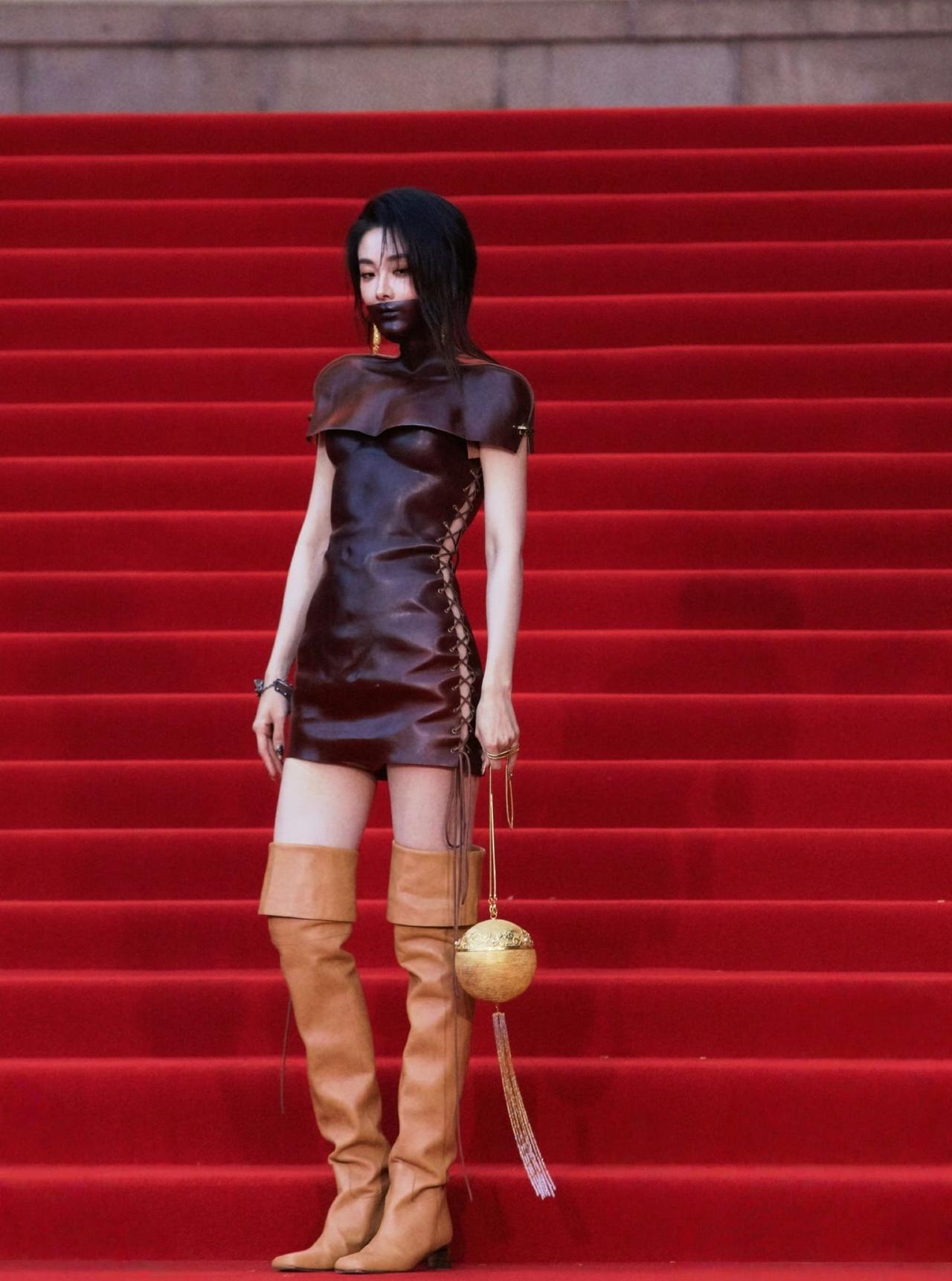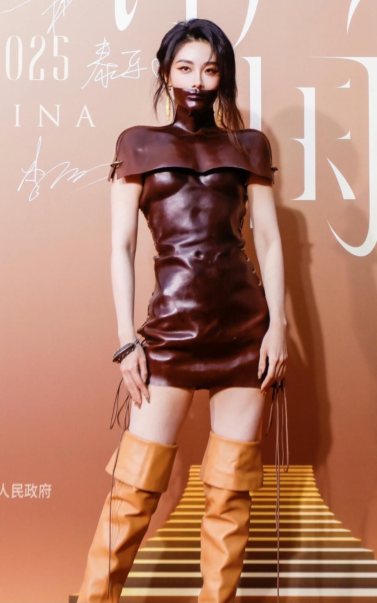 喻言这一身红毯造型,很个性啊。 一身暗红酒棕色的皮质紧身包臀裙。 同材质的皮质面罩直接遮住下半张脸,只露出一双眼睛。 那种又神秘又带攻击性的氛围感,直接隔着屏幕扑面而来。 更离谱的是,衣服上居然还有肚脐眼的设计。 它根本不是普通的皮裙,是那种像第二层皮肤一样,完完全全贴合身体曲线的极致剪裁。 你们敢信吗? 这条裙子贴身到,连肚脐眼的轮廓都给你精准设计、清清楚楚勾勒出来了。 不是那种硬勒出来的紧绷感,是顺着腰腹、顺着身材的每一寸线条走,把女生的身材曲线拿捏得死死的。