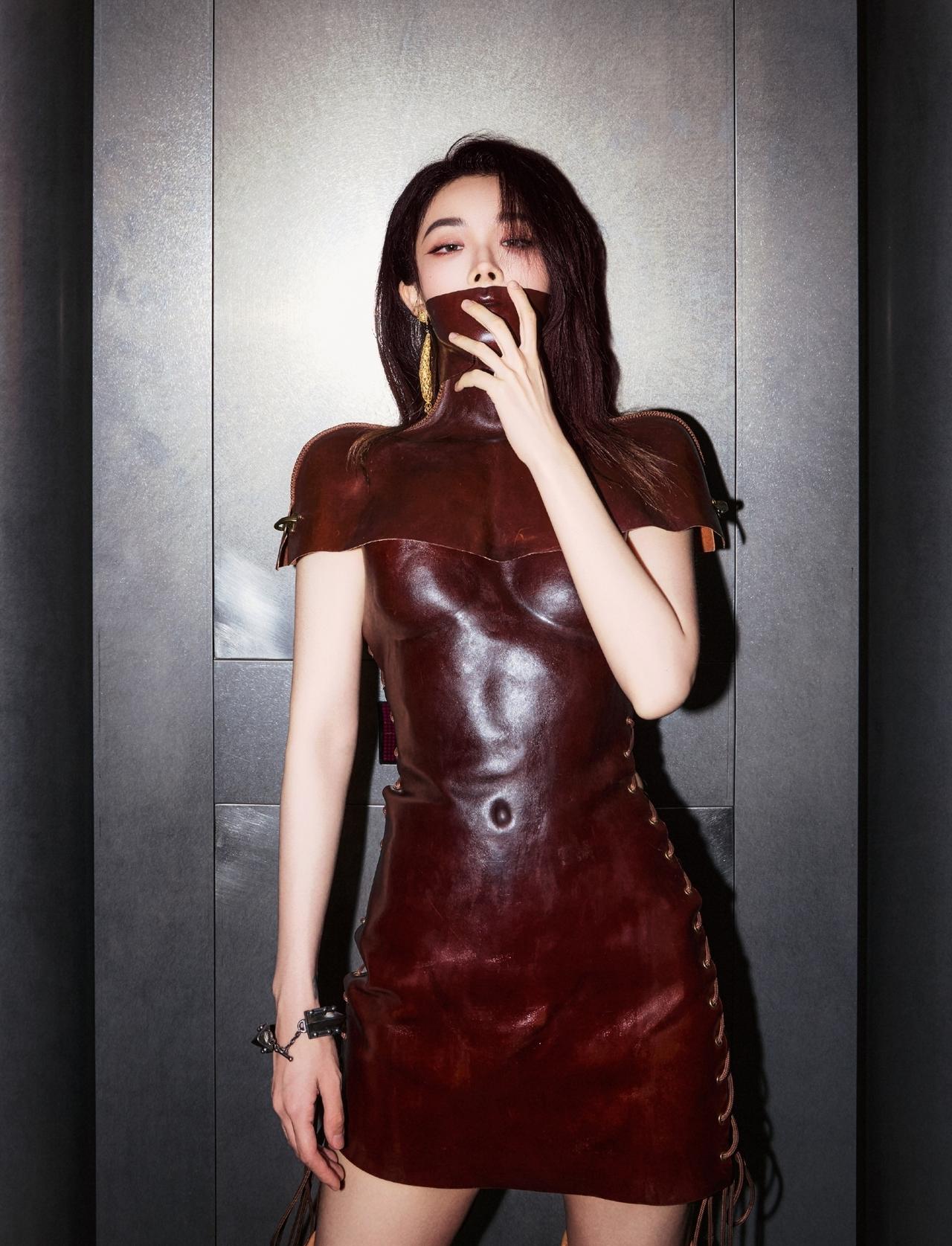 喻言这一身红毯造型,很个性啊。 一身暗红酒棕色的皮质紧身包臀裙。 同材质的皮质