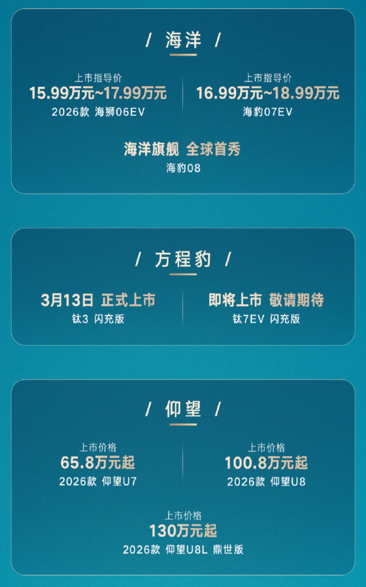 比亚迪昨晚发布会给出的信息,实在是太多太炸裂了。 第二代刀片电池及闪充、单枪1500kW的充电桩、26年底还将建成20000座闪充站; 新设计的这个悬挂充电桩,对于使用体验也确实更加友好,不落地,杜绝低素质的人冲完随手丢,同时再取放的时候也更加顺手; 对于品质技术也非常有信心,服务政策加码,提升了第二代刀片电池的质保政策;同时首批搭载第二代刀片电池的车主,都赠送1年的闪充权益; 车型方面也给了非常多,王朝家族的宋Ultra EV开启预售,15.5万起;大唐亮相,2+2+3 的七座布局、后轮转向等,上半年上市; 新款的腾势Z9GT 续航破1000公里,售价26.98万起; 海洋网海狮06EV 15.99万起,海豹07EV 16.99万起; 方程豹的钛3闪充版、钛7EV闪充版也都要陆续上市; 新款的仰望U7 65.8万起,仰望U8 100.8万起,U8L 130万起。 技术全面的进阶,服务政策加码,车型覆盖范围再一步加大,价格又更便宜了。2026年这才3月,新能源汽车行业的发挥空间,就被迪子给狠狠的占领了一波,太狠了。【来自懂车帝车友圈】