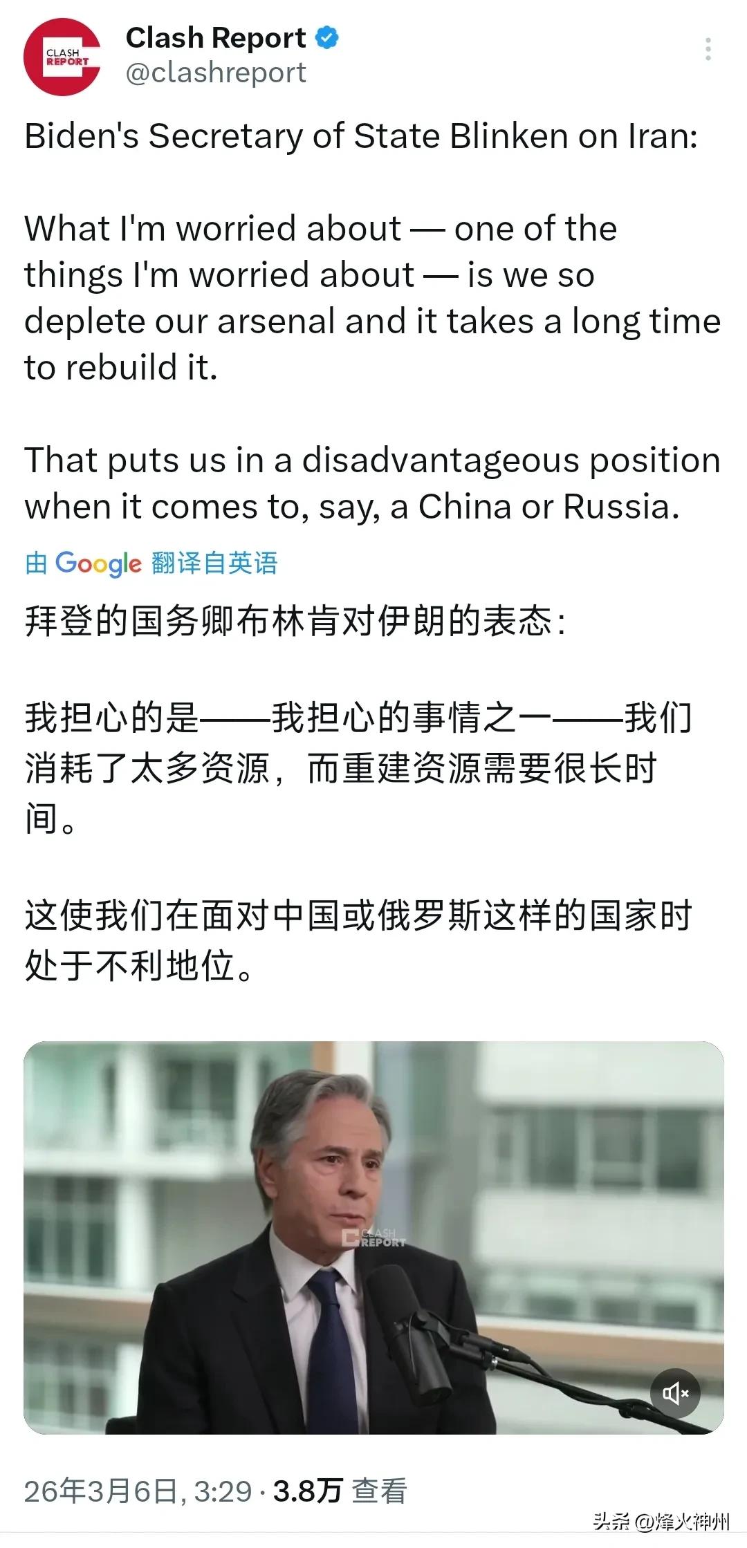 美国前国务卿布林肯今天(北京时间3月6日)接受采访时谈到伊朗问题:“我担心的一点是,我们的武器库消耗过大,而重建需要耗费漫长时间。这会让我们在面对中国或俄罗斯等国家时,陷入不利境地。” 评几句: 布林肯公开担忧美国在中东消耗过大、武器库告急,恐在中俄面前陷入劣势,这番话彻底撕下美国“维护和平”的伪装,暴露其满脑子霸权对抗的真实心态。 美国在中东狂轰滥炸,用天价导弹拦截廉价无人机,本就是得不偿失的消耗战。布林肯焦虑的从来不是地区和平与民生,而是军火耗尽后,无法继续对中俄围堵打压。 布林肯的警告,恰恰证明单边主义、军事扩张早已走投无路。美国真正的危机从不是中俄,而是沉迷霸权、穷兵黩武带来的自我消耗。
